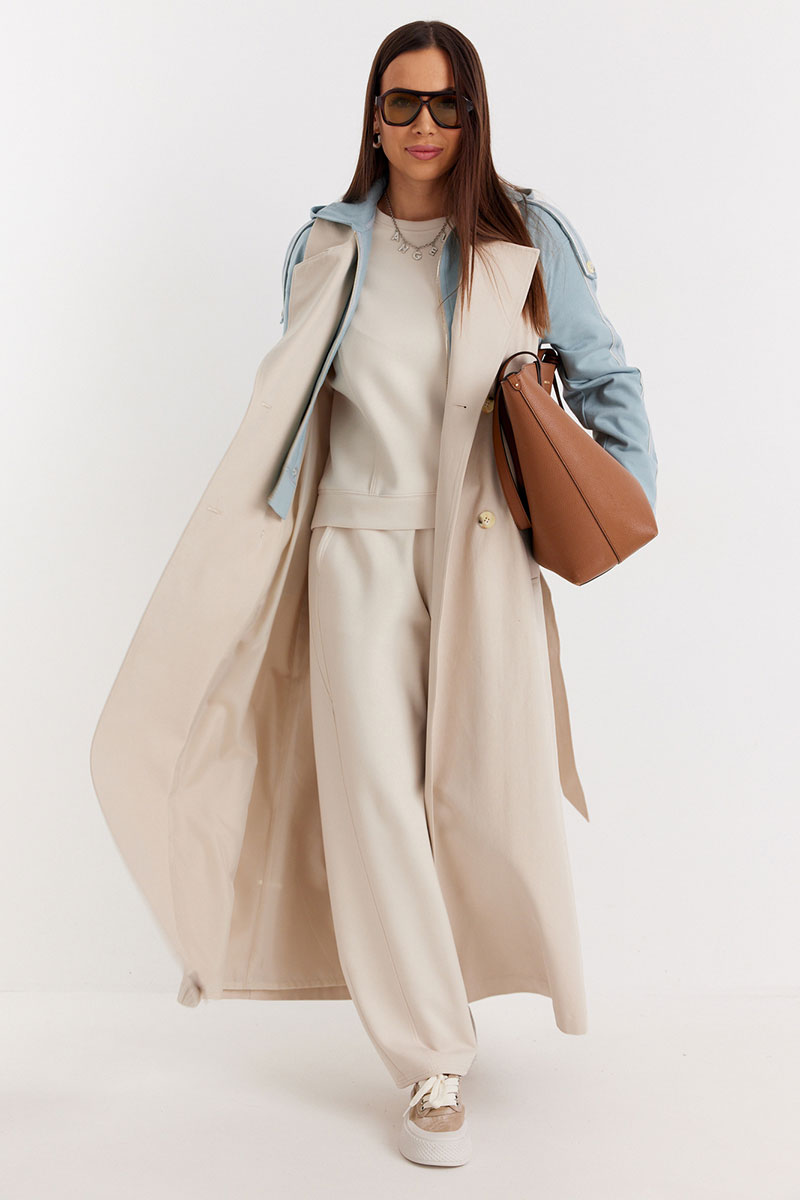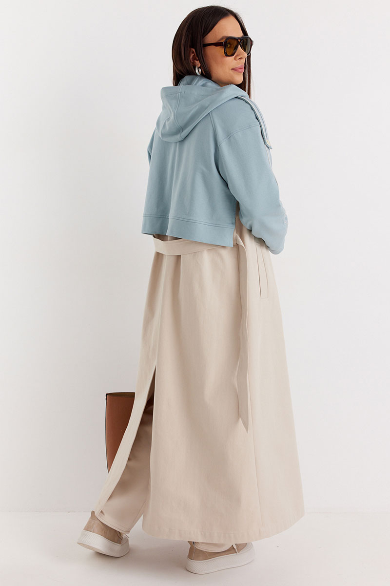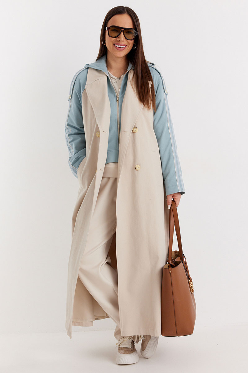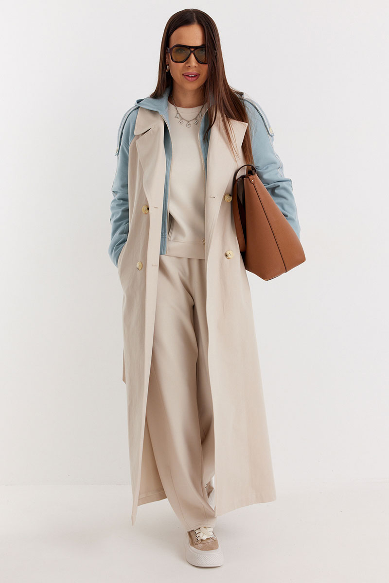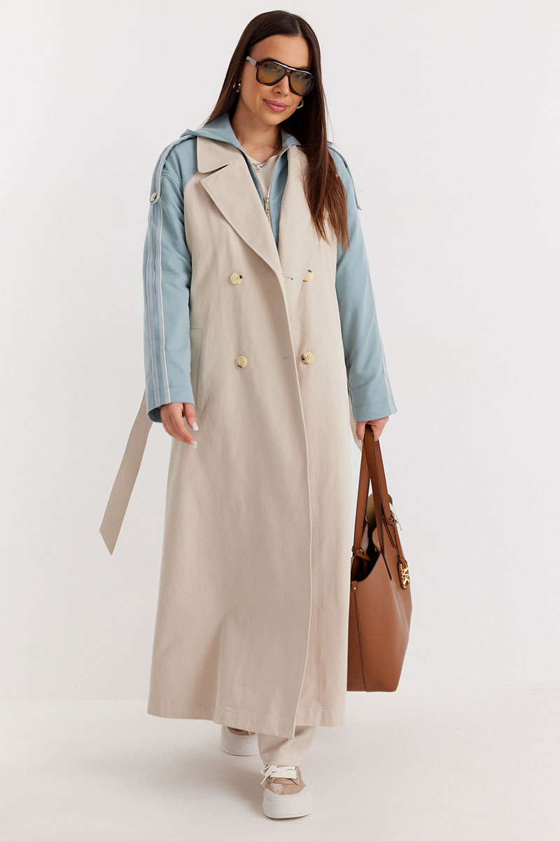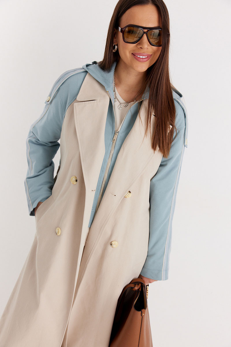 Невероятно стильный двубортный тренч классического  свободного кроя, на подкладке. Рукава и отлетная спинка выполнены из комфортного трикотажного футера.  Тренч дополнен съемной манишкой с капюшоном, выполненной из того же трикотажного футера. Центральная застежка на пришивные пуговицы. Притален за счет съемного пояса, выполненного из основной ткани.  По бокам расположены удобные карманы.