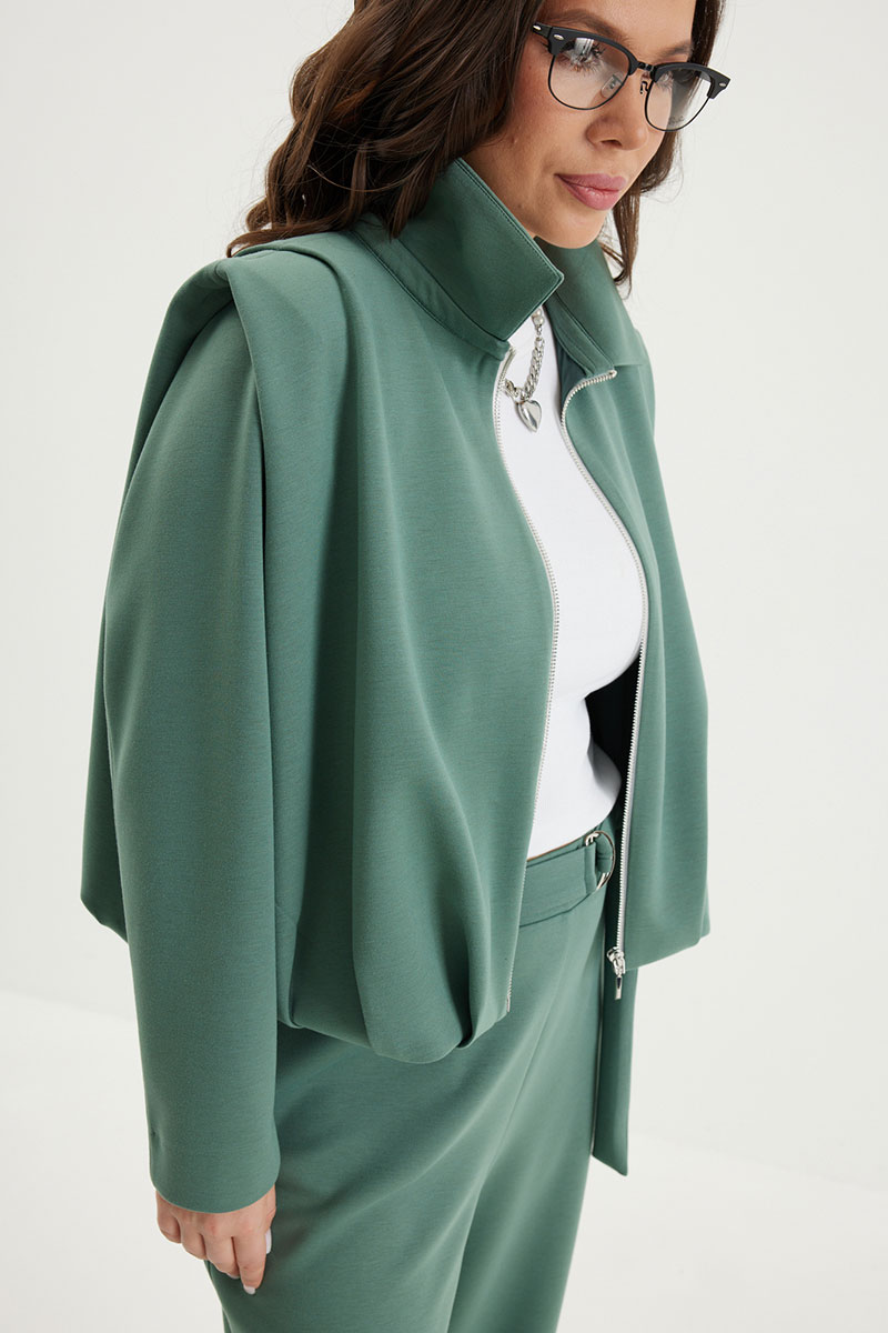 Лёгкий и в то же время выразительный трикотажный костюм в спокойном шалфейно-зелёном оттенке — идеальный баланс уюта и современного шика. Укорочённый бомбер на молнии с мягким воротником и слегка объёмными рукавами создаёт расслабленный, но отшлифованный силуэт, а широкие брюки на резинке со средней посадкой и декоративным поясом на D‑кольце добавляют образу структурности и длины. Плотный, гладкий трикотаж красиво драпируется и приятно прилегает к телу, обеспечивая свободу движений и ощущение комфорта в течение всего дня. Такой комплект универсален: он стильно смотрится в повседневном гардеробе с кедами и белой майкой, а при необходимости легко оживит образ аксессуарами и лодочками для более делового акцента. Идеальный выбор для тех, кто ценит лаконичность линий, продуманную функциональность и мягкую палитру.