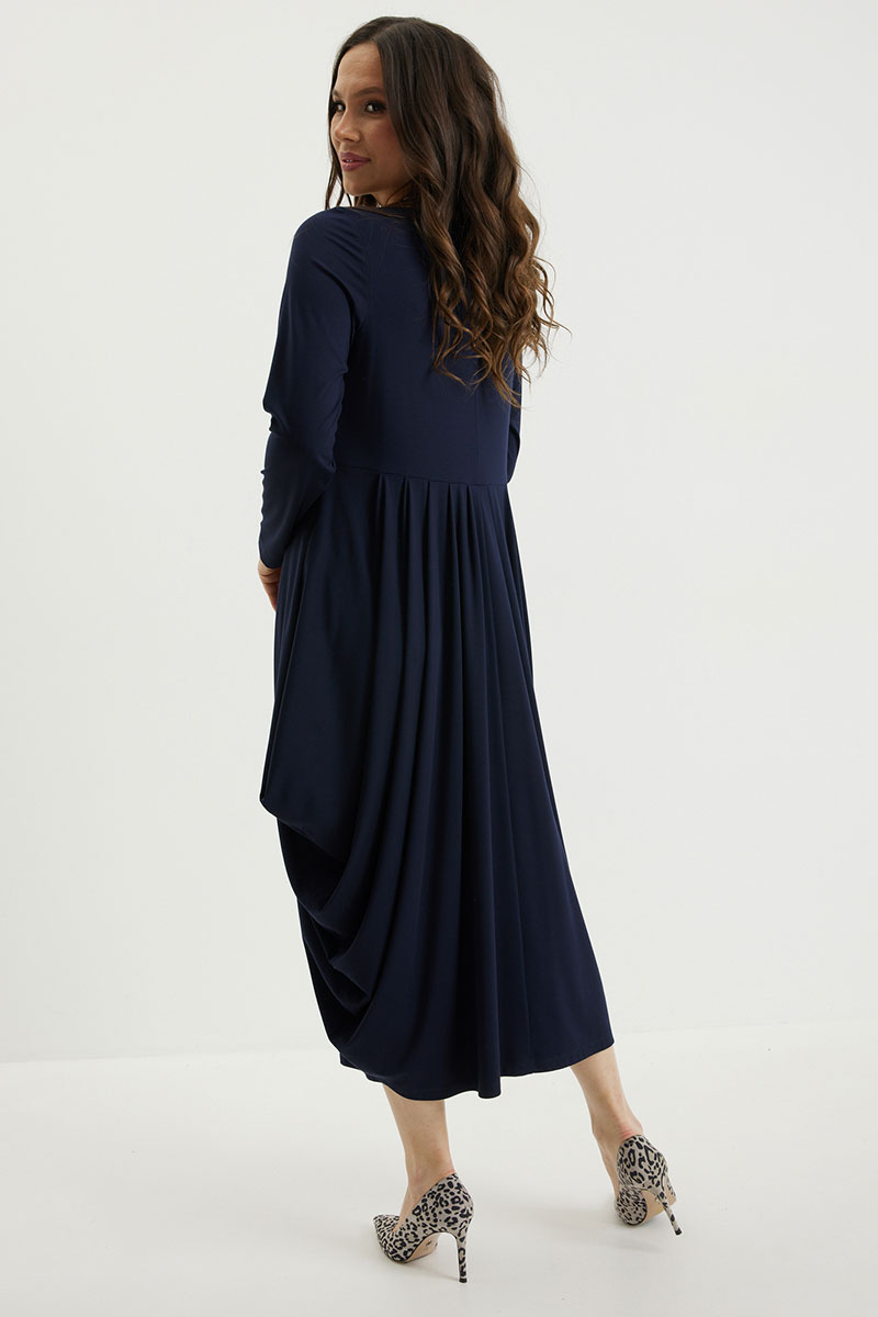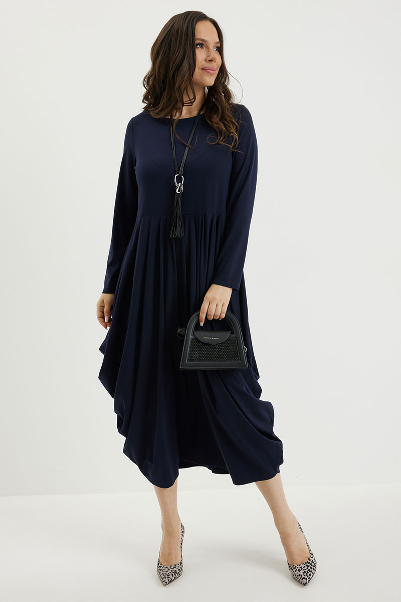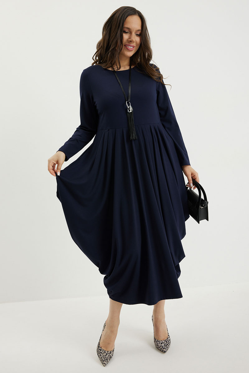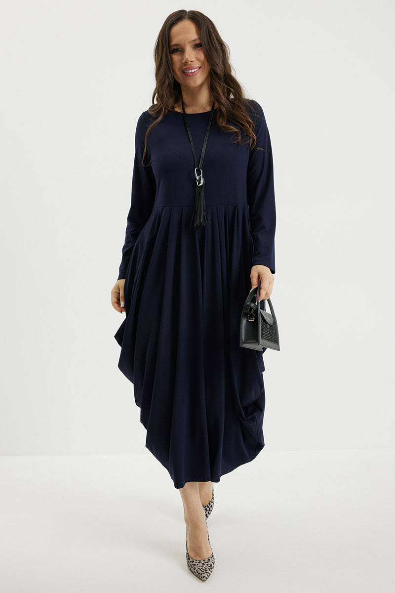 Безумно стильное и элегантное платье в благородном синем оттенке. Верх платья базовый с втачным длинным рукавом и округлой горловиной. По талии платье притачное с чуть завышенной линией талии. Низ платья  собран по талии в красивые складки, что создает необыкновенный струящийся объем, который укладывается в оригинальный силуэт. Платье выполнено из тонкого гладкого трикотажного полотна.