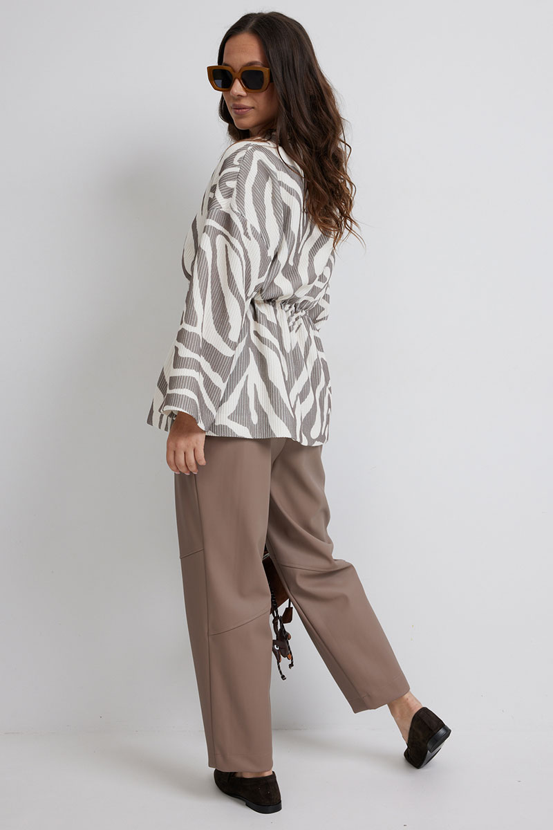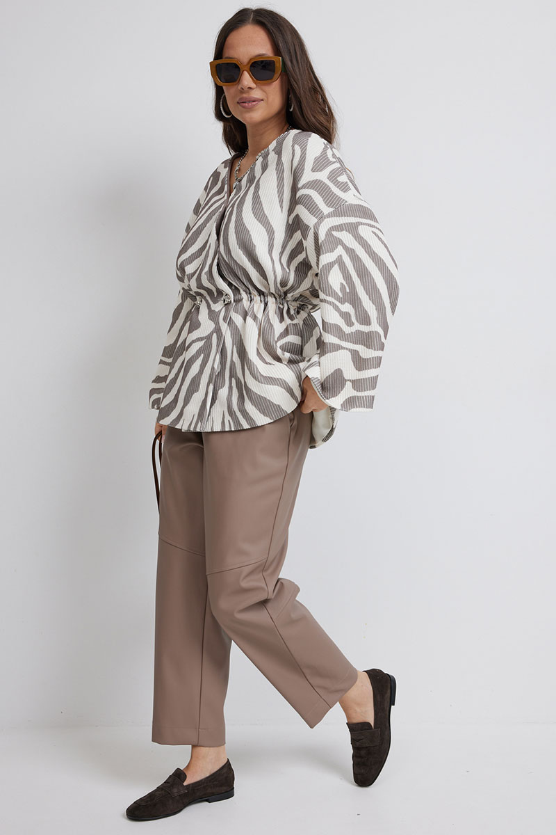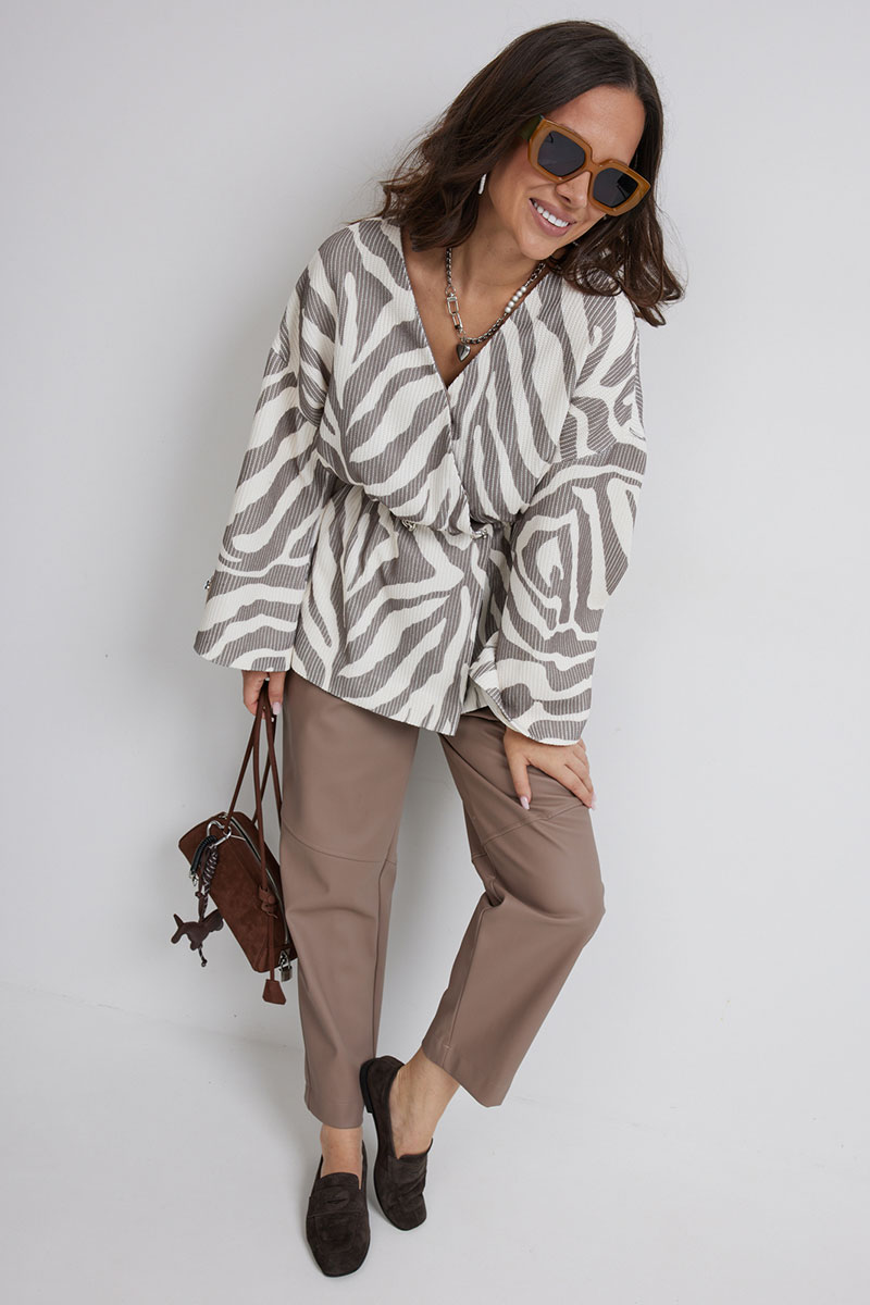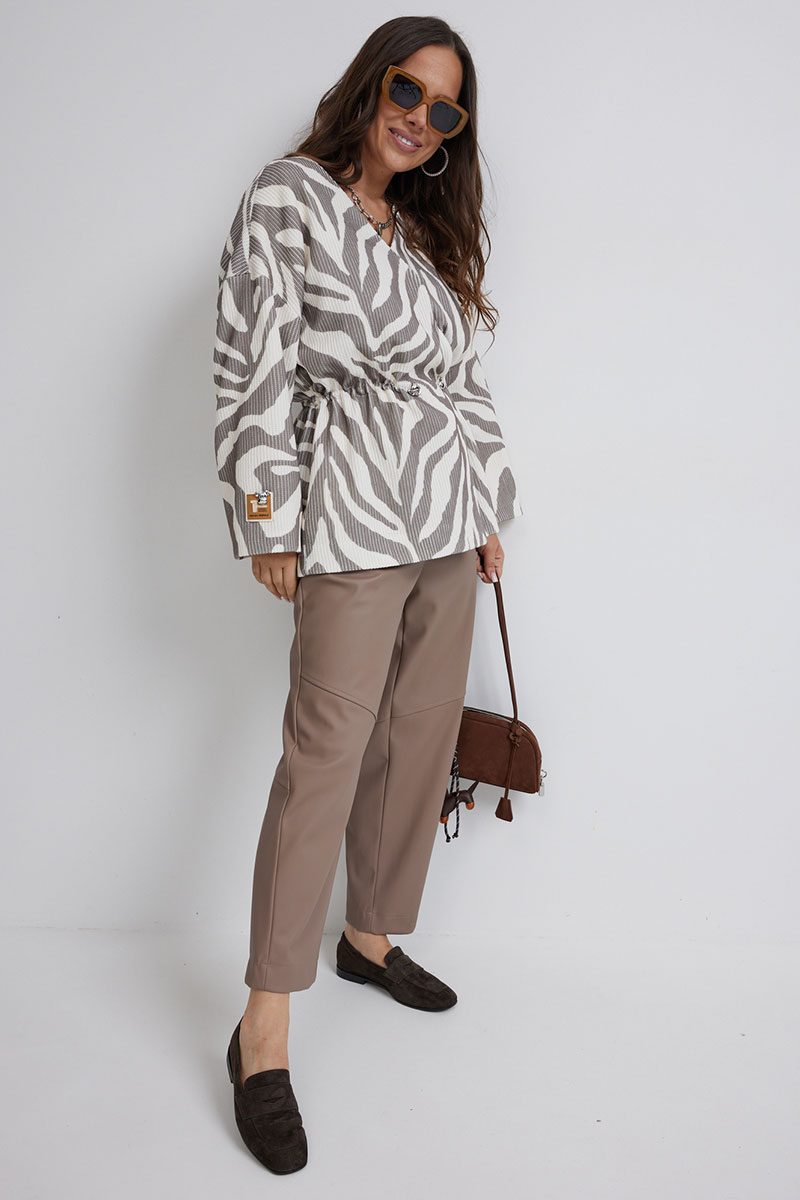 Стильный комплект из жакета-кимоно и брюк из мягкой и комфортной эко кожи. Двубортный жакет свободного кроя over с застежкой на красивые пришивные пуговицы. По талии скрытая кулиска с эластичной тесьмой, за счет которой можно поменять образ и приталить жакет. Жакет на подкладке, выполнен из фактурой ткани с animal принтом.  Линия плеча слегка спущена. Рукав полной длины, широкий. Жакет дополнен удобными боковыми карманами. Брюки классического кроя , слегка заужены книзу. Притачной пояс дополнен эластичной тесьмой. Изнанка брюк выполнена из комфортной вискозы. Застежка гульфик на пришивную пуговицу и молнию. Брюки дополнены удобными карманами.