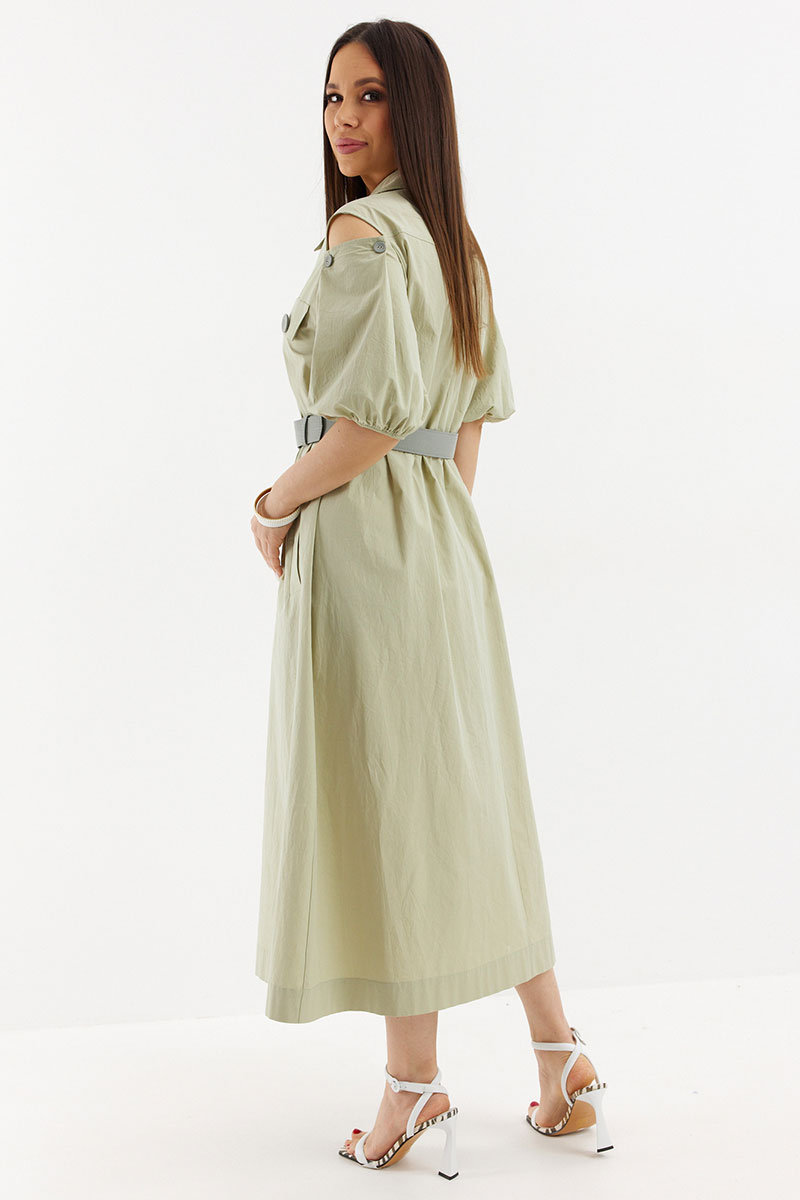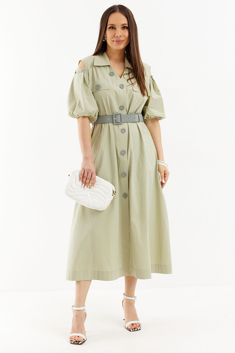 Легкое и воздушное платье из натуральной хлопковой ткани средней плотности с легким эффектом жатки, которая не просвечивает и прекрасно держит форму. Платье А-образного силуэта с центральной застежкой на пришивные пуговицы. Дополнено съемным ремнем с пряжкой. Горловина обработана отложным воротником. Объемный рукав присборен на эластичную тесьму. Дополнен красивыми вырезами. Удобные карманы расположены в боковых швах.