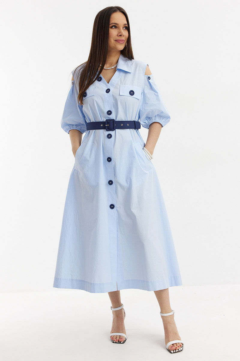 Легкое и воздушное платье из натуральной хлопковой ткани средней плотности с легким эффектом жатки, которая не просвечивает и прекрасно держит форму. Платье А-образного силуэта с центральной застежкой на пришивные пуговицы. Дополнено съемным ремнем с пряжкой. Горловина обработана отложным воротником. Объемный рукав присборен на эластичную тесьму. Дополнен красивыми вырезами. Удобные карманы расположены в боковых швах.