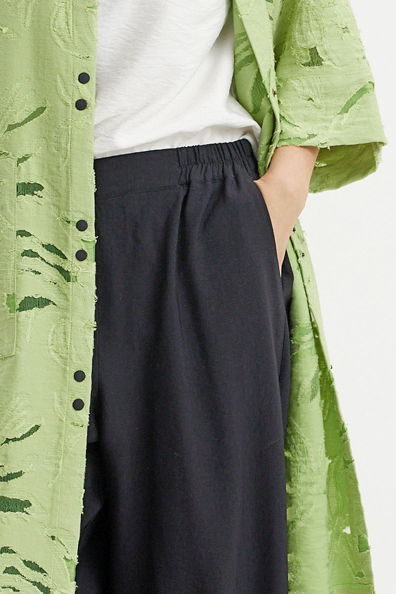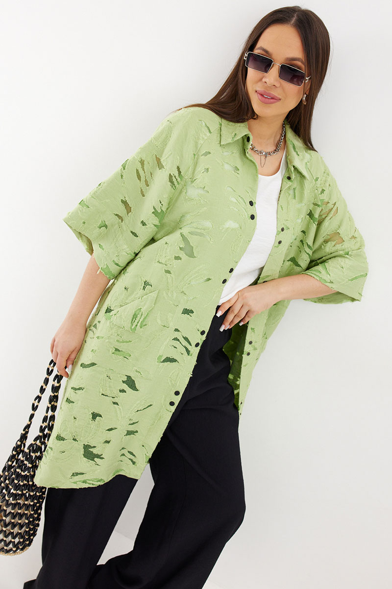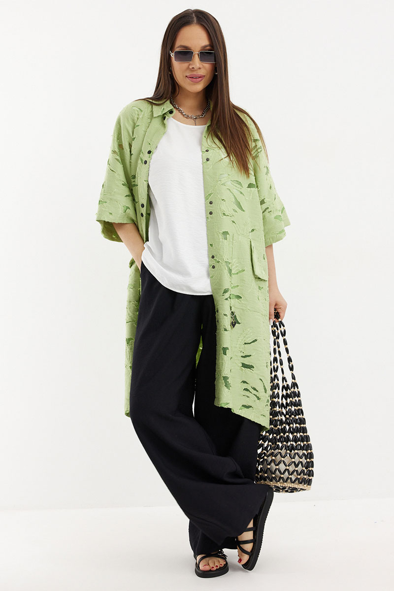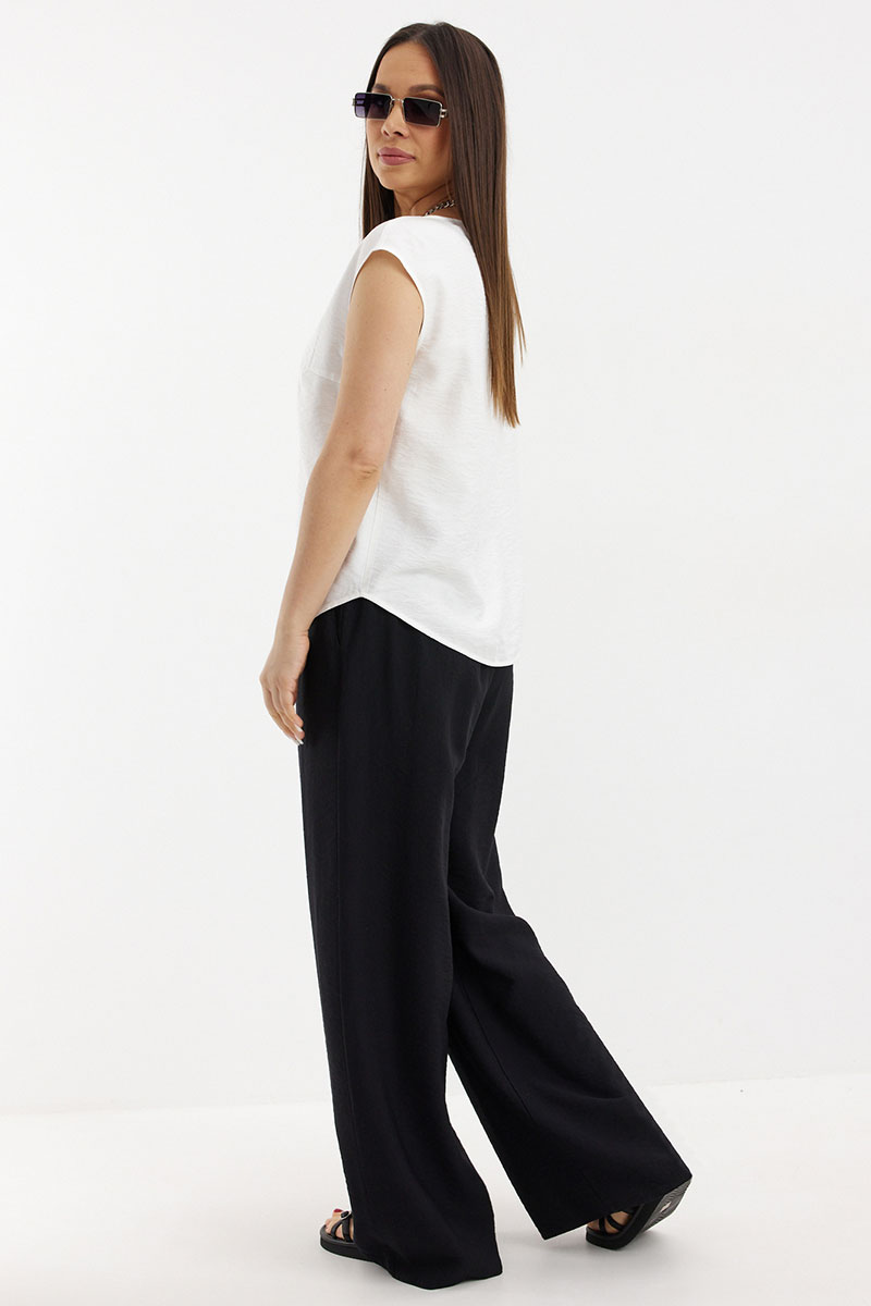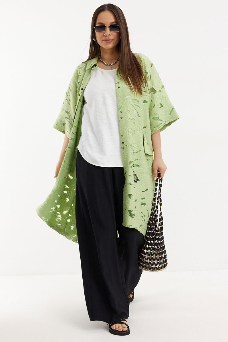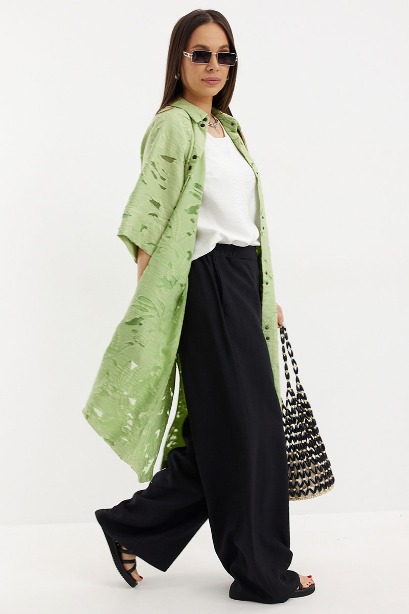 Стильный и элегантный образ из кардигана, топа и брюк. Кардиган свободного рубашечного кроя с центральной застежкой на металлические кнопки. По спинке дополнен кулиской с декоративной тесьмой. Кардиган дополнен удобными карманами. Топ свободного прямого кроя с округлой горловиной и коротким рукавом. Брюки свободного прямого кроя с притачным поясом, дополненным эластичной тесьмой.