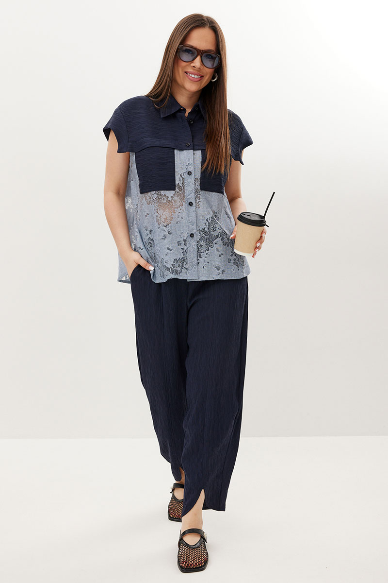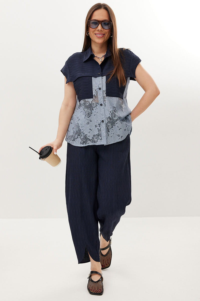 Стильный образ из блузы и брюк. Блуза свободного рубашечного кроя с центральной застежкой на пуговицы. Выполнена из двух видов ткани: натуральной фактурной ткани и нежного кружева. Брюки свободного кроя с притачным поясом, дополненным эластичной тесьмой. Посадка средняя. По спинке красивая кокетка. Брюки слегка заужены книзу с красивым вырезом. Удобные боковые карманы добавляют комфорта.