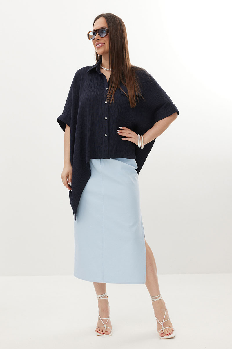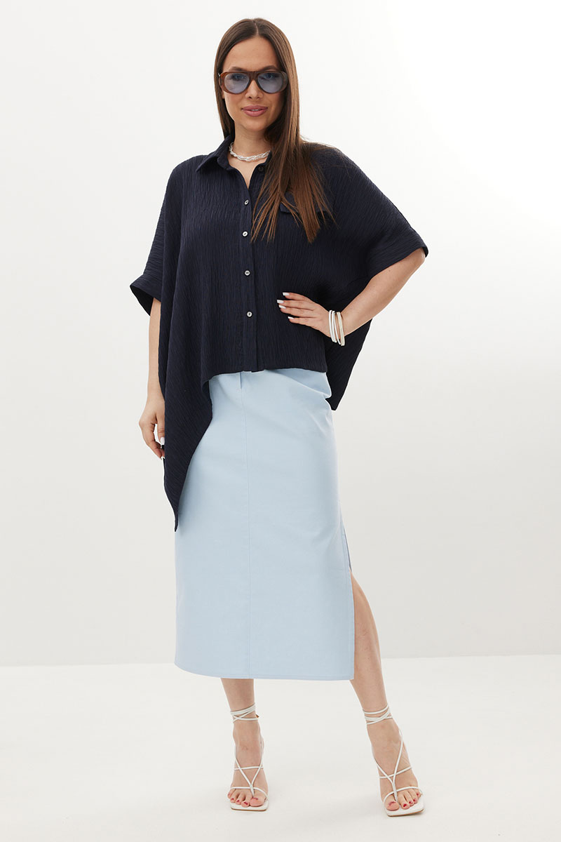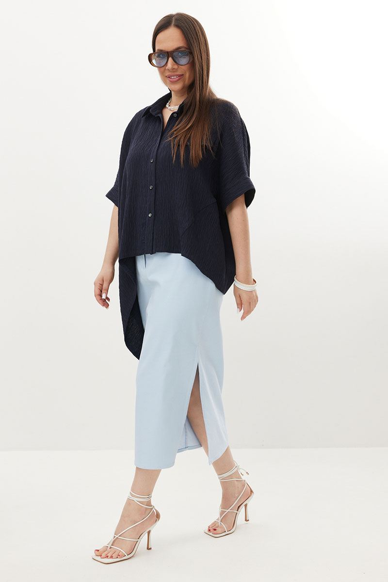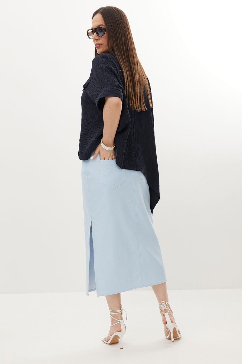 Стильный комплект из объемной блузы и джинсовой юбки. Блуза свободного рубашечного кроя с асимметричным низом, с центральной застежкой на пуговицы. Выполнена из натуральной фактурной ткани. Горловина обработана отложным воротником. Рукава цельнокроеные. Юбка прямого кроя с боковым разрезом. Выполнена из тонкого джинса нежно-голубого цвета. Юбка с притачным поясом, дополненным эластичной тесьмой. Так же есть удобные боковые и накладные задние карманы.