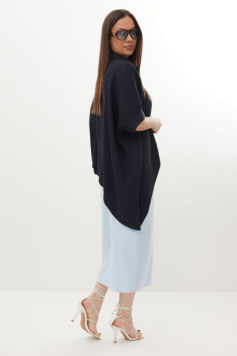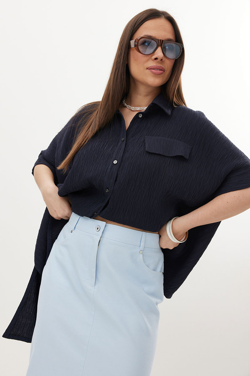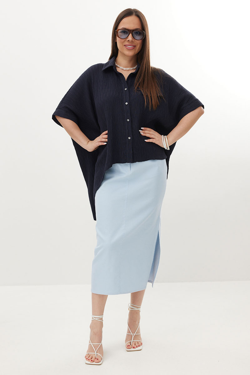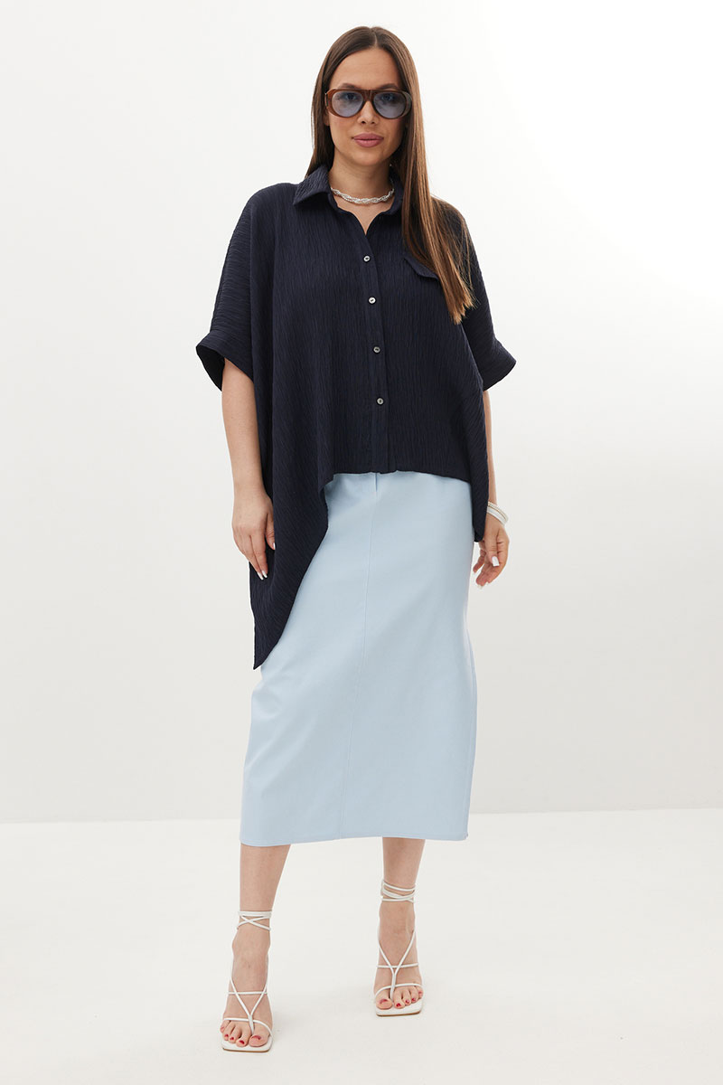 Стильный комплект из объемной блузы и джинсовой юбки. Блуза свободного рубашечного кроя с асимметричным низом, с центральной застежкой на пуговицы. Выполнена из натуральной фактурной ткани. Горловина обработана отложным воротником. Рукава цельнокроеные. Юбка прямого кроя с боковым разрезом. Выполнена из тонкого джинса нежно-голубого цвета. Юбка с притачным поясом, дополненным эластичной тесьмой. Так же есть удобные боковые и накладные задние карманы.