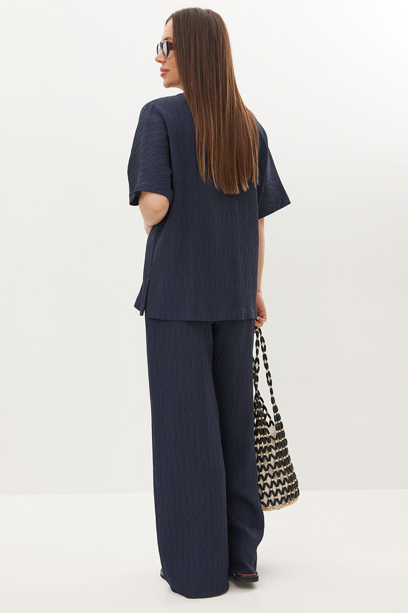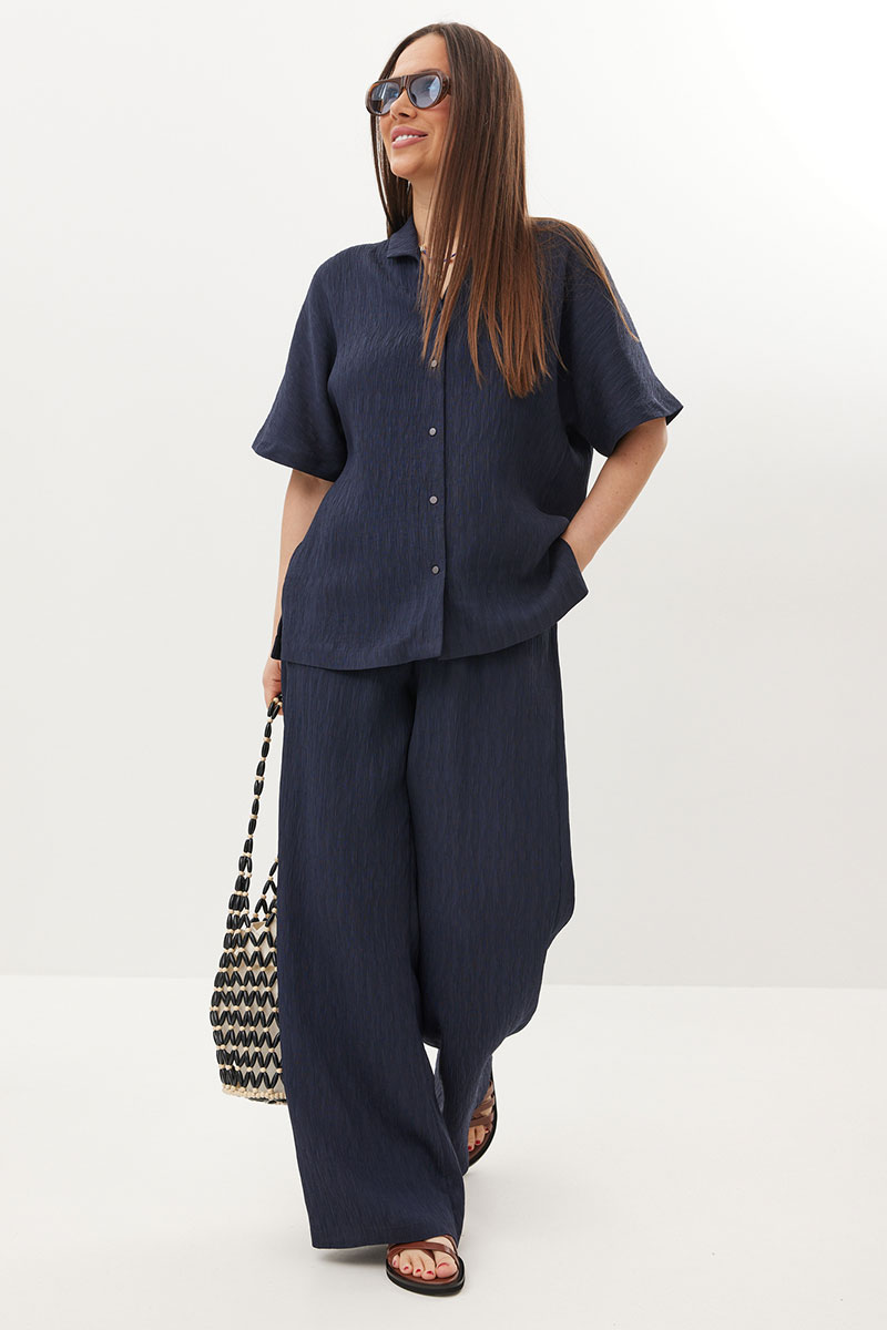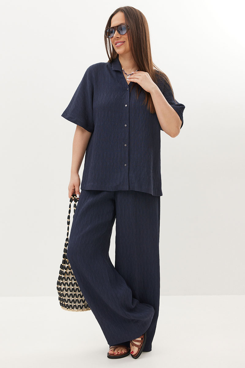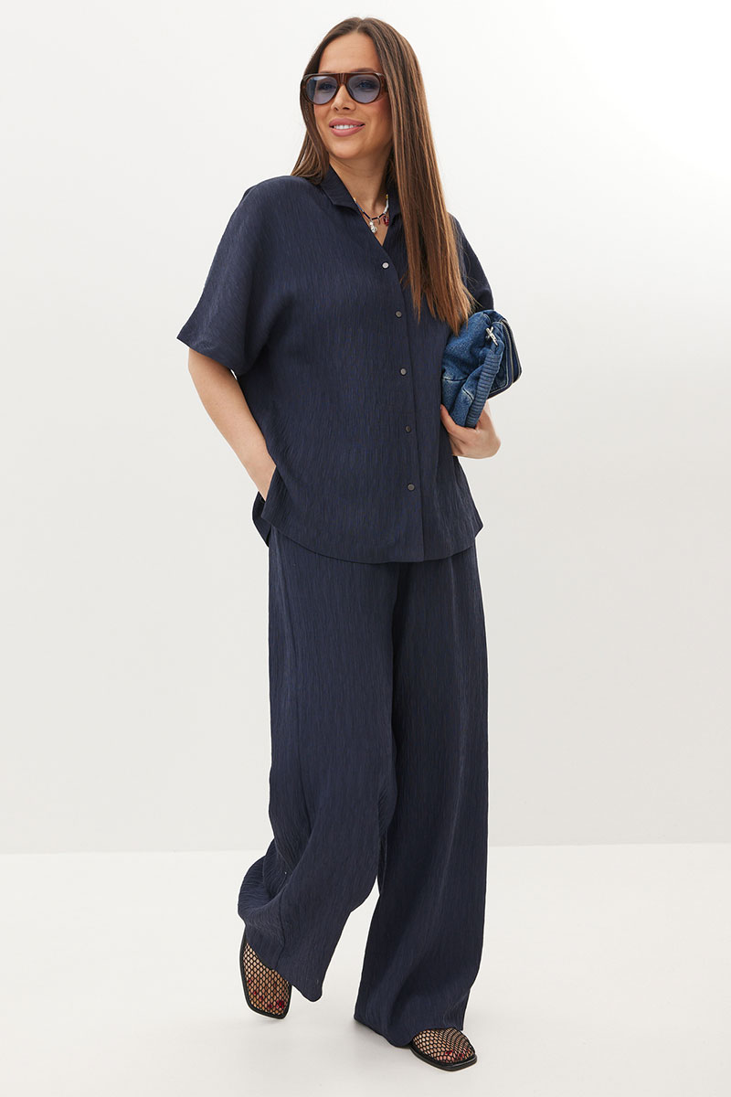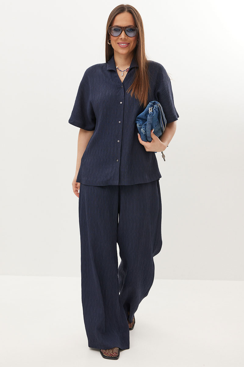 Стильный комплект из рубашки и брюк, выполненных из натуральной фактурной ткани. Рубашка свободного прямого кроя с центральной застежкой на металлические кнопки. Горловина обработана отложным воротником. Рукав цельнокроеный. Брюки прямого свободного кроя с притачным поясом, дополненным эластичной тесьмой. Посадка средняя. Дополнены удобными боковыми карманами.