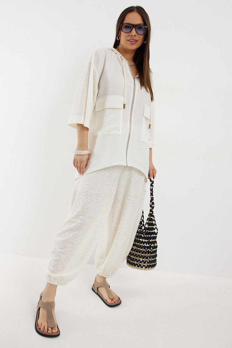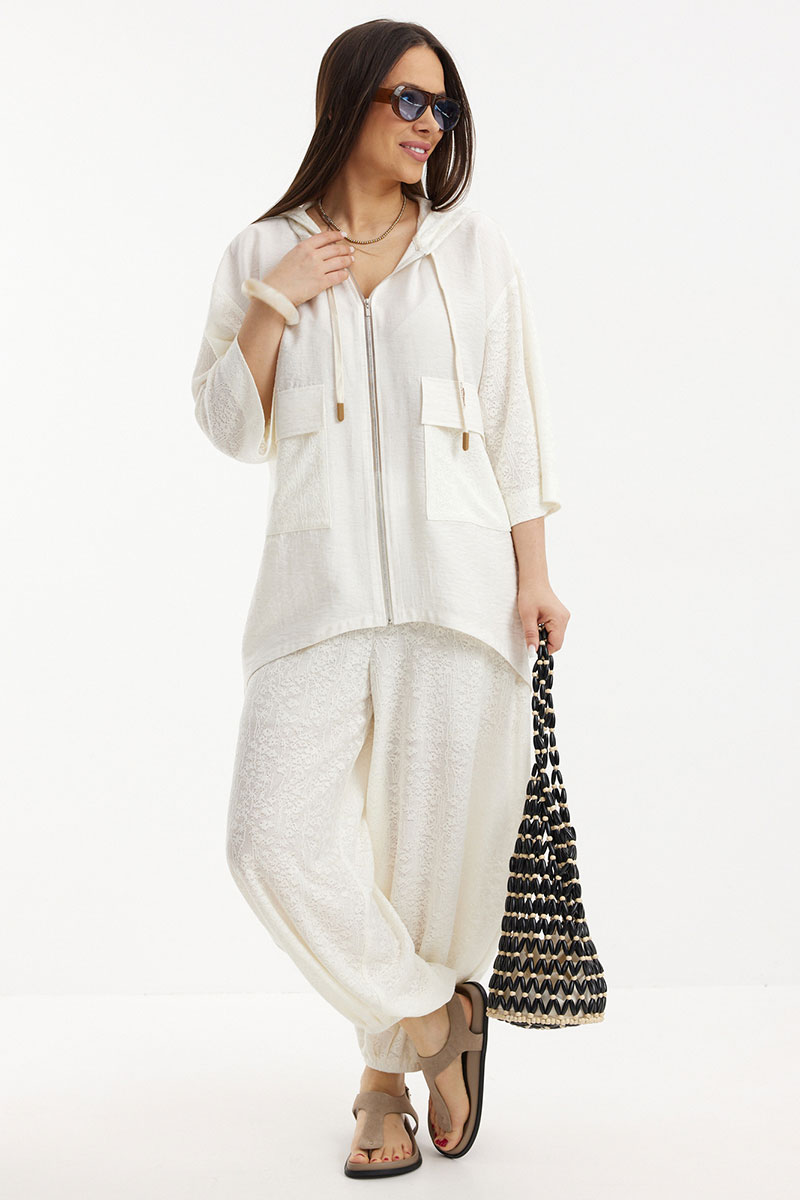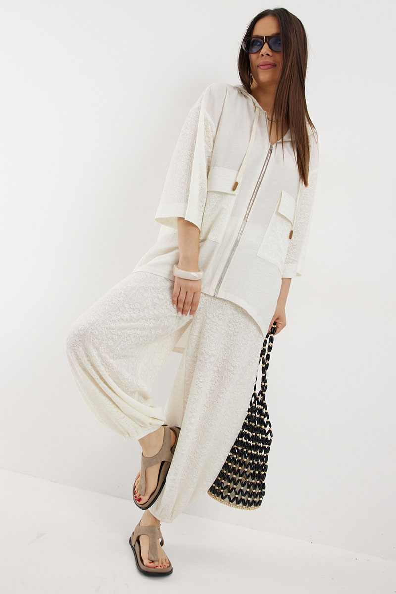 Стильный летний комплект из блузы и брюк, выполненный из ажурного трикотажного полотна в сочетании с легкой однотонной тканью. Блуза свободного кроя с центральной застежкой на молнию. Горловина обработана капюшоном. Блуза с удлиненной спинкой. Легкие и дышащие брюки-алладины свободного объемного кроя выполнены из ажурного трикотажного полотна. Дополнены притачным поясом с эластичной тесьмой. Удобные боковые карманы придают еще большего комфорта. Брюки имеют подкладку-шортики телесного цвета.