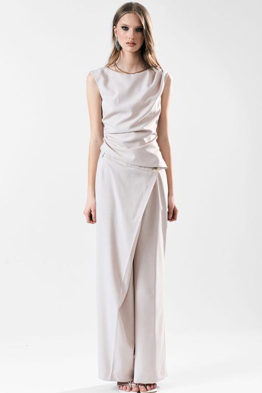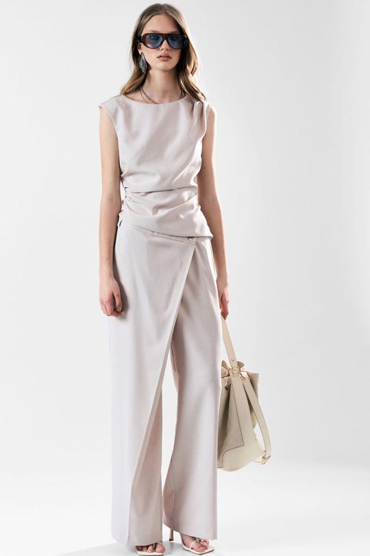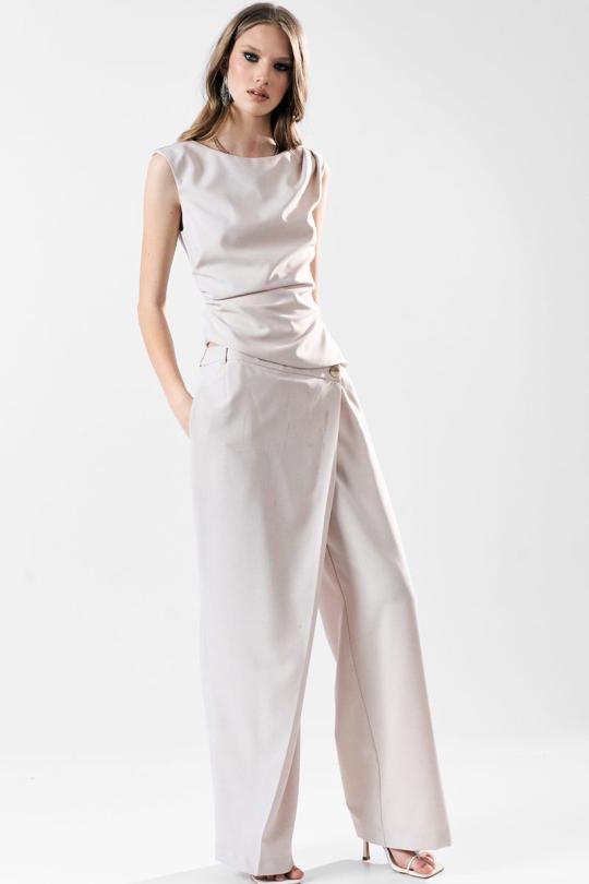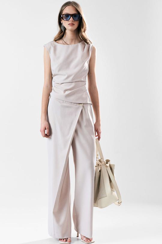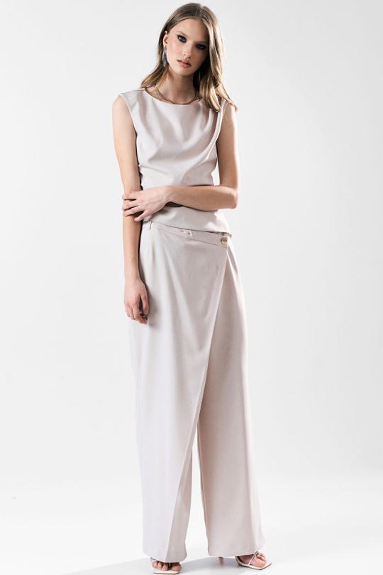 Широкие брюки с асимметричной застежкой-запахом по переду. Карманы в боковом шве. Застежка на пуговицы.