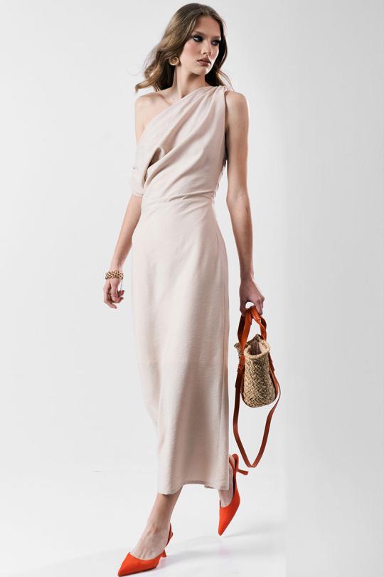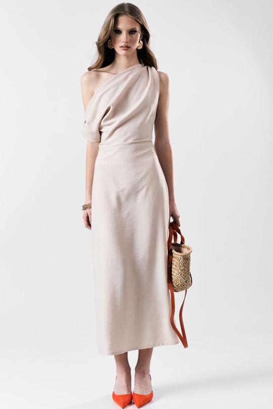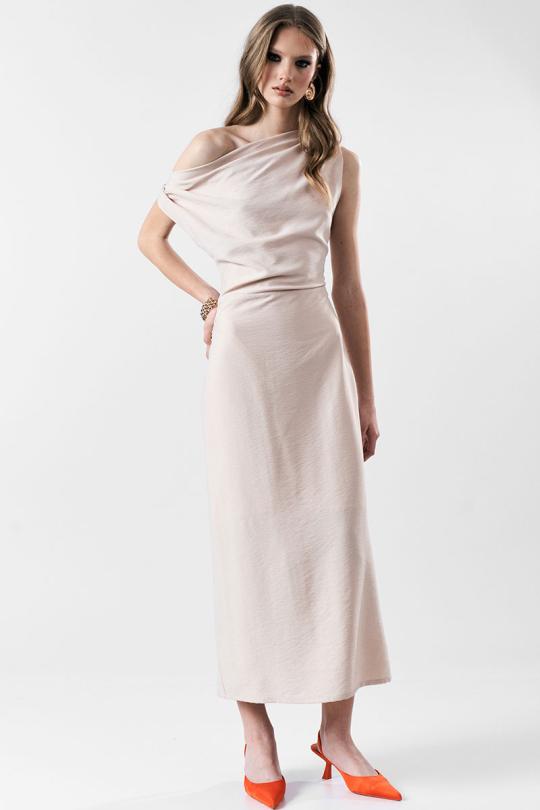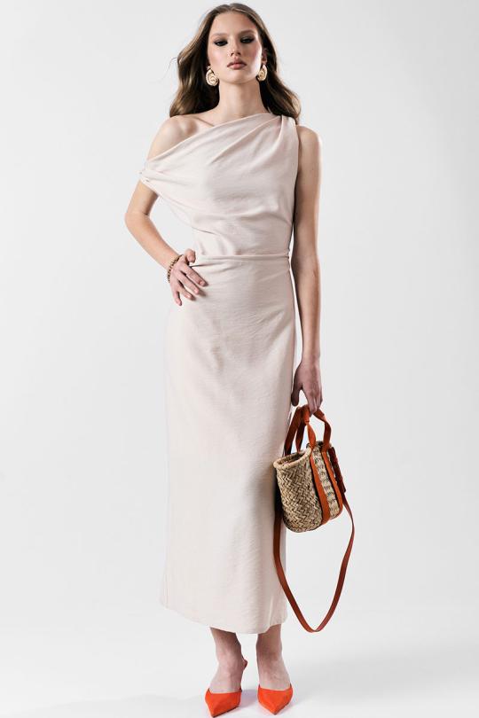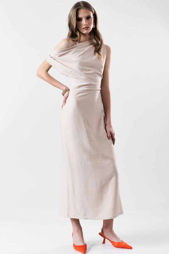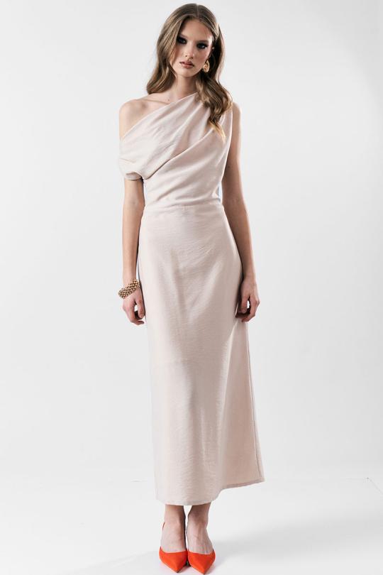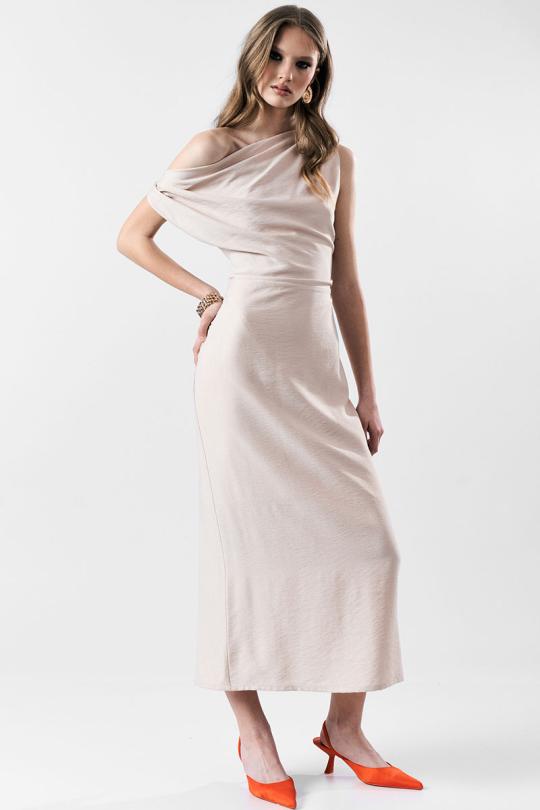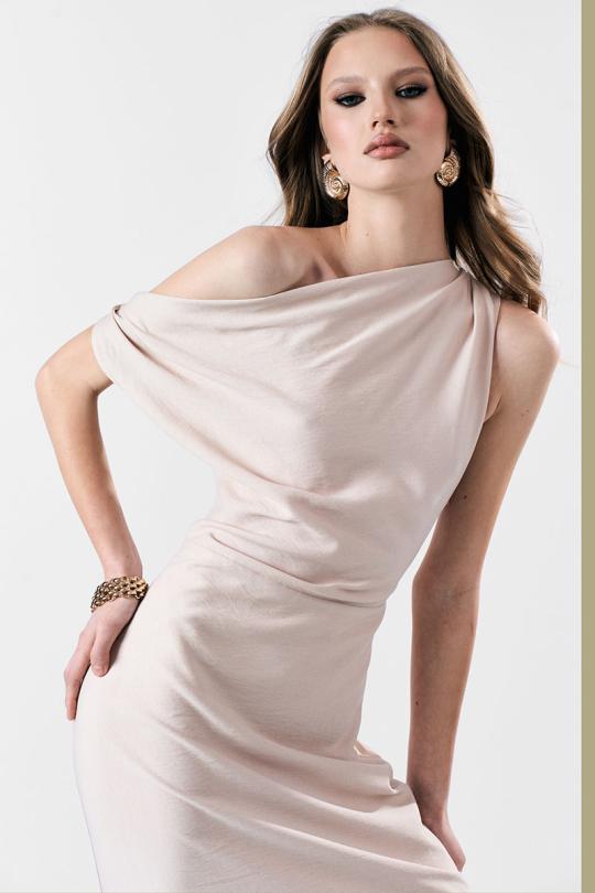 Платье прилегающего силуэта, с асимметричным вырезом горловины, длина "миди". Верхняя часть платья - отрезная. По плечевым срезам оформлены декоративные складки. Юбка с разрезом сзади.