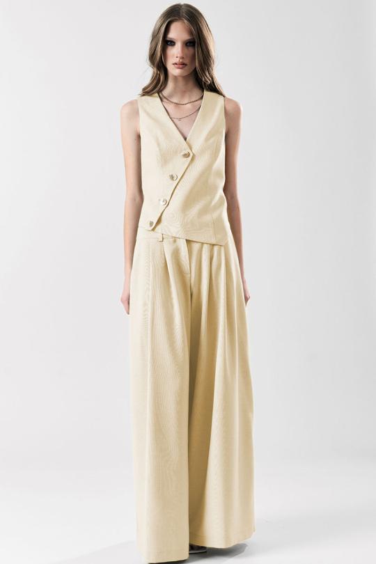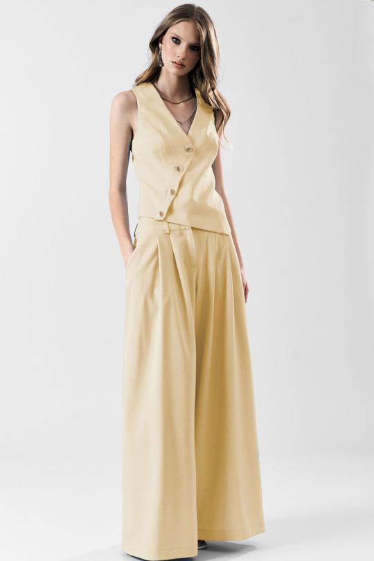 Брюки-палаццо с двумя глубокими встречными складками. Карманы в боковых швах. Сзади для лучшей посадки сделаны вытачки. Застежка на брюках крючок и молния.
