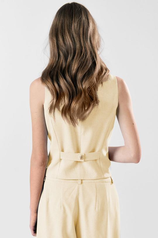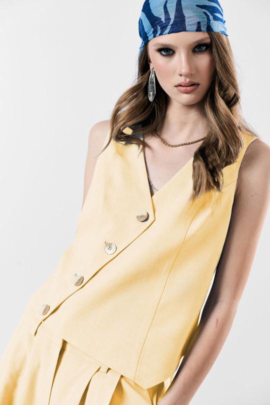 Асимметричный жилет прилегающего силуэта, длина - выше линии бедер, асимметричная линяя борта на пуговицах. Жилет на подкладке.