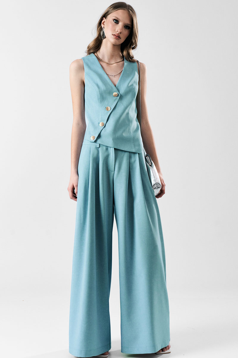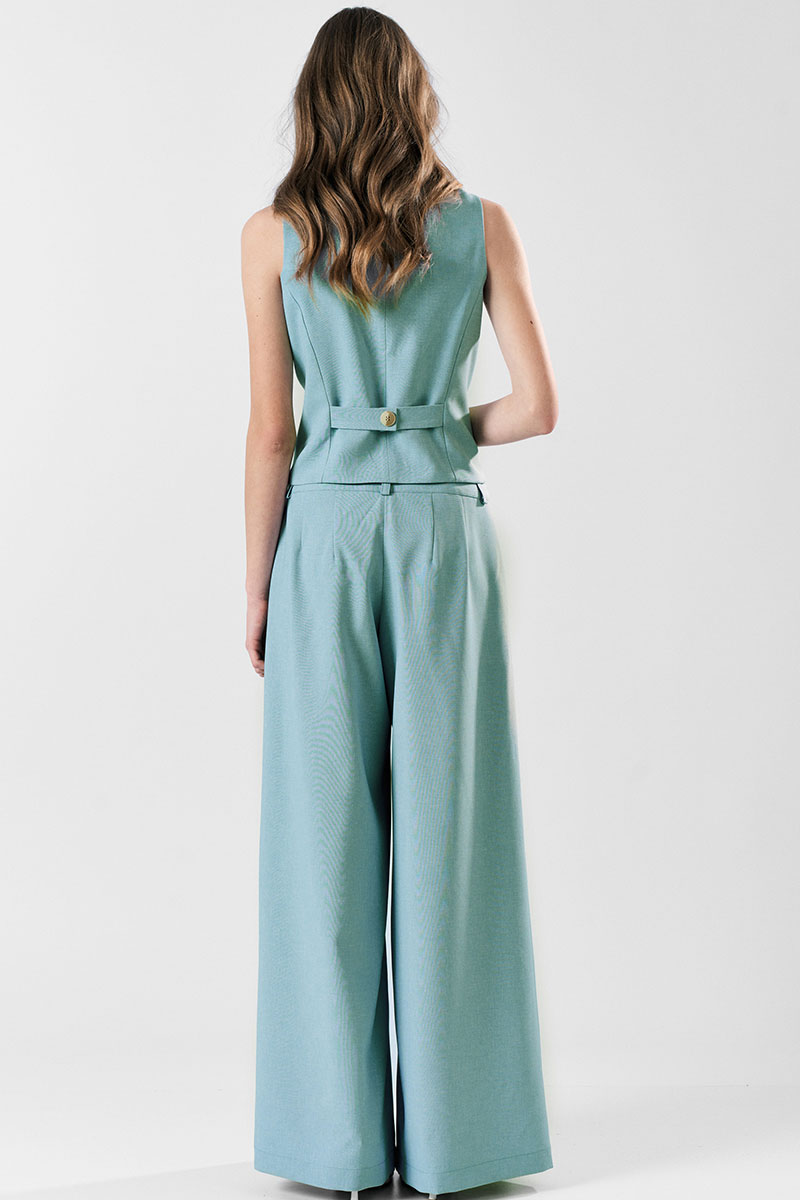 Брюки-палаццо с двумя глубокими встречными складками. Карманы в боковых швах. Сзади для лучшей посадки сделаны вытачки. Застежка на брюках крючок и молния.
