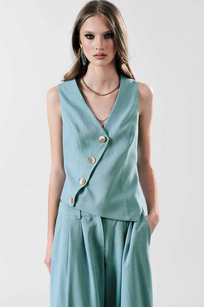 Асимметричный жилет прилегающего силуэта, длина - выше линии бедер, асимметричная линяя борта на пуговицах. Жилет на подкладке.