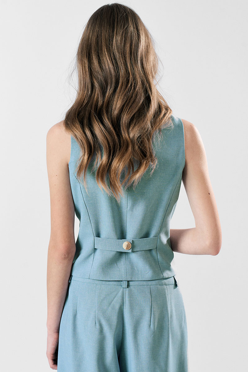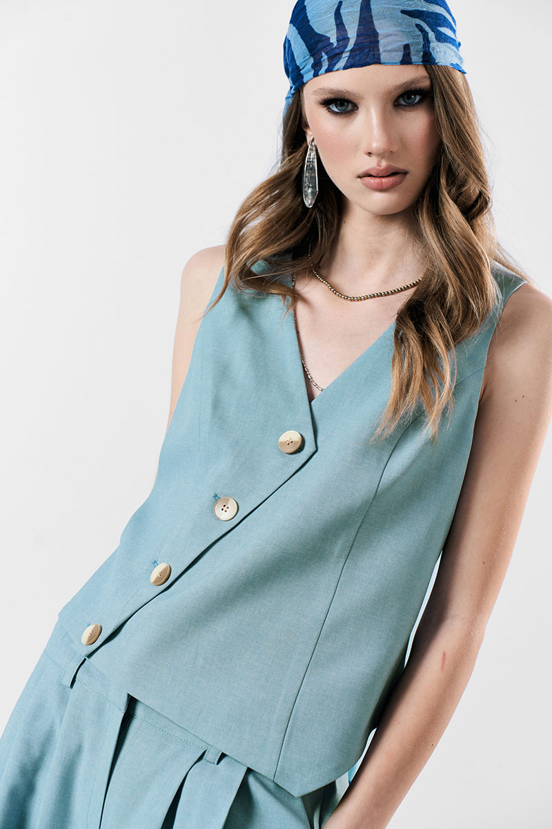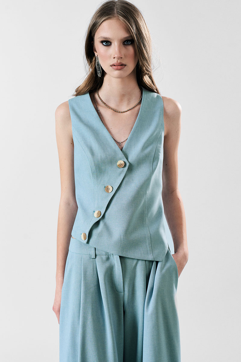Асимметричный жилет прилегающего силуэта, длина - выше линии бедер, асимметричная линяя борта на пуговицах. Жилет на подкладке.