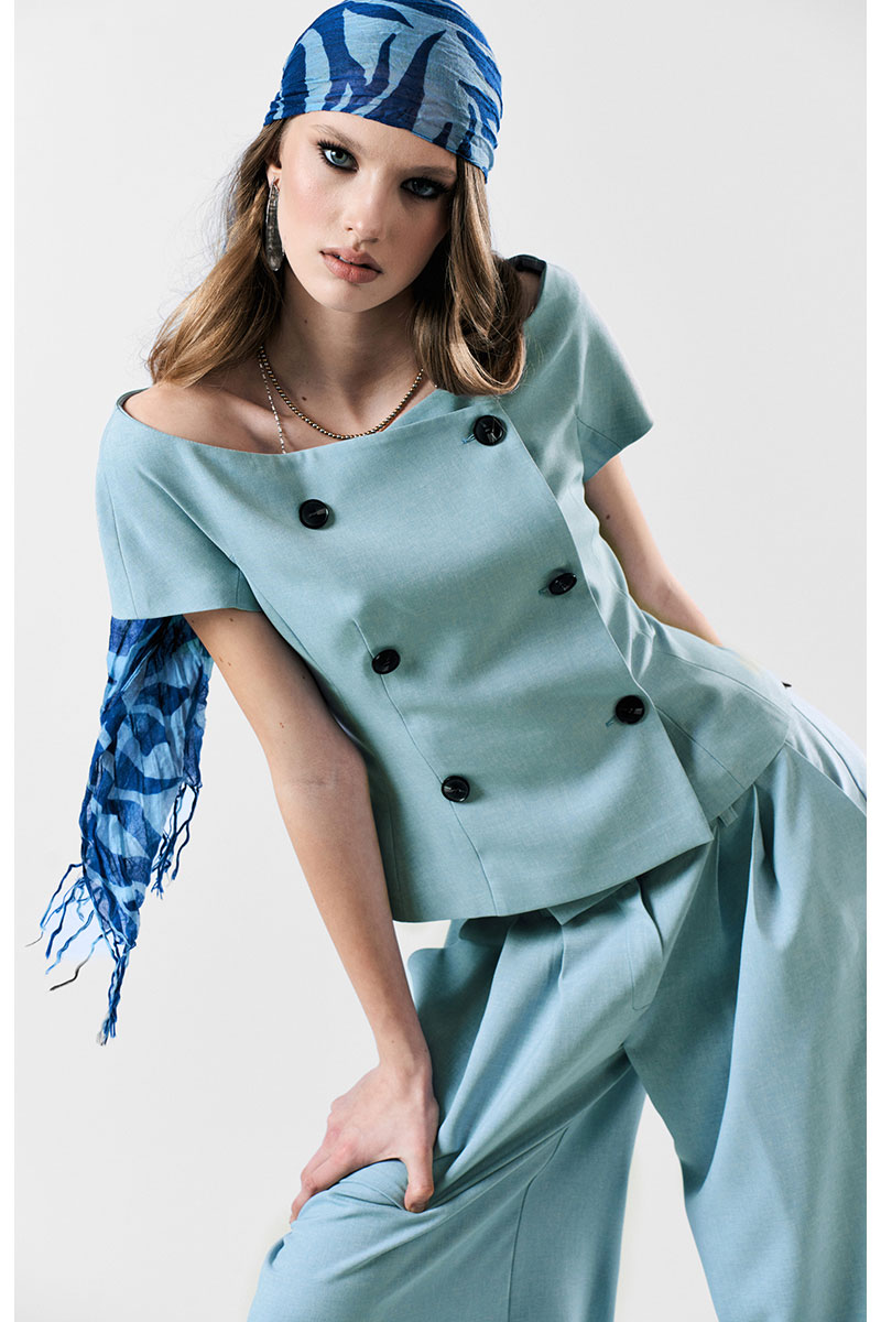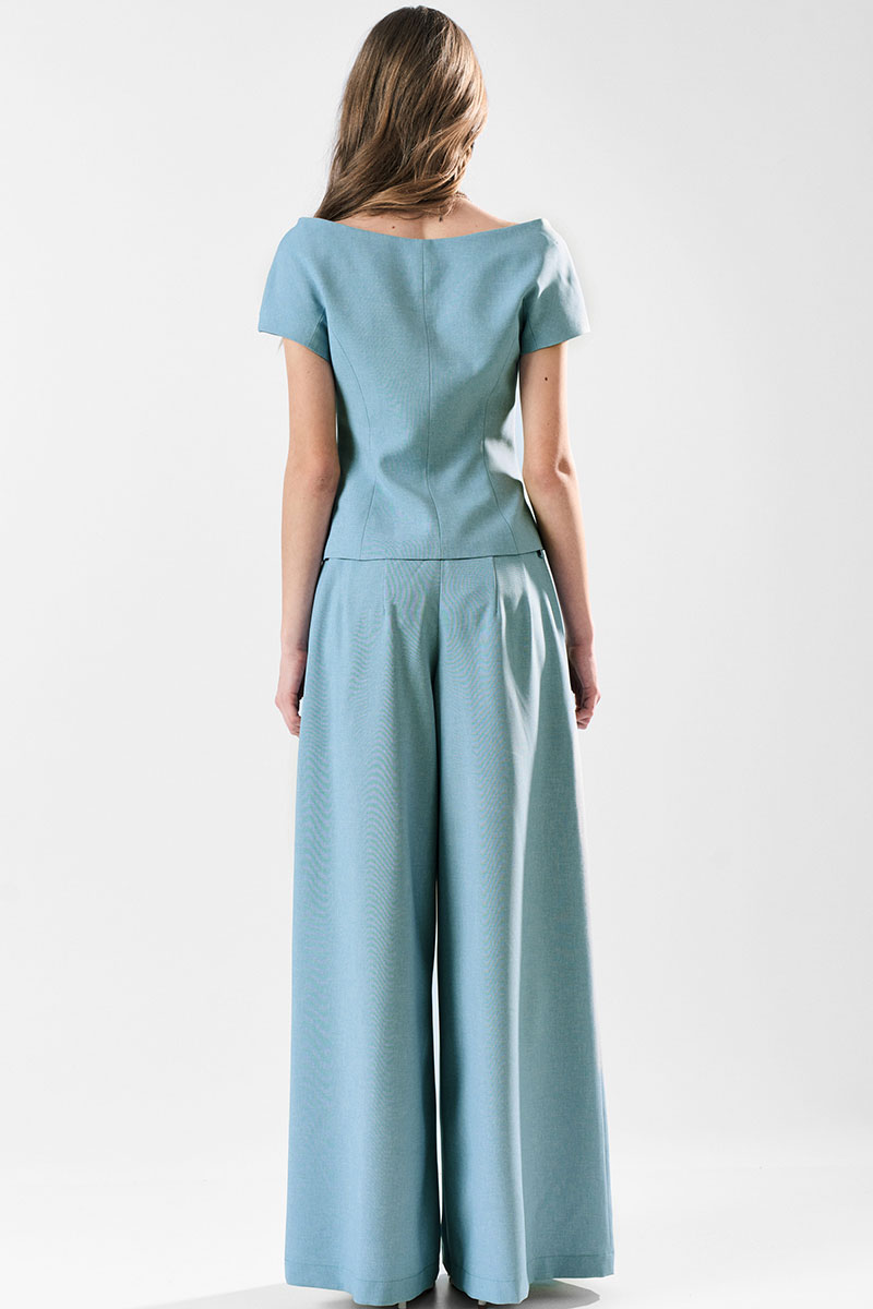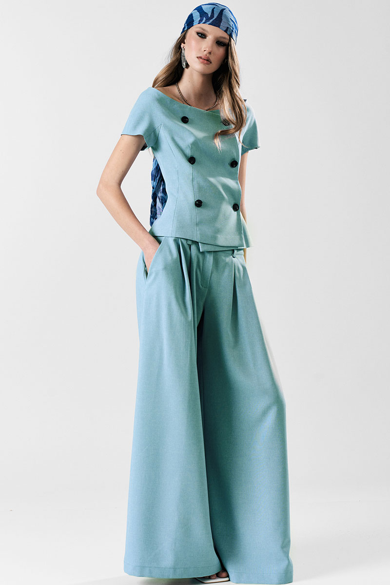 Брюки-палаццо с двумя глубокими встречными складками. Карманы в боковых швах. Сзади для лучшей посадки сделаны вытачки. Застежка на брюках крючок и молния.