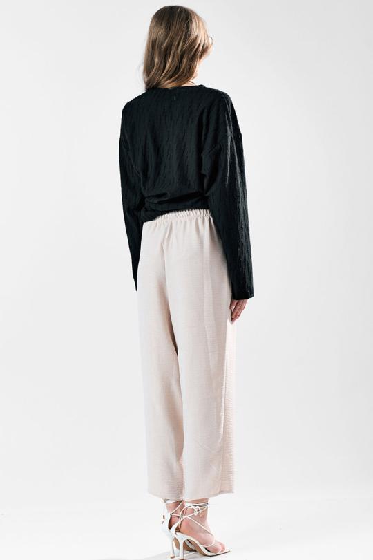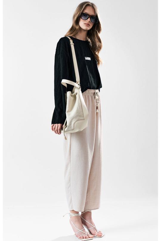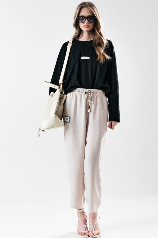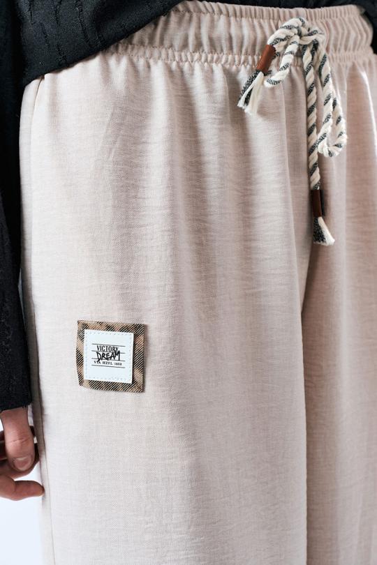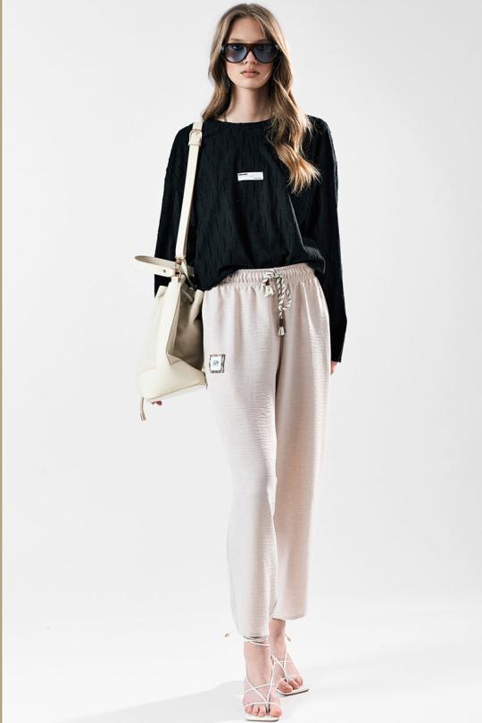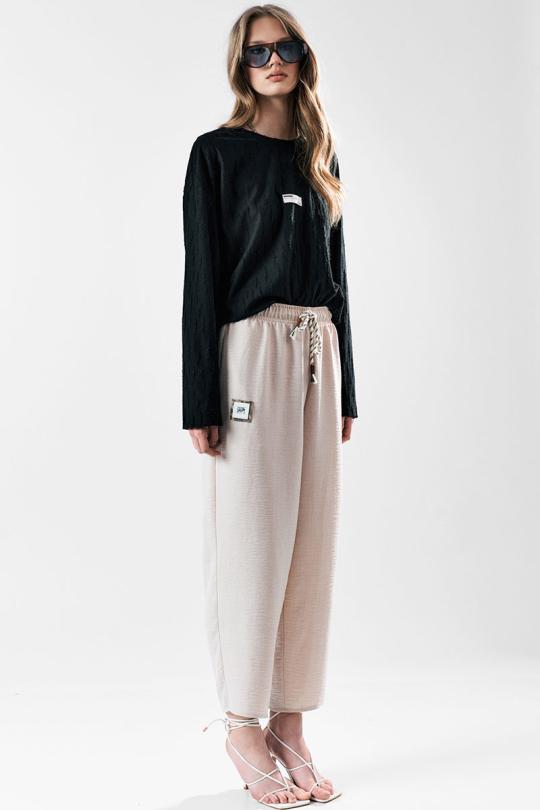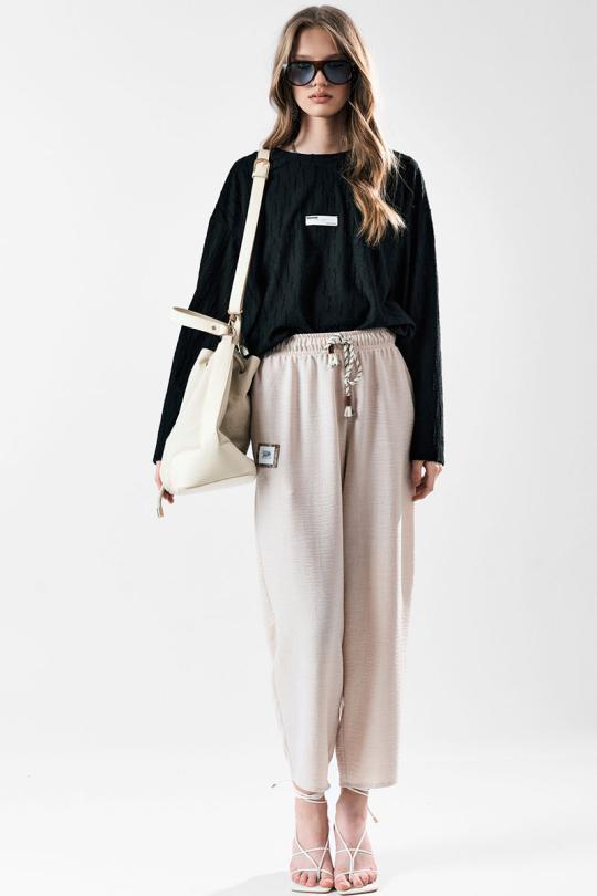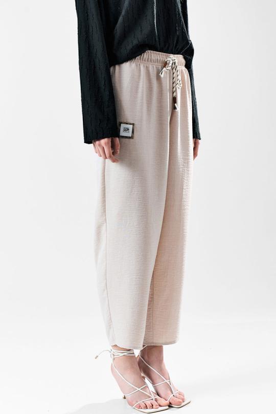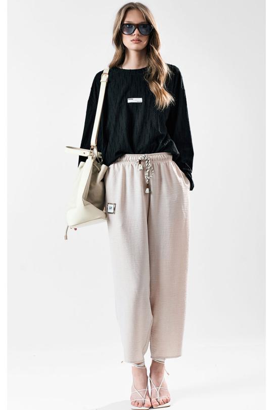 Брюки свободного силуэта с заужением к низу. Пояс с эластичной лентой .В боковых швах карманы.