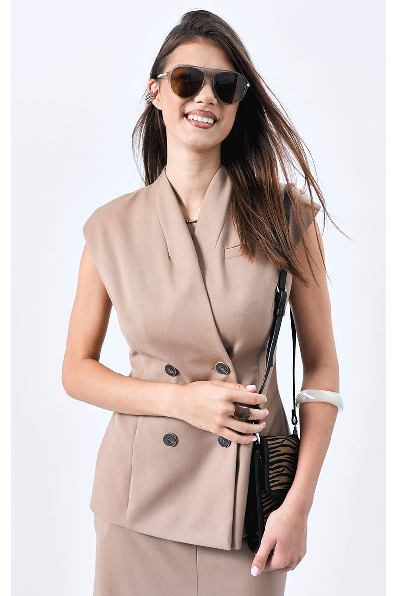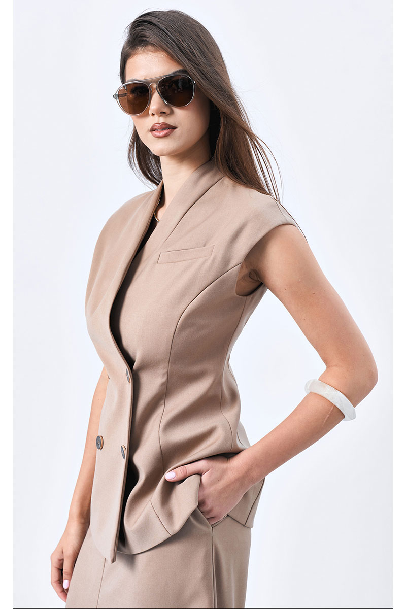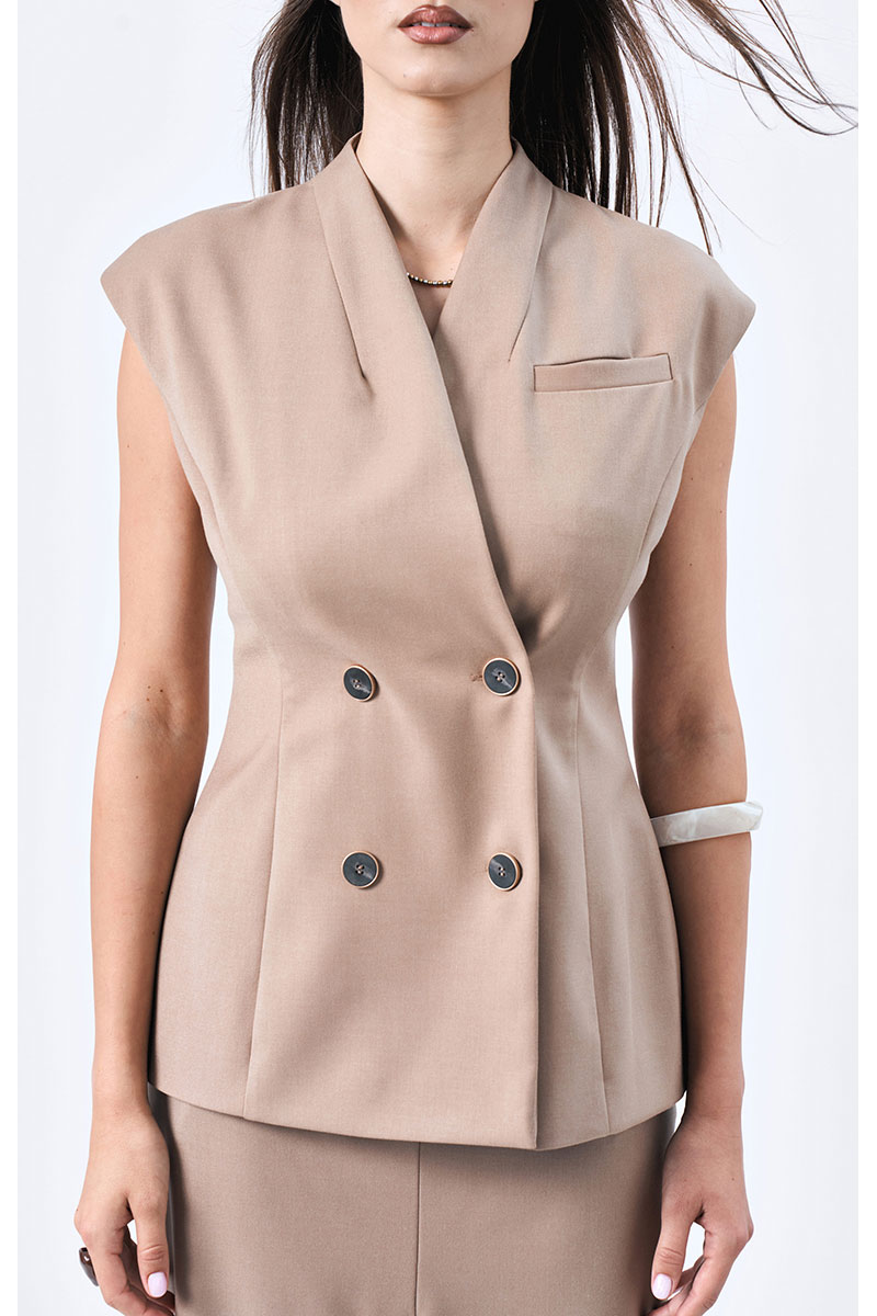 Жилет прилегающего силуэта, на подкладке, с двубортной застежкой на 4 пуговицы.