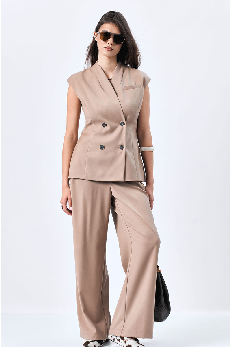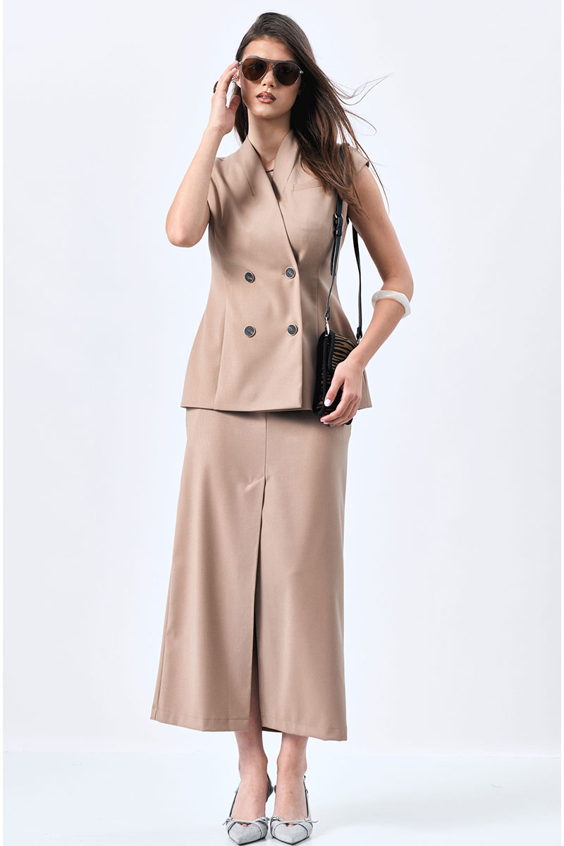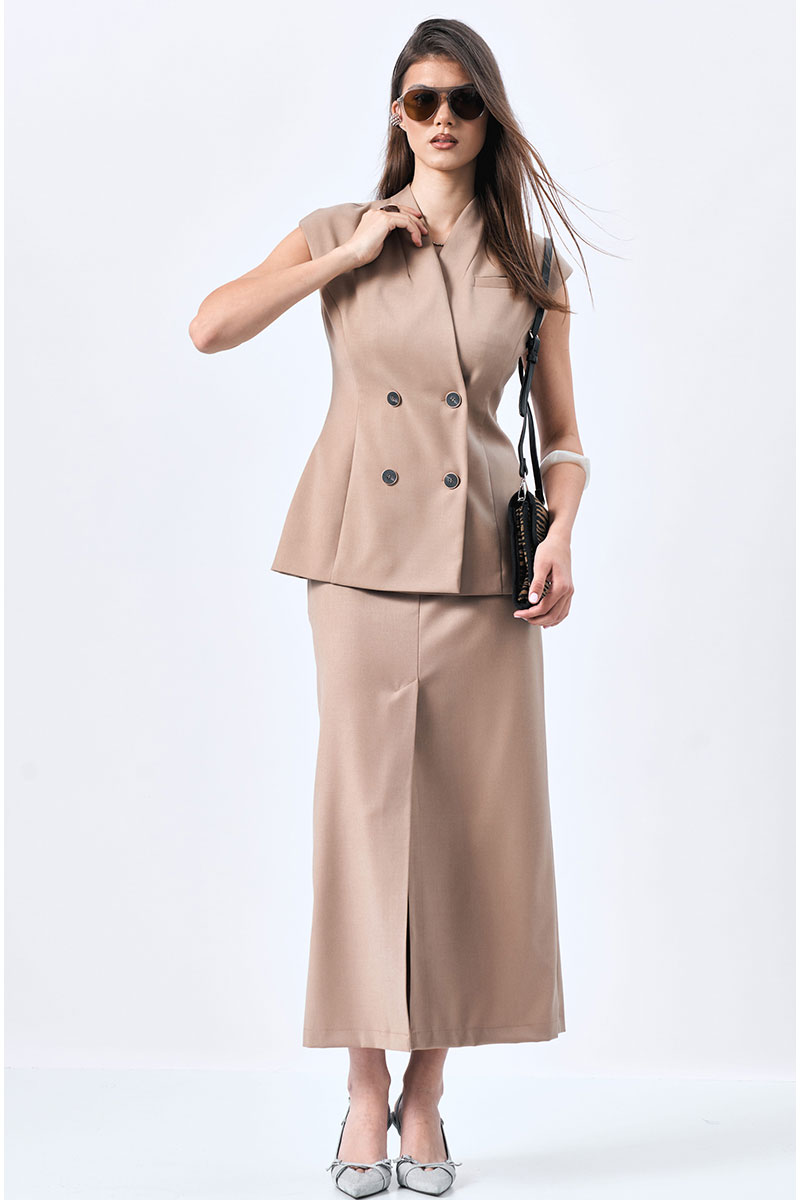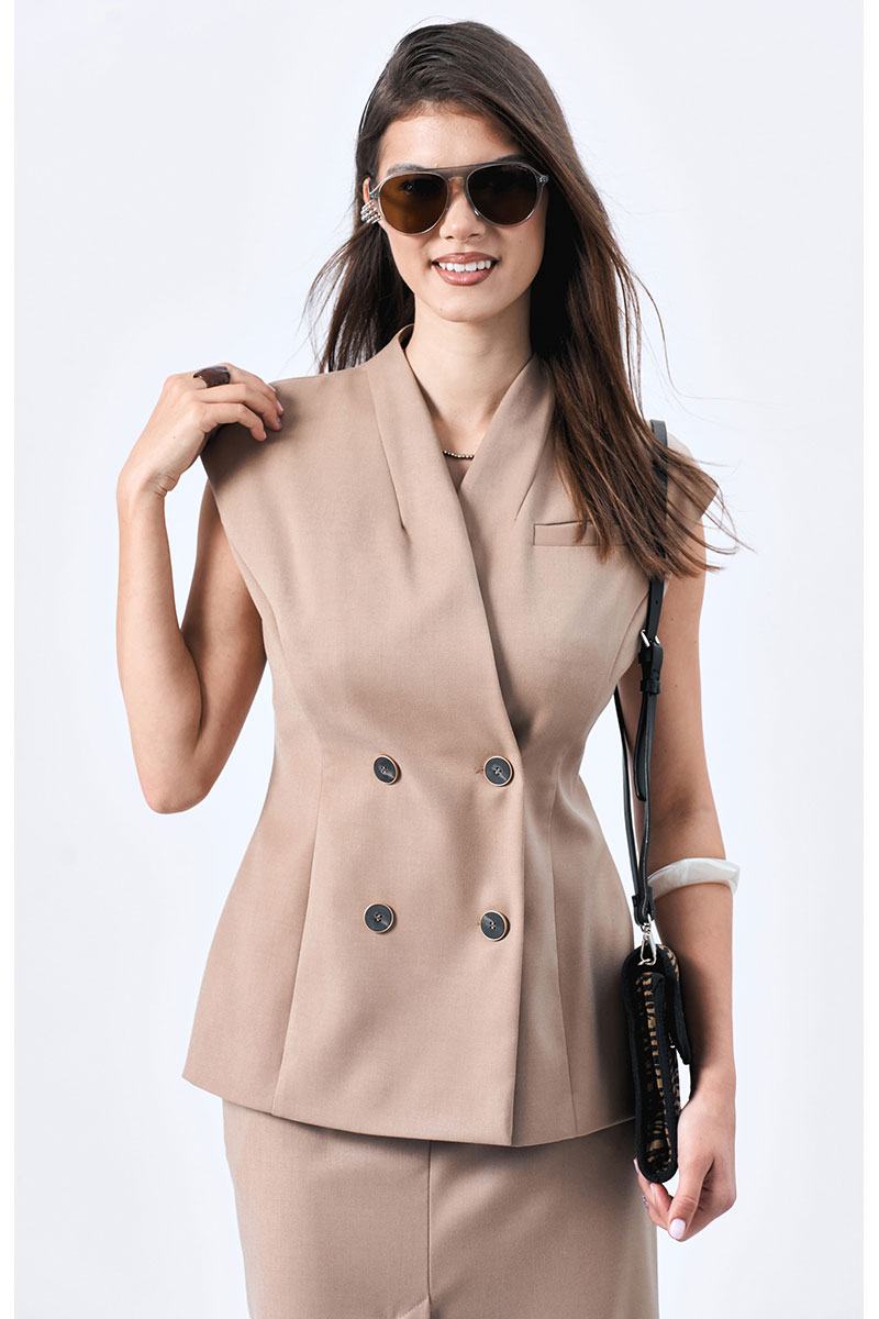 Жилет прилегающего силуэта, на подкладке, с двубортной застежкой на 4 пуговицы.