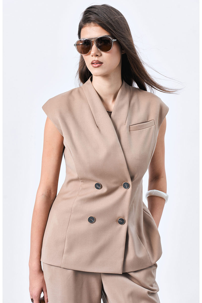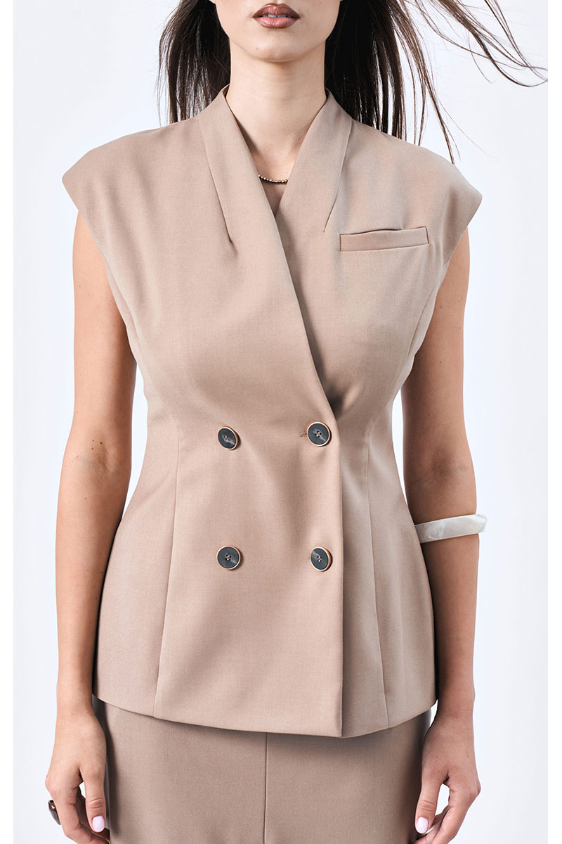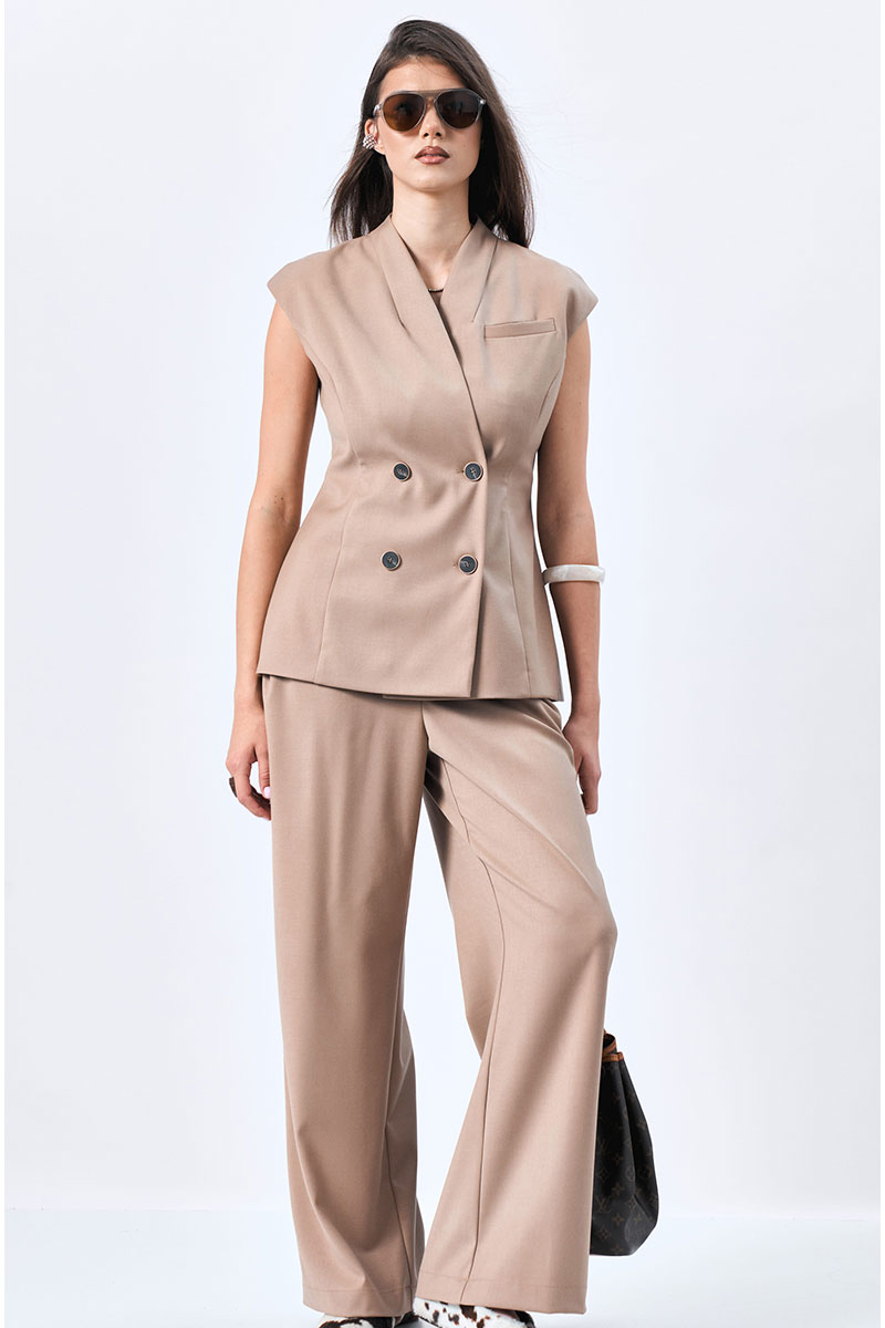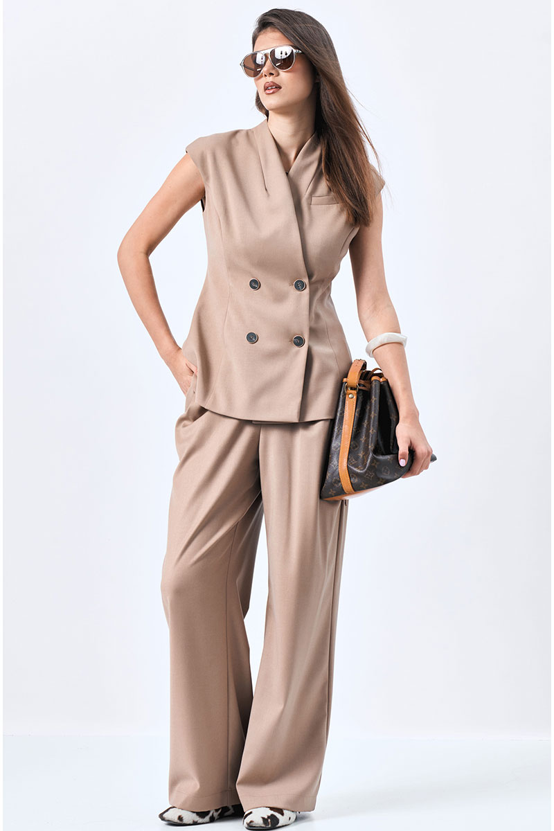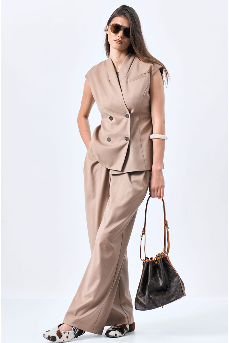 Костюм-двойка брючный, жилет прилегающего силуэта, на подкладке, с двубортной застежкой на 4 пуговицы. Брюки-палаццо умеренной ширины, со складками по переду.Застежка пуговица и молния, сзади по талии резинка для лучшей посадки.