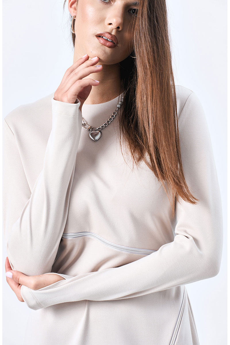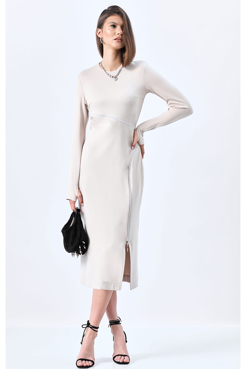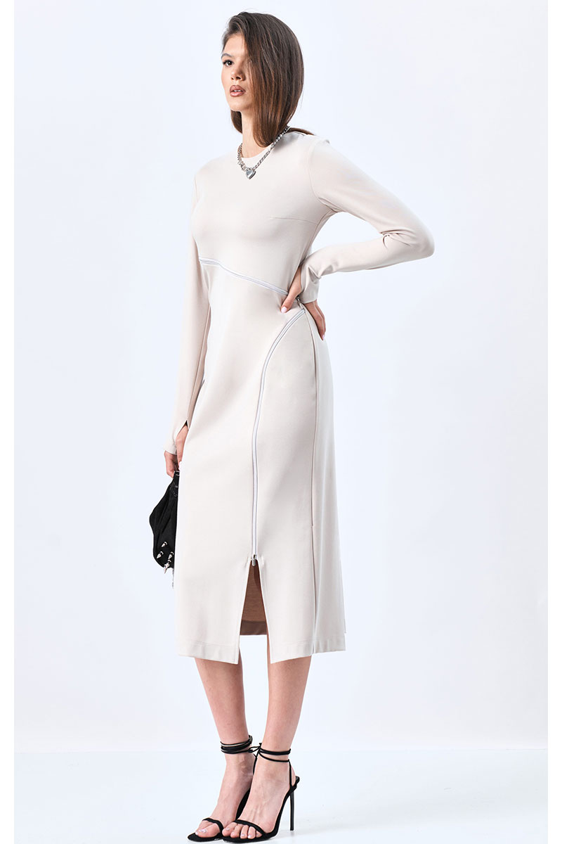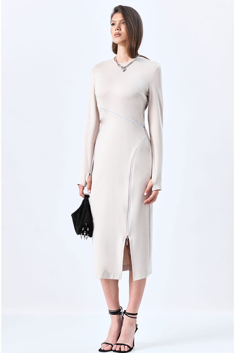Платье прилегающего силуэта, с молниями-декором по переду. Молнии - функциональные. Застежка - потайная молния в спинке. Внизу рукав - разрез для большого пальца.