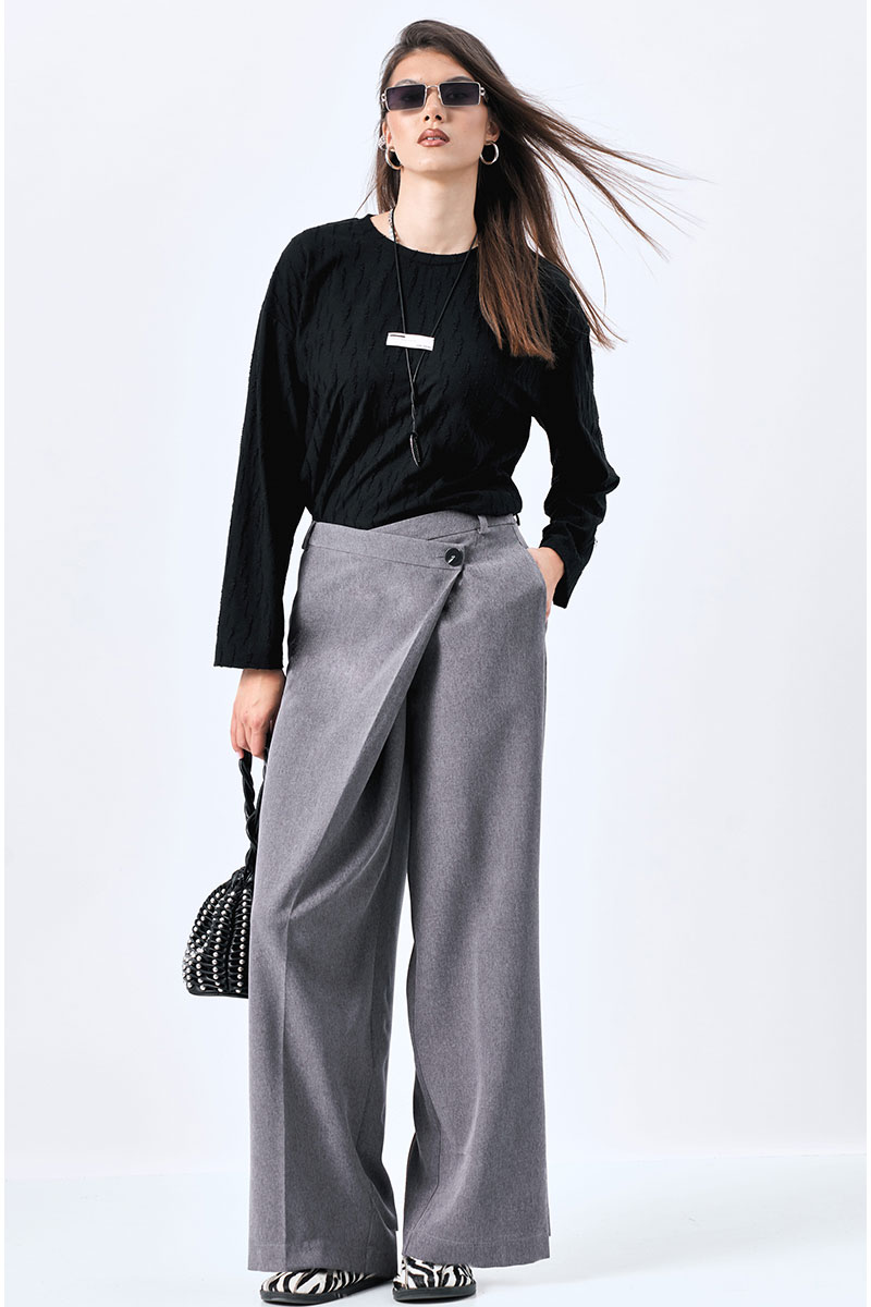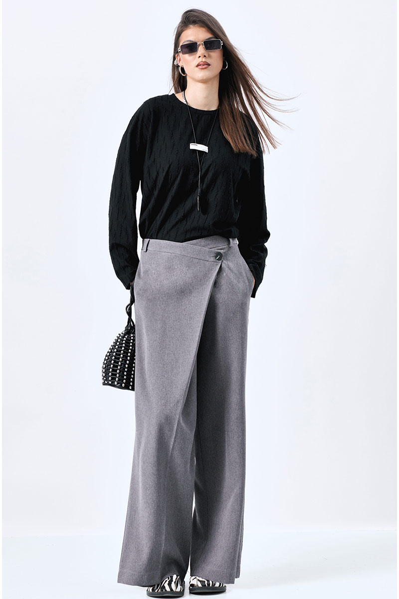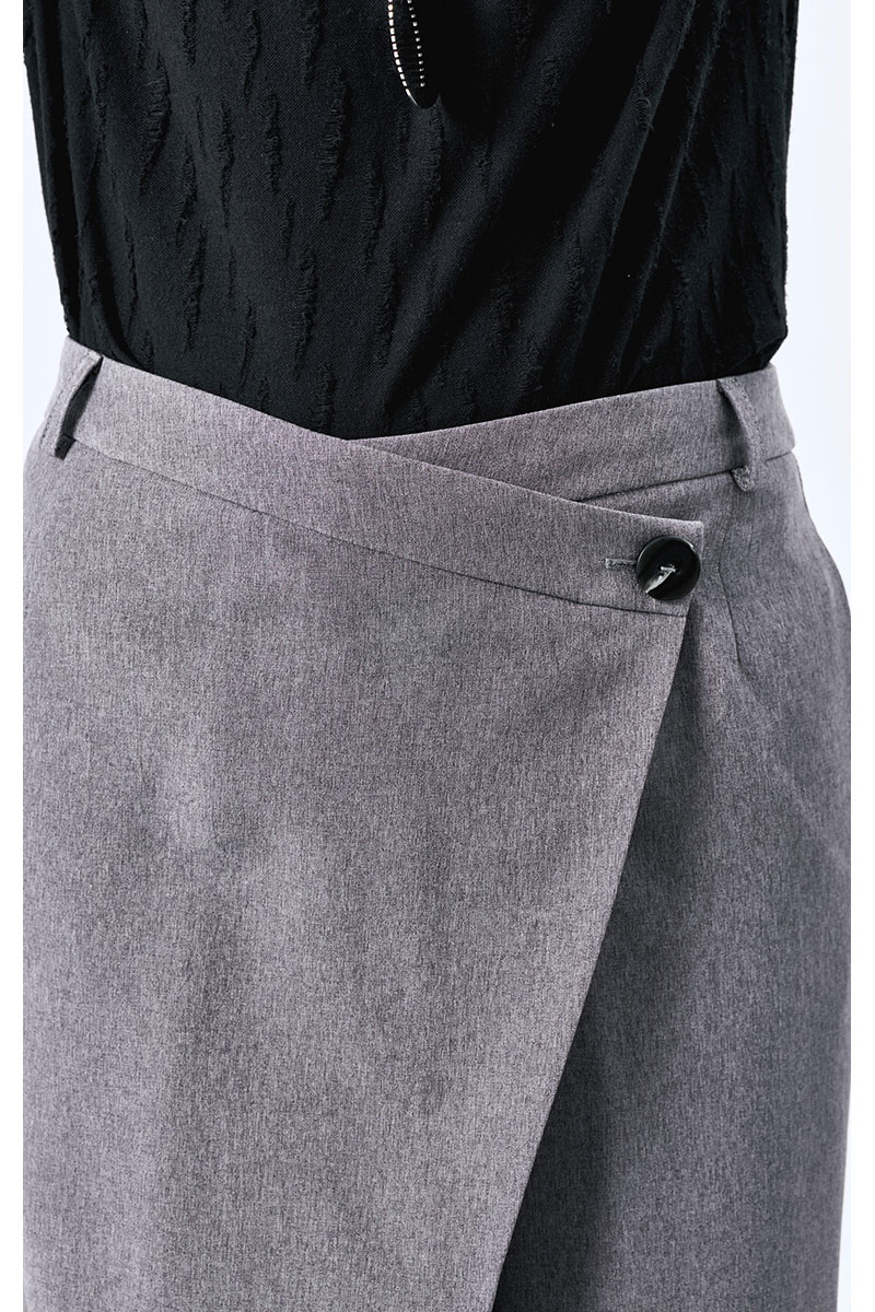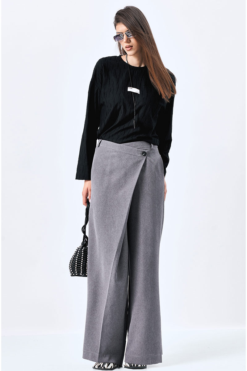 Широкие брюки с асимметричной застежкой-запахом по переду. Карманы в боковом шве. Застежка на пуговицы. Ткань "меланж".