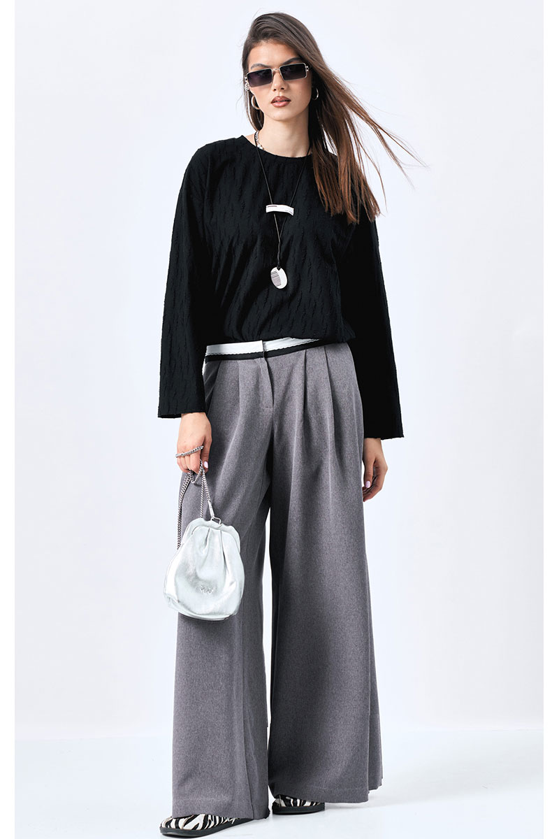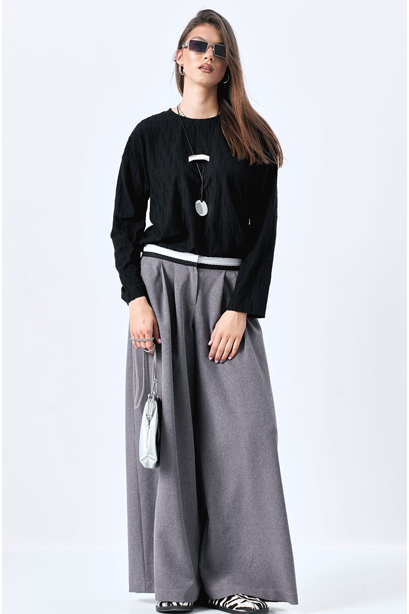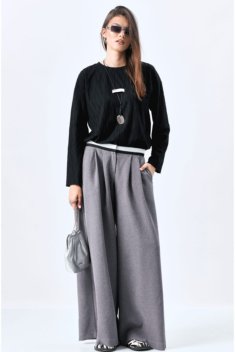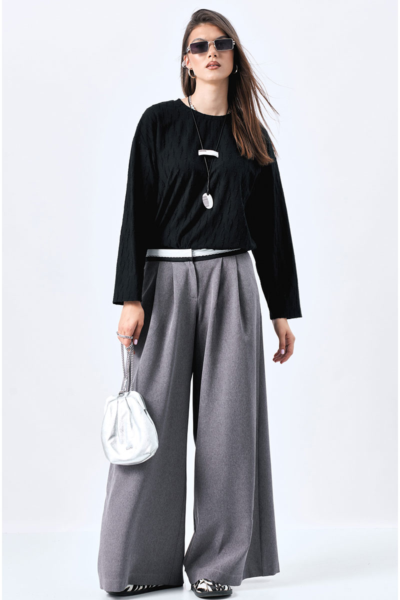 Широкие брюки-палаццо с карманами в боковых швах. Декоратиный пояс из черно-белой брючной ленты.