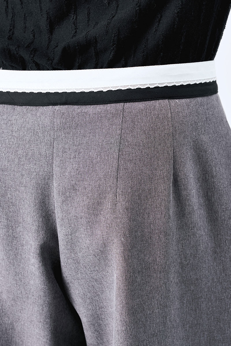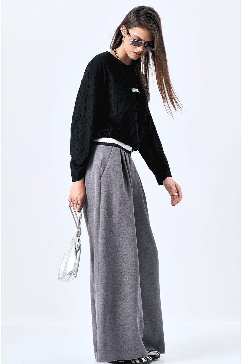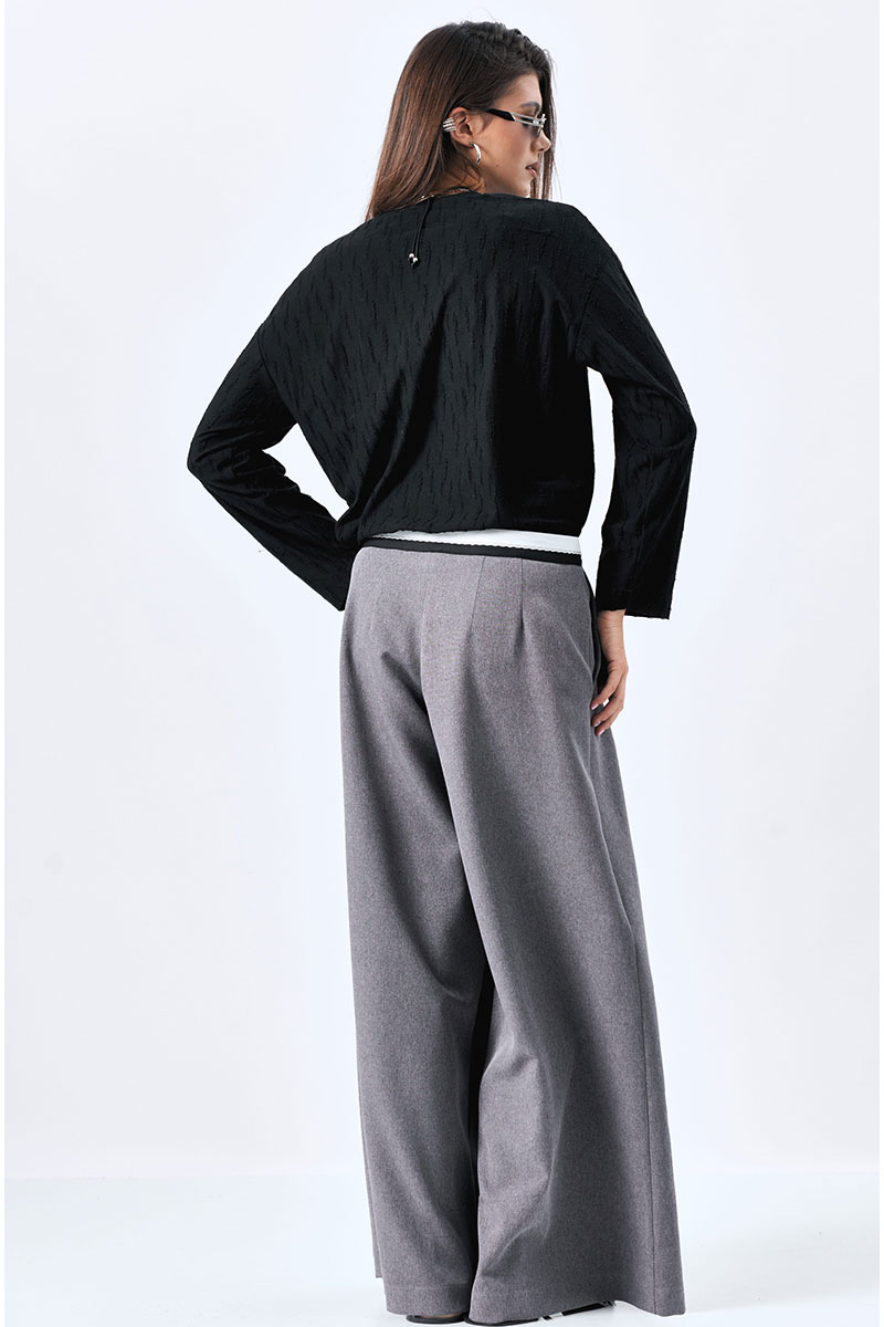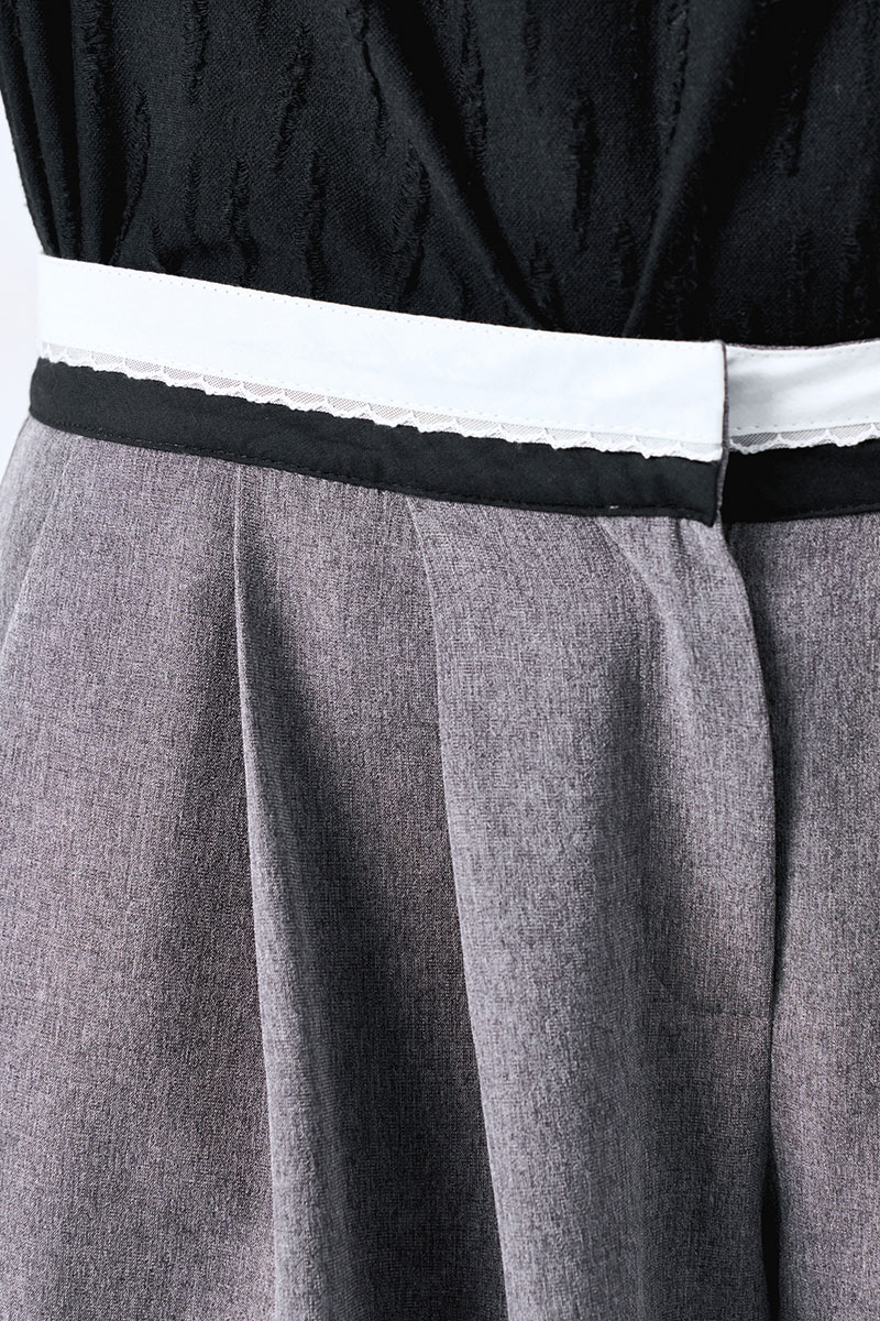 Широкие брюки-палаццо с карманами в боковых швах. Декоратиный пояс из черно-белой брючной ленты.