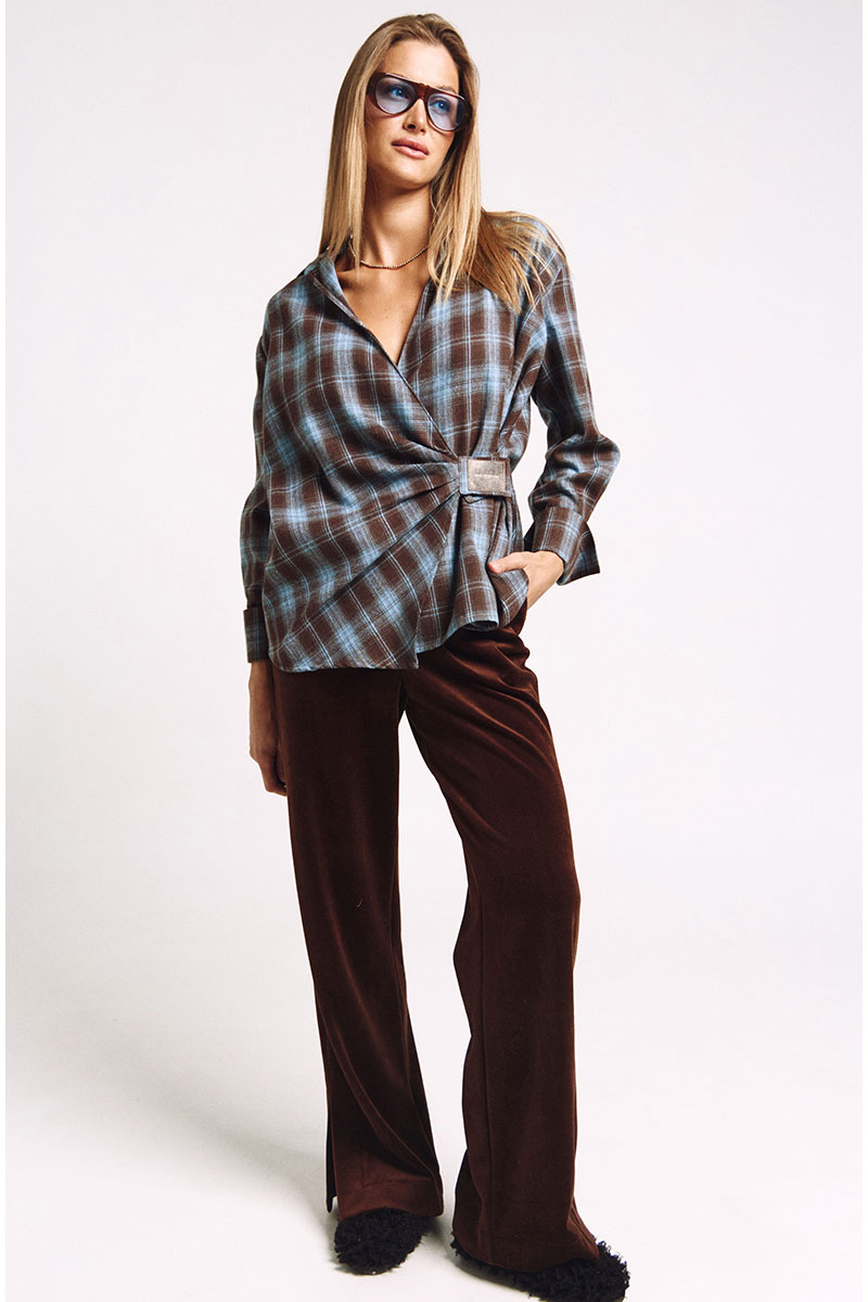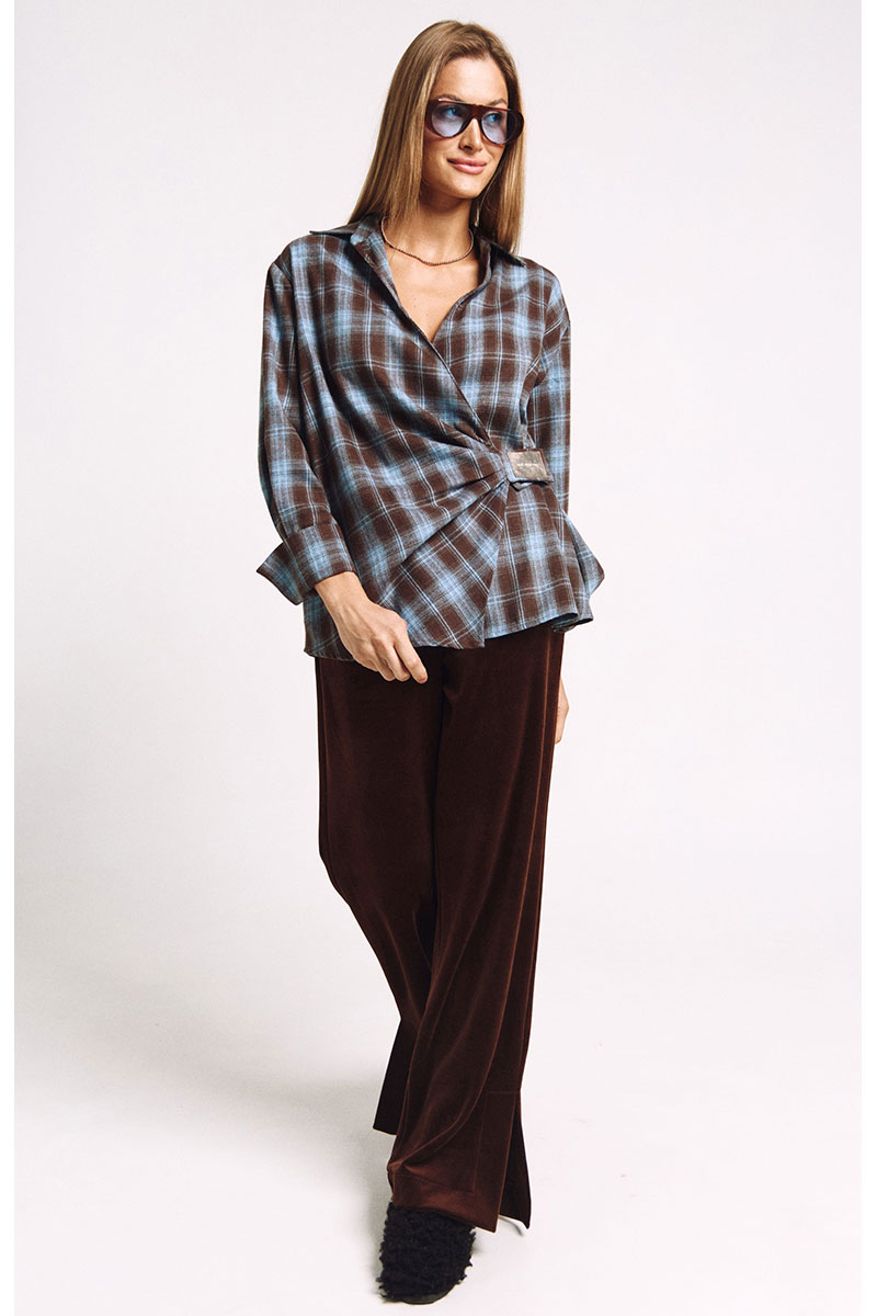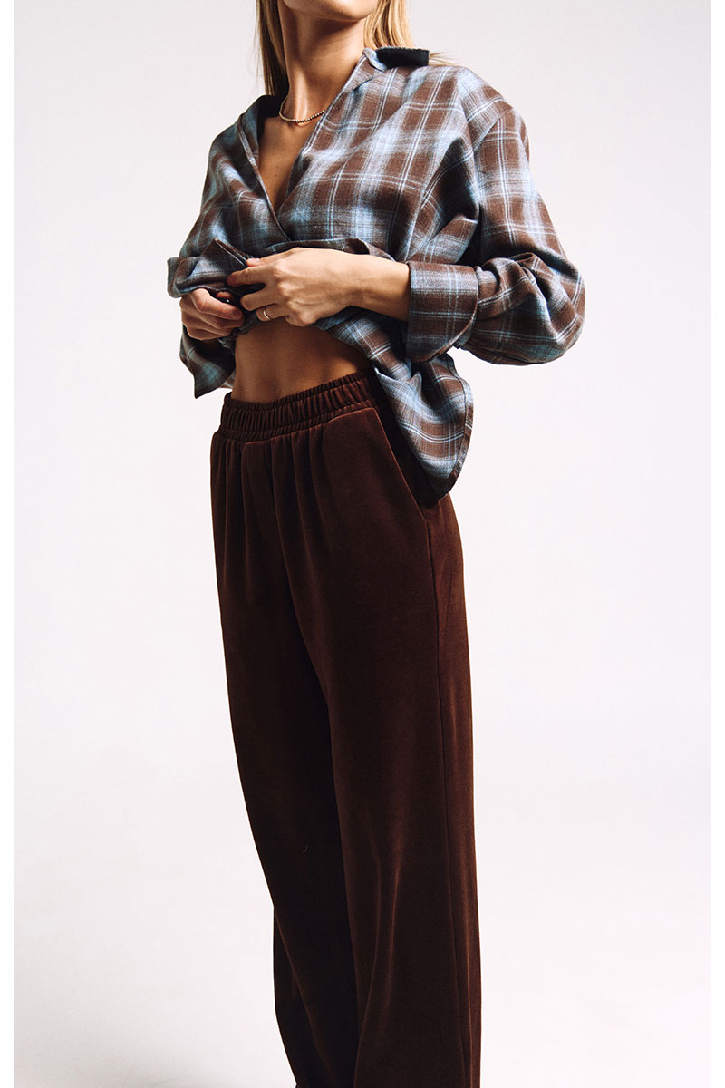 Брюки бархатные, глубокого коричневого цвета. Ворс среднего размера. Карманы в боковых швах. Средняя посадка. Пояс на резинке. По низу брюк - разрез по внешнему шву.