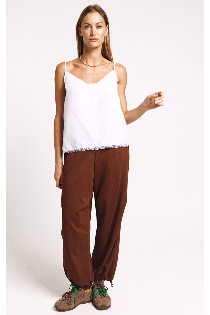 Комбинация с регулируемыми бретелями и тонким коужевом по низу. Прямой силуэт.