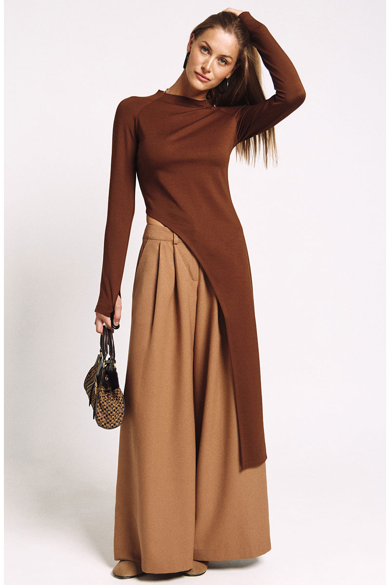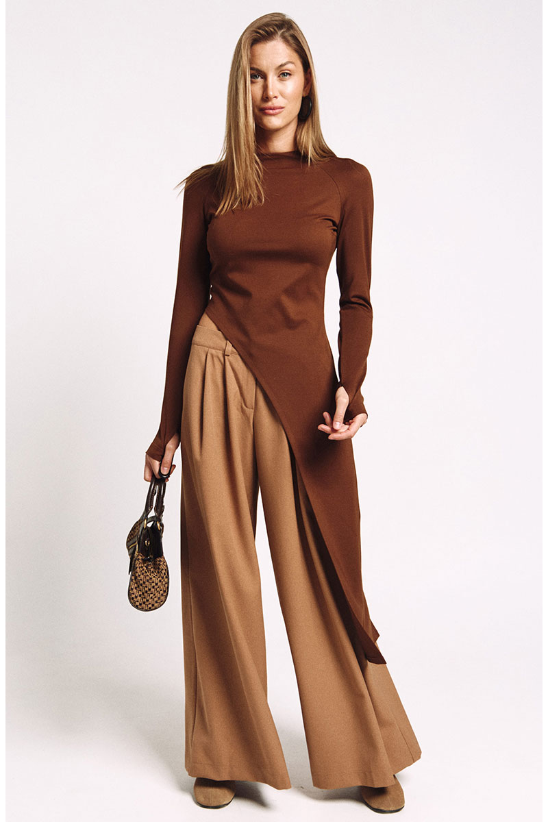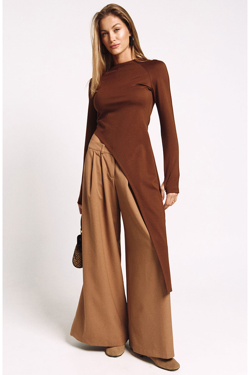 Лонгслив асимметричный, с удлиненной левой стороной. Рукав удлиненный с разрезом для большого пальца.Прилегающий силуэт, сзади - потайная молния в цвет изделия.