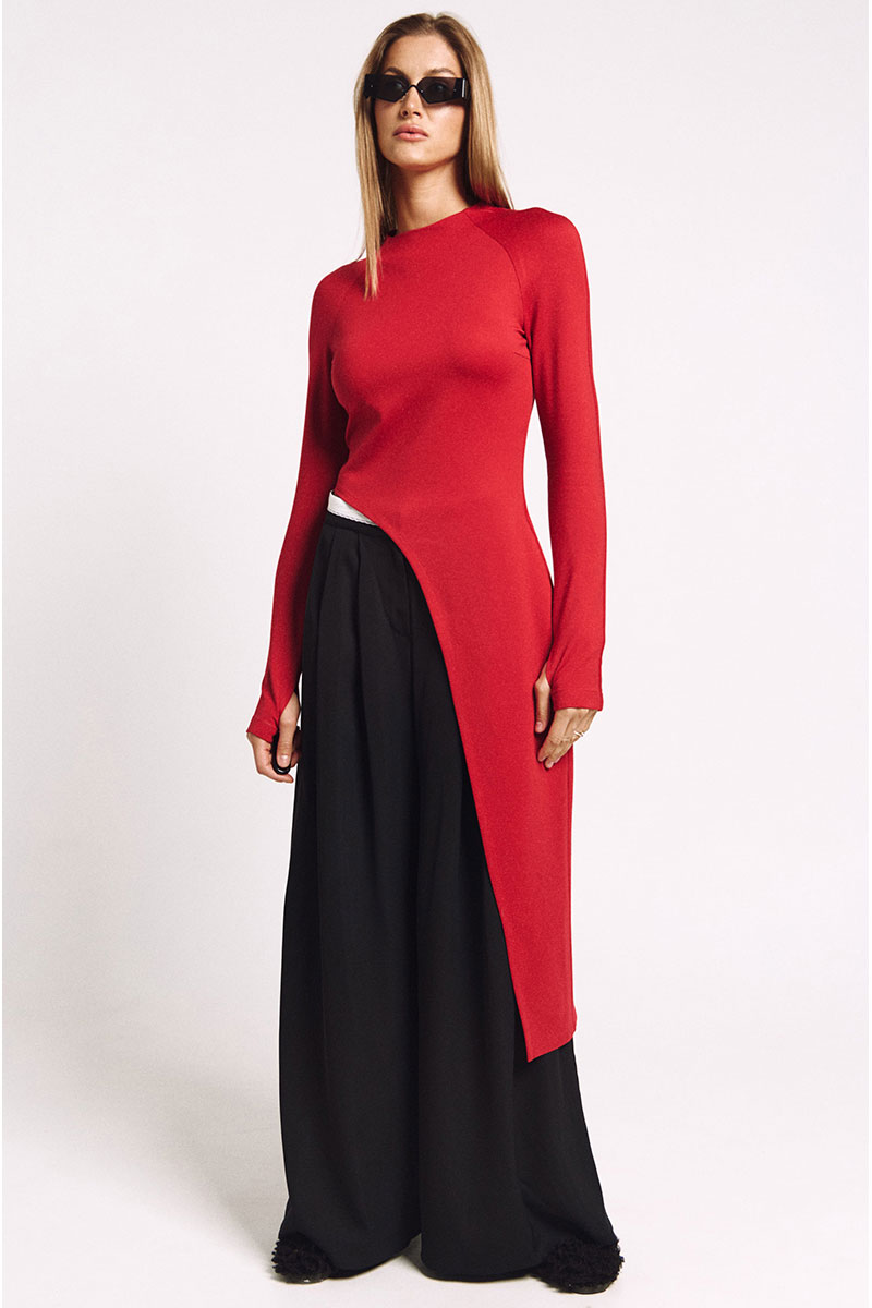 Лонгслив асимметричный, с удлиненной левой стороной. Рукав удлиненный с разрезом для большого пальца. Прилегающий силуэт, сзади - потайная молния в цвет изделия.
