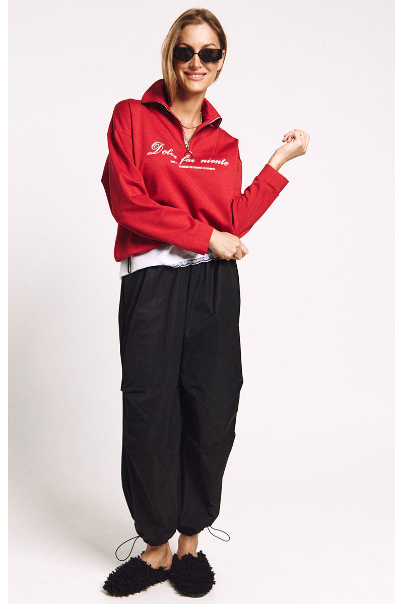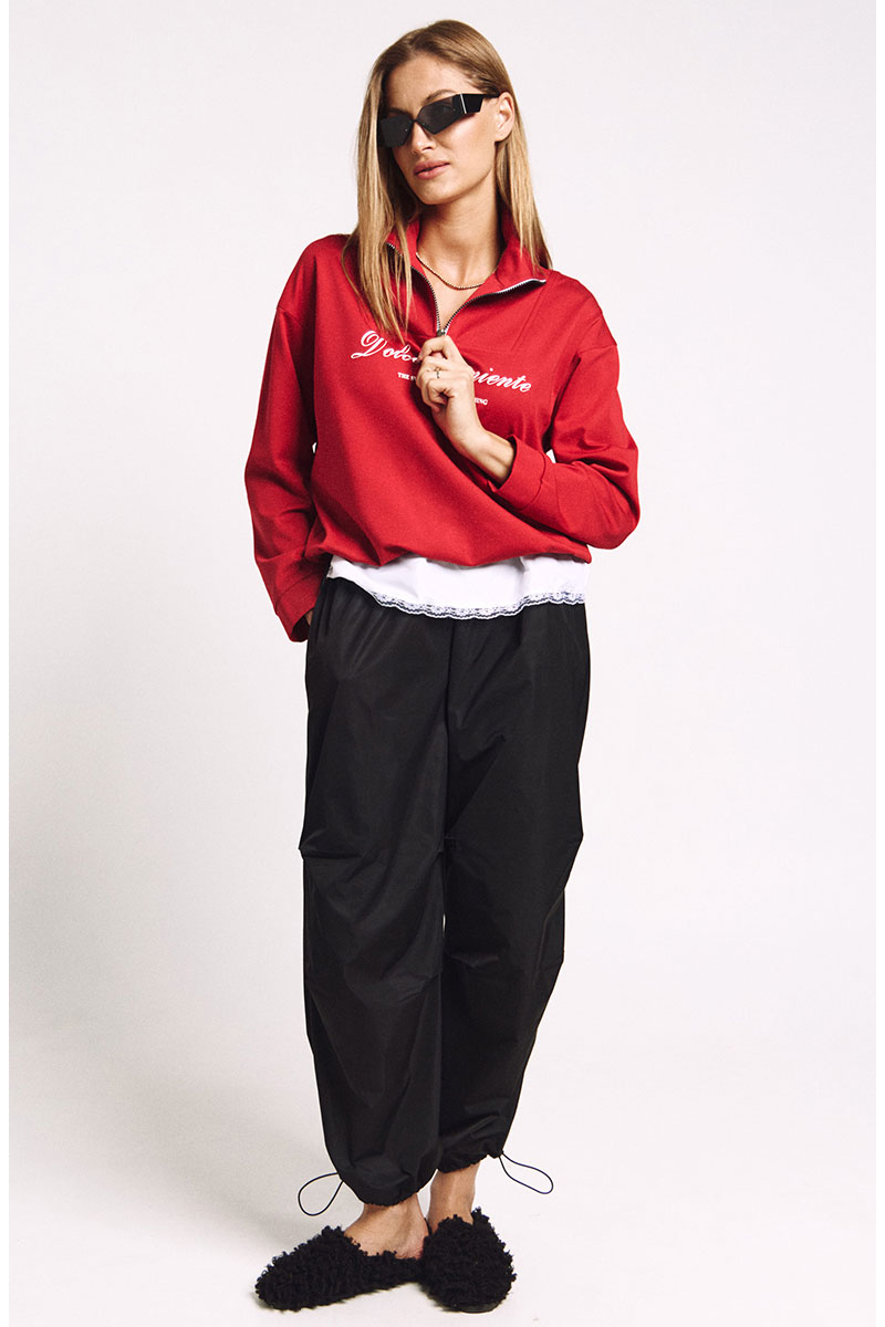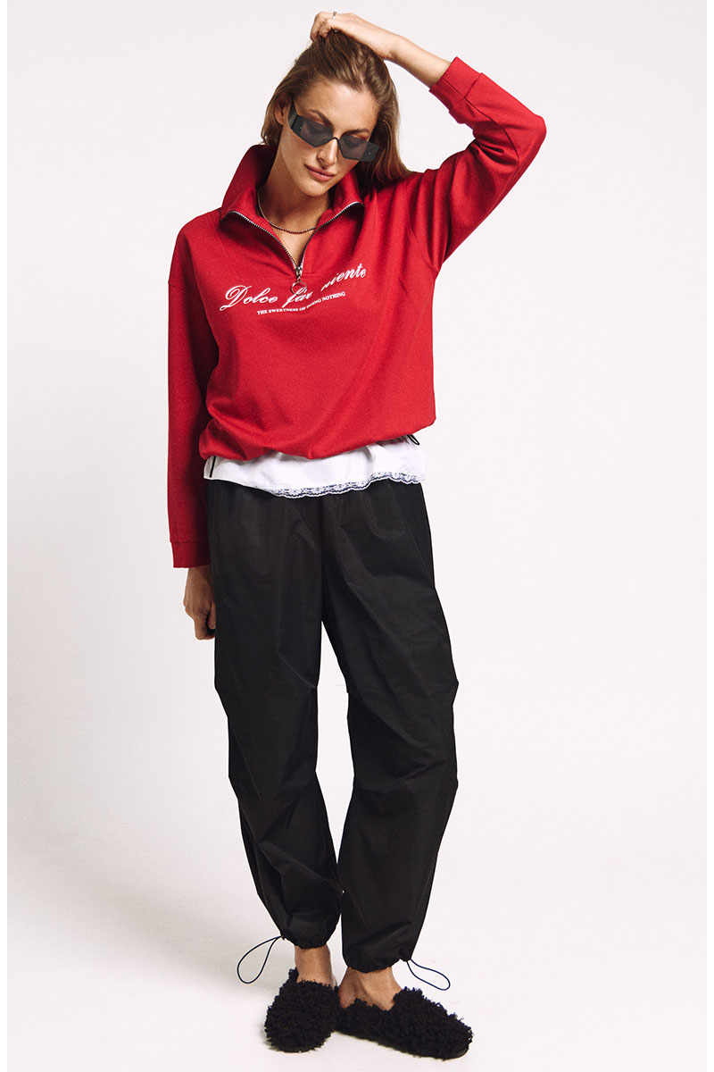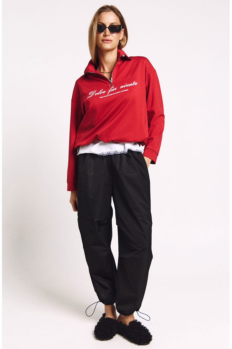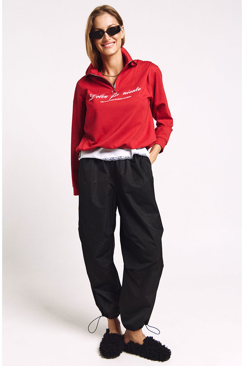 Джемпер в правильном красном цвете скарлетт со стойкой и молнией.