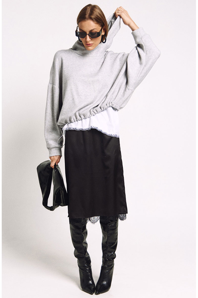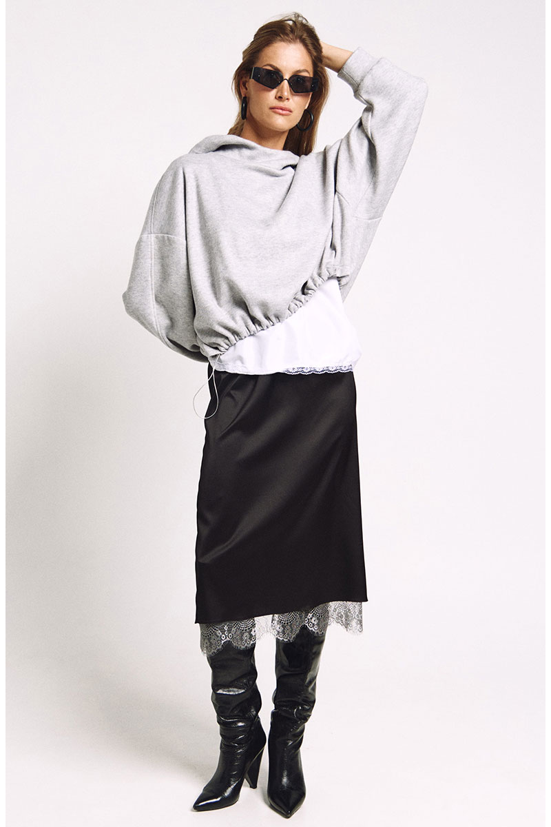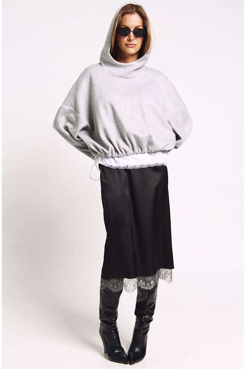 Худи большого объема с необычным капюшоном-стокой. Ширина низа худи регулируется резинками.