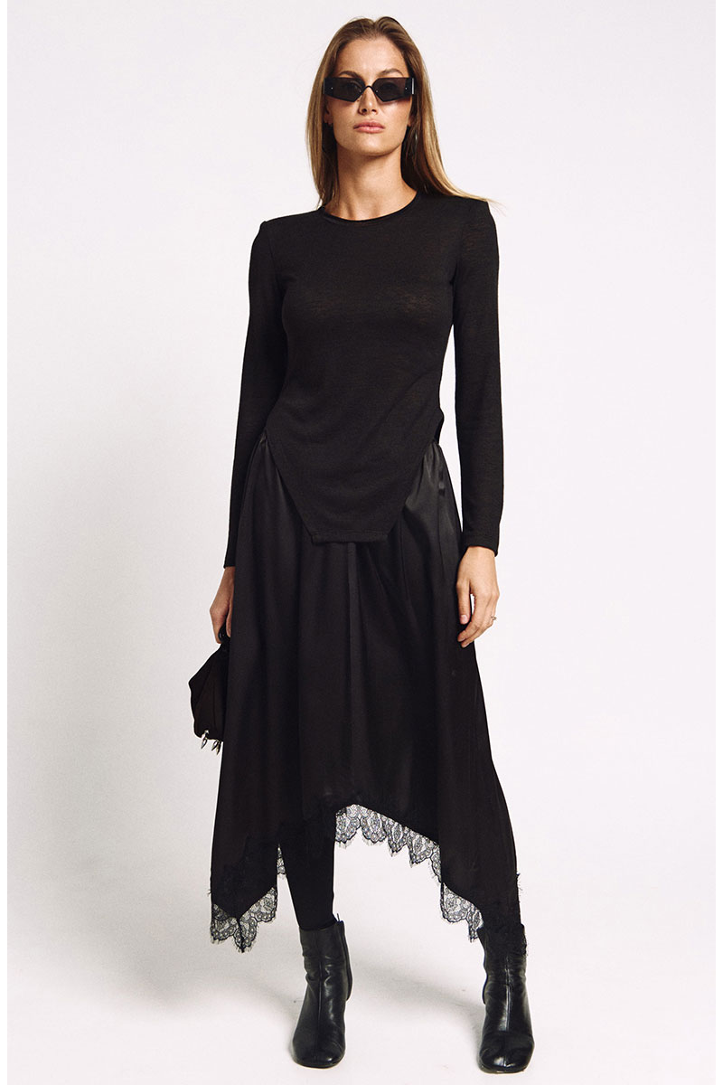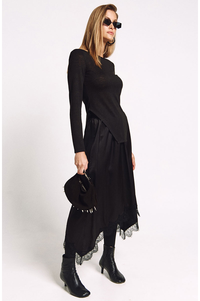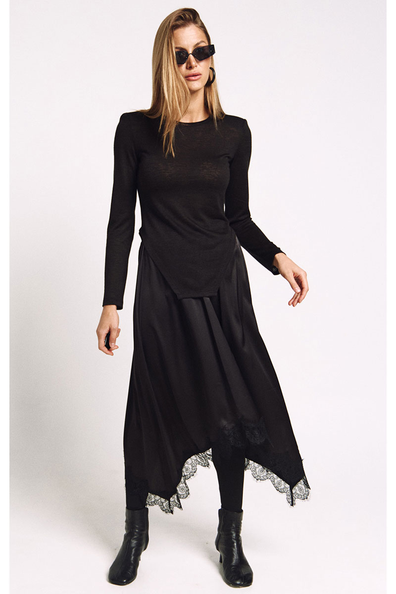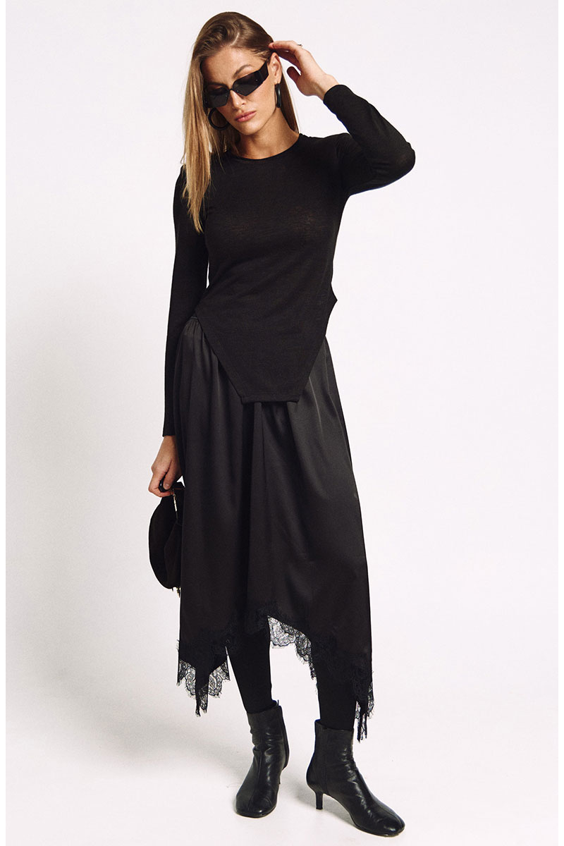 Юбка с резинкой по талии А-силуэта и фигурной линией низа отделанной французским кружевом.