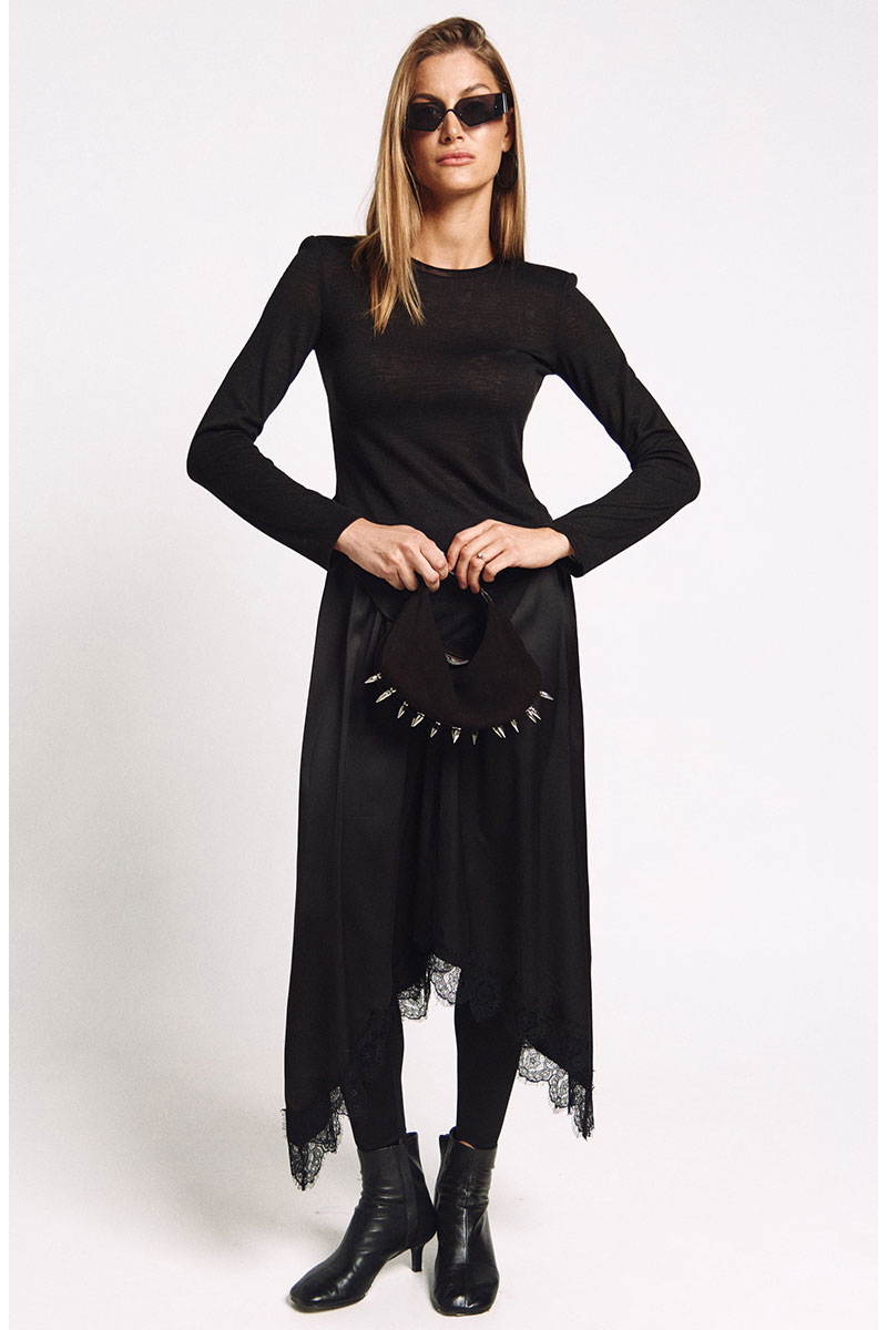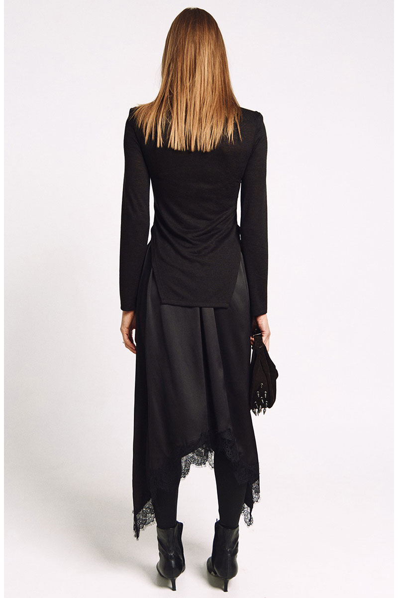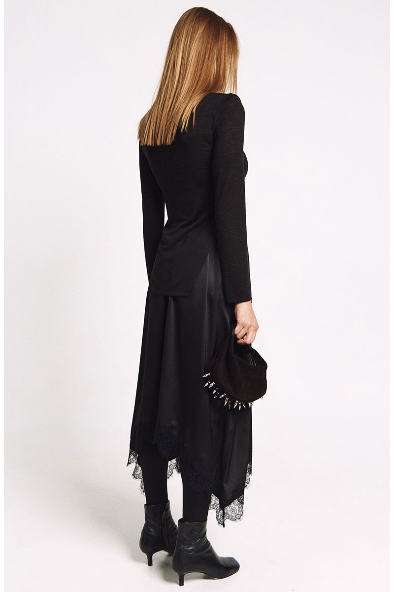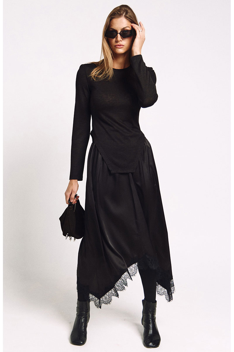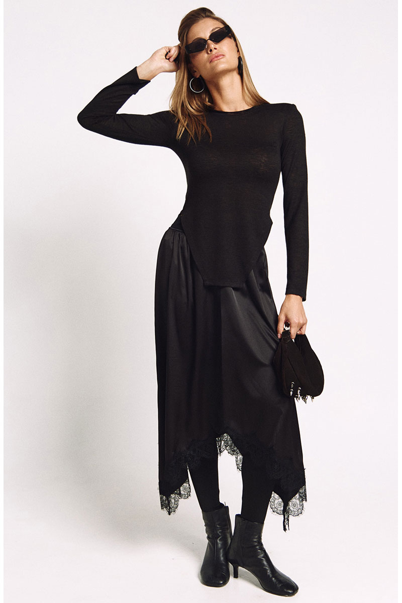 Юбка с резинкой по талии А-силуэта и фигурной линией низа отделанной французским кружевом.