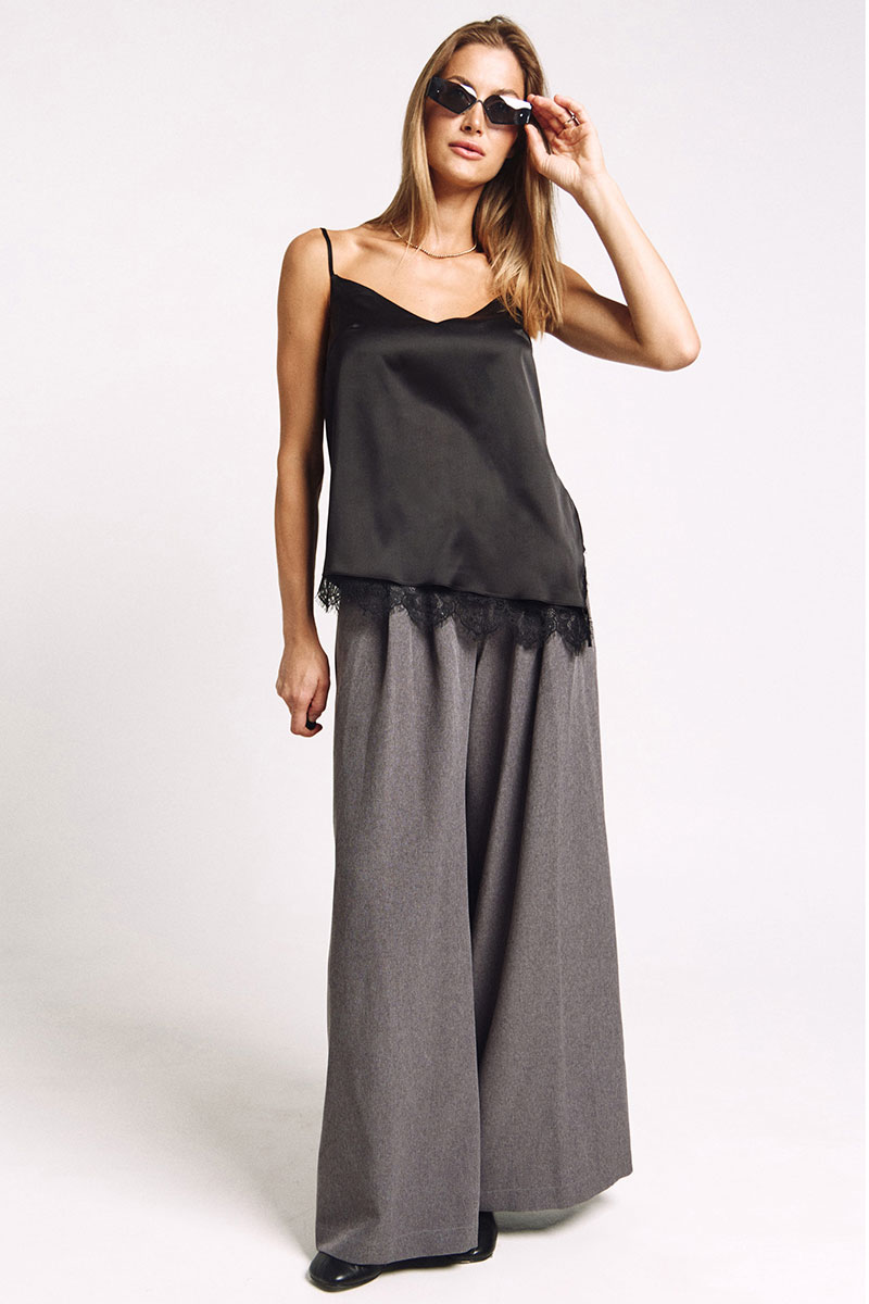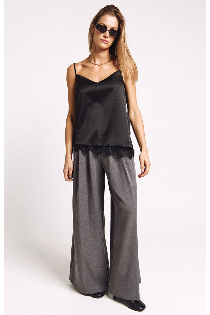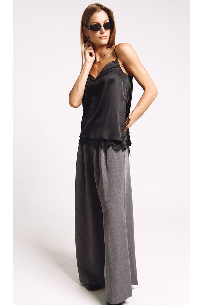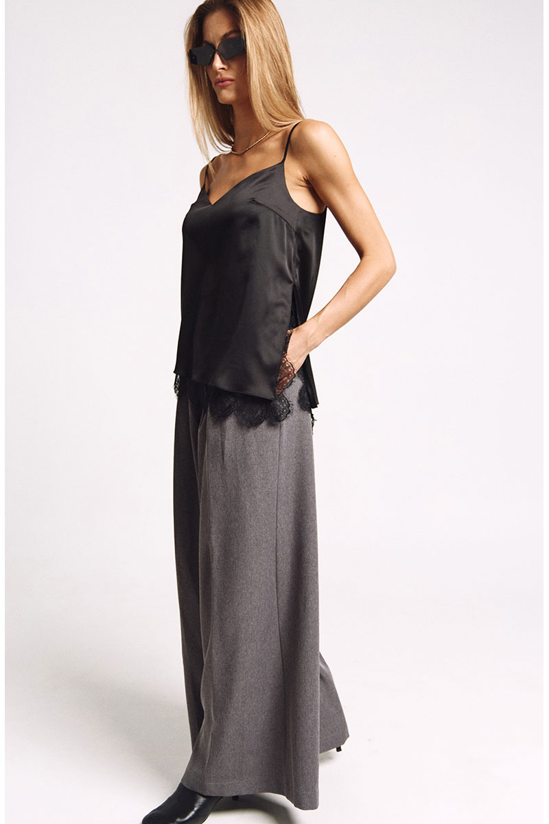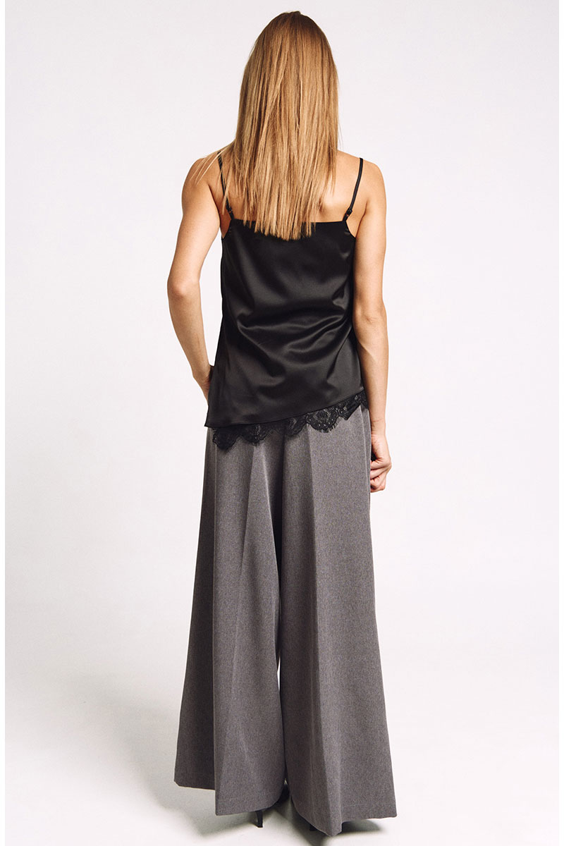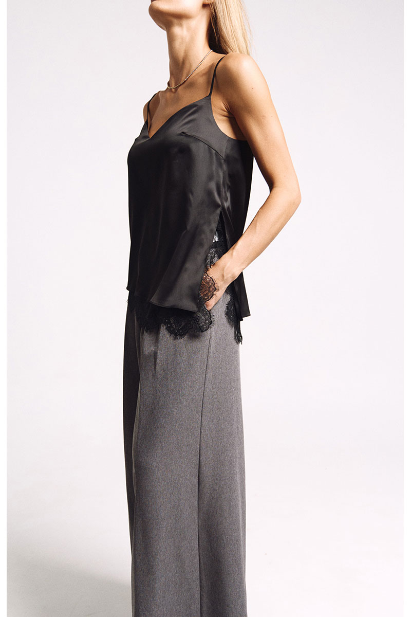 Топ-комбинация на подкладке. К подкладке притачано французское кружево. Асимметричный низ, разрез сбоку из которого видно кружево. Бретели регулируются.