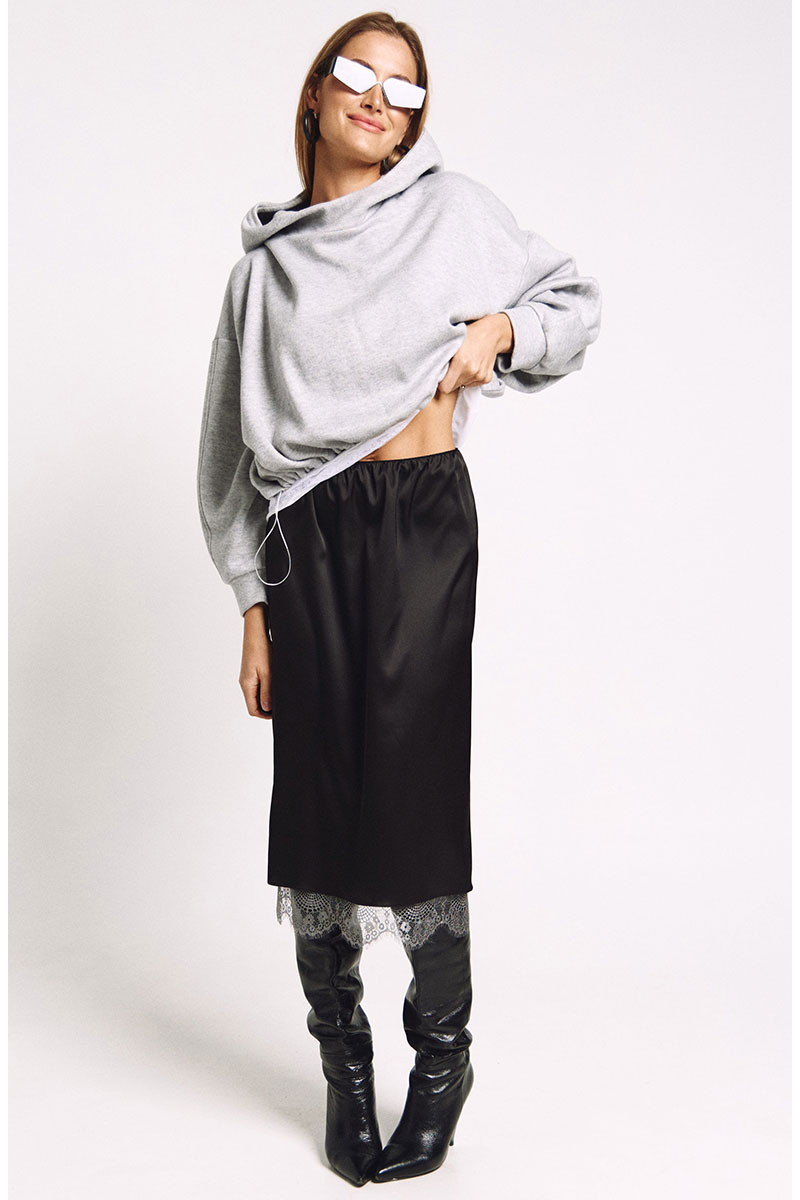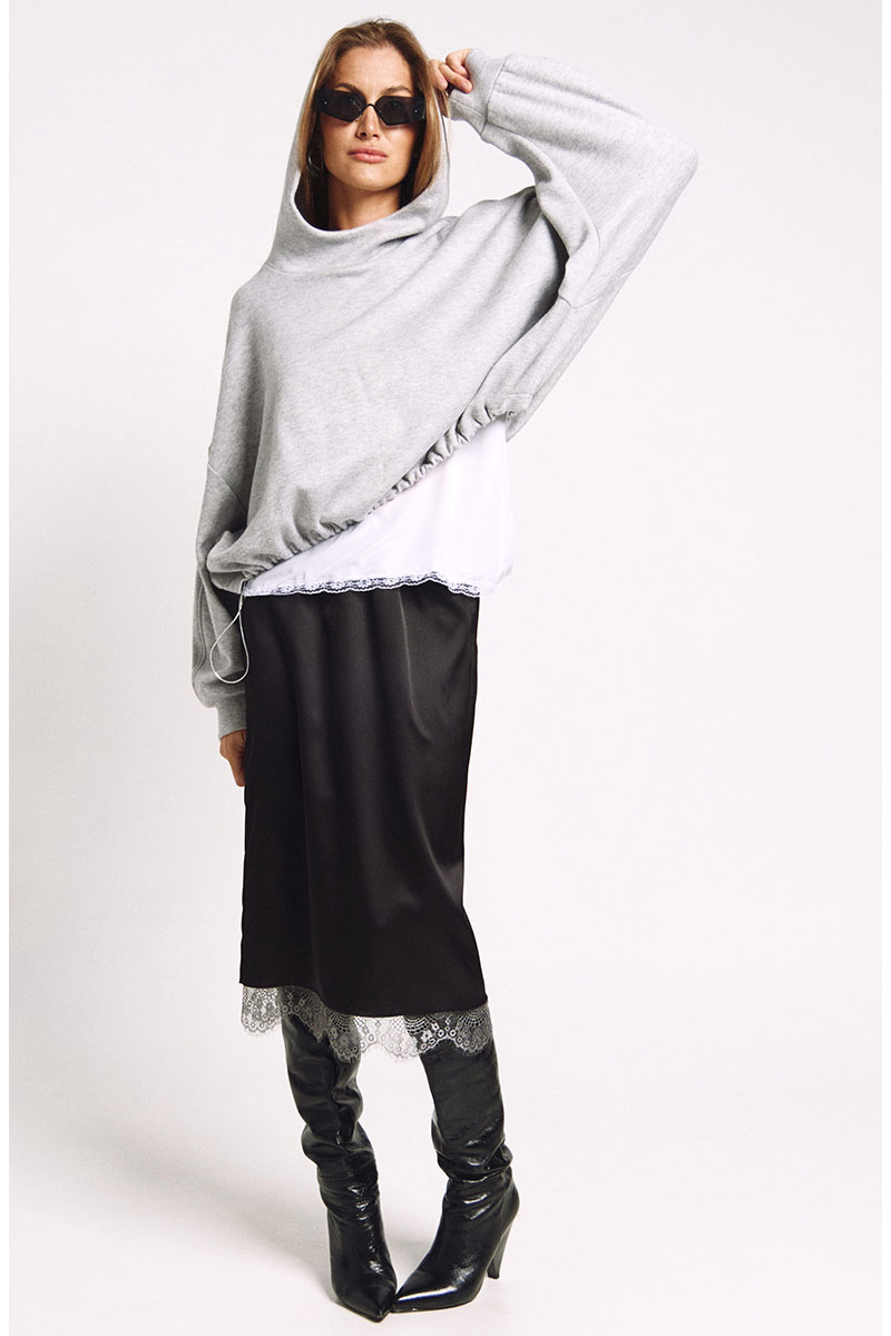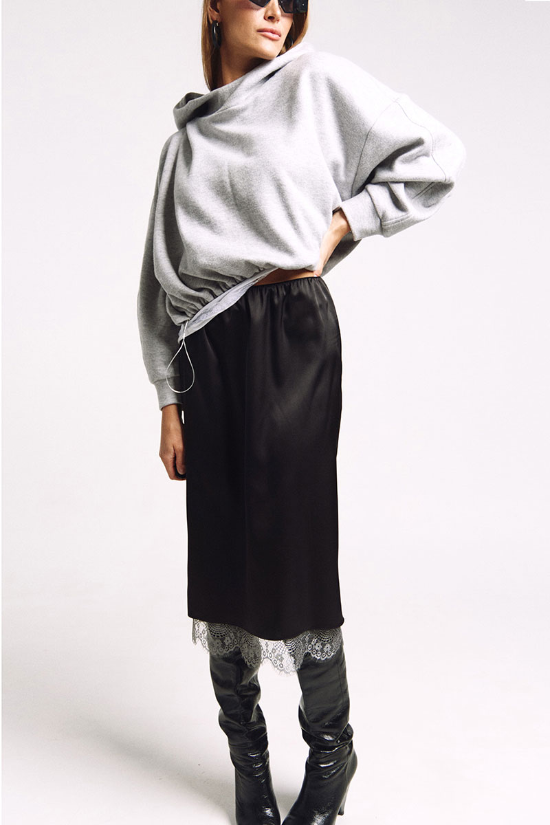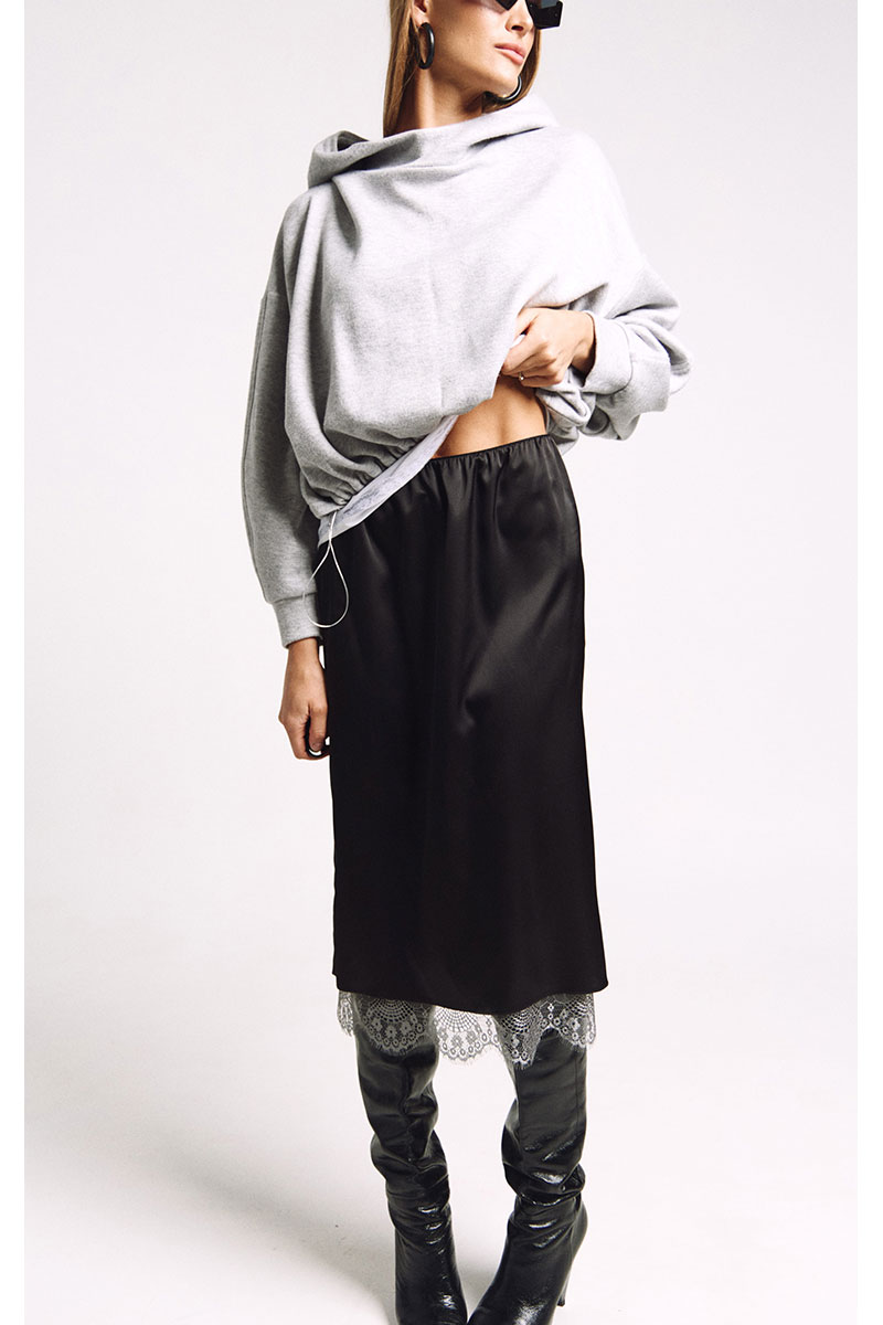Юбка прямого силуэта на подкладке, к низу подкладки притачано французское кружево в цвете "графит". Сзади юбки - высокий разрез.