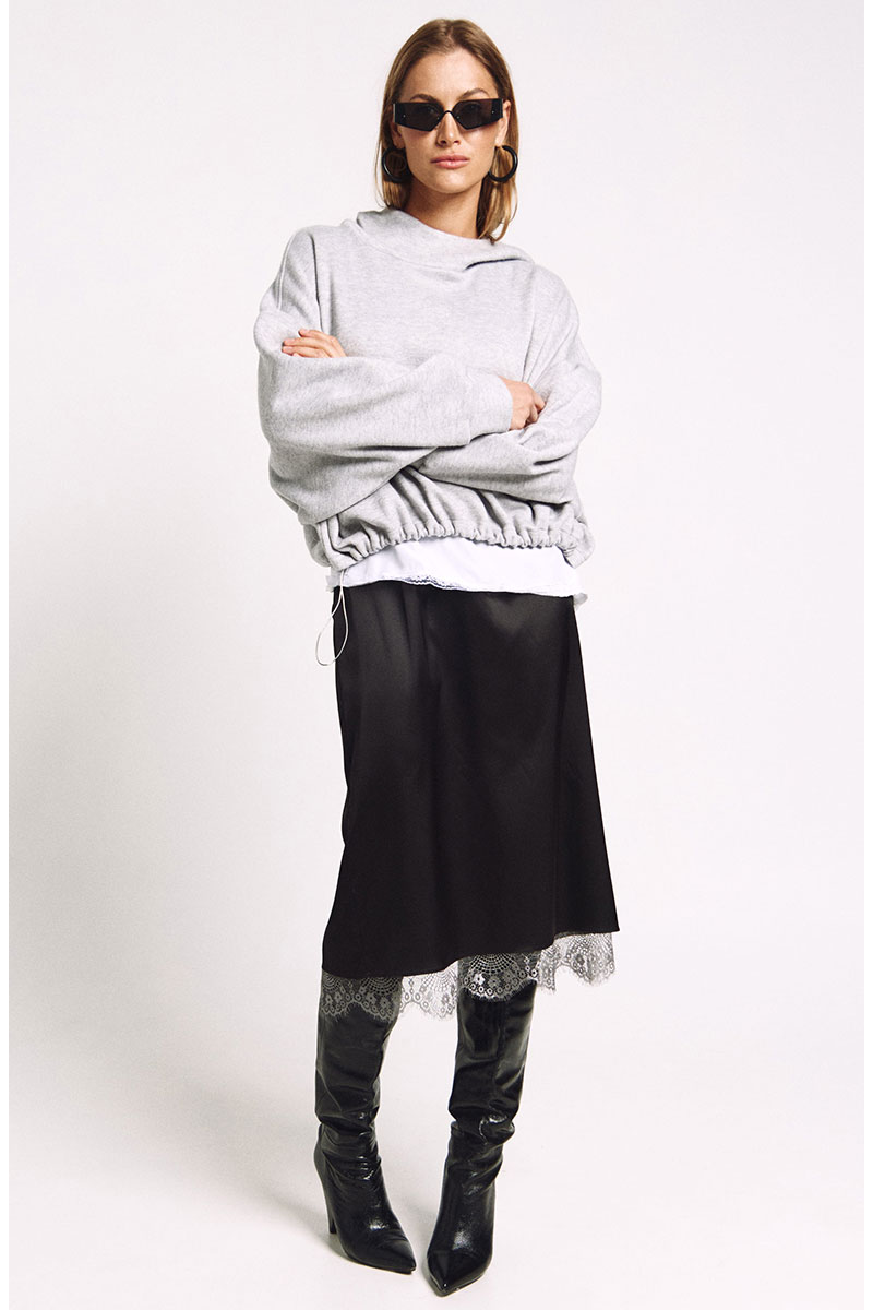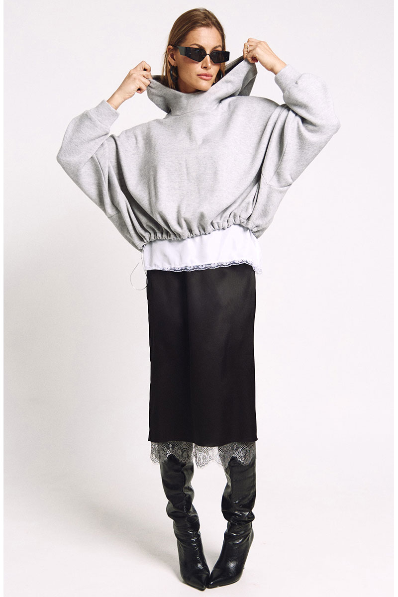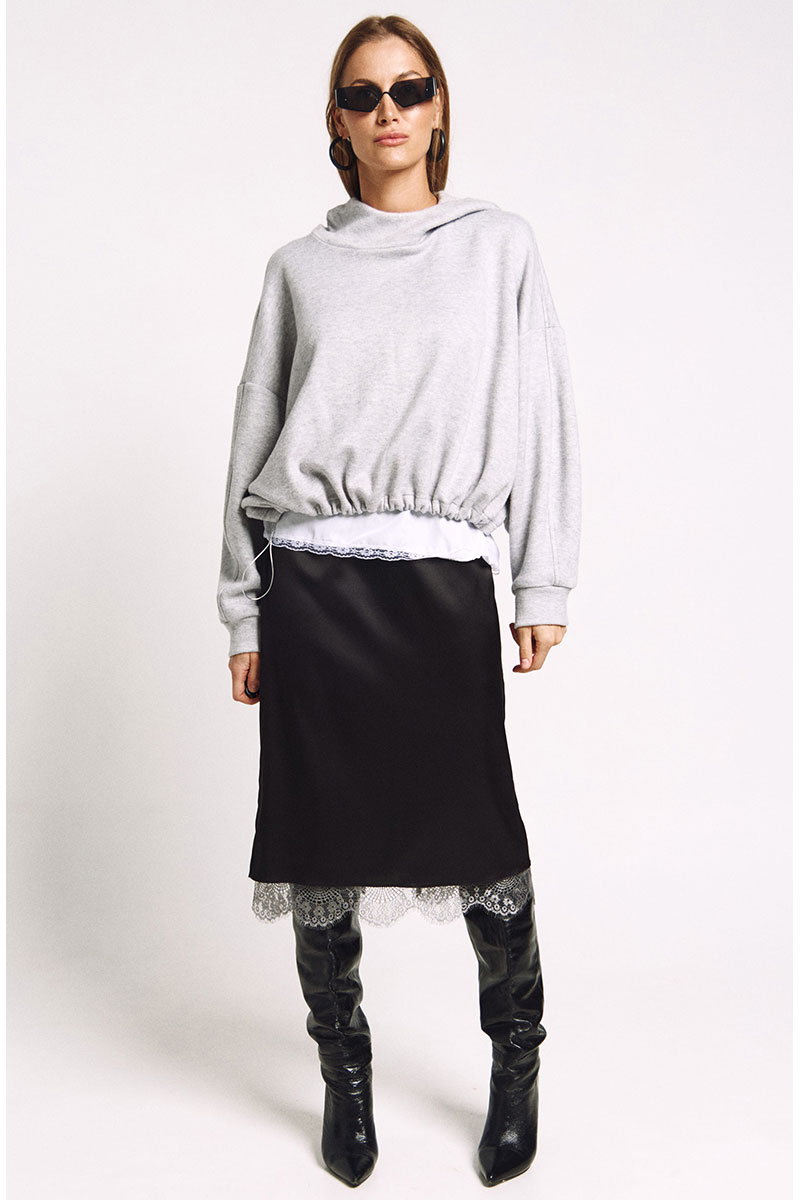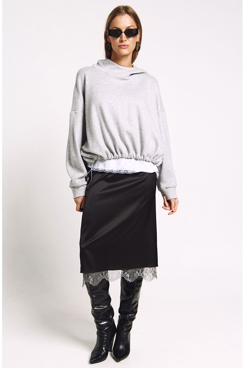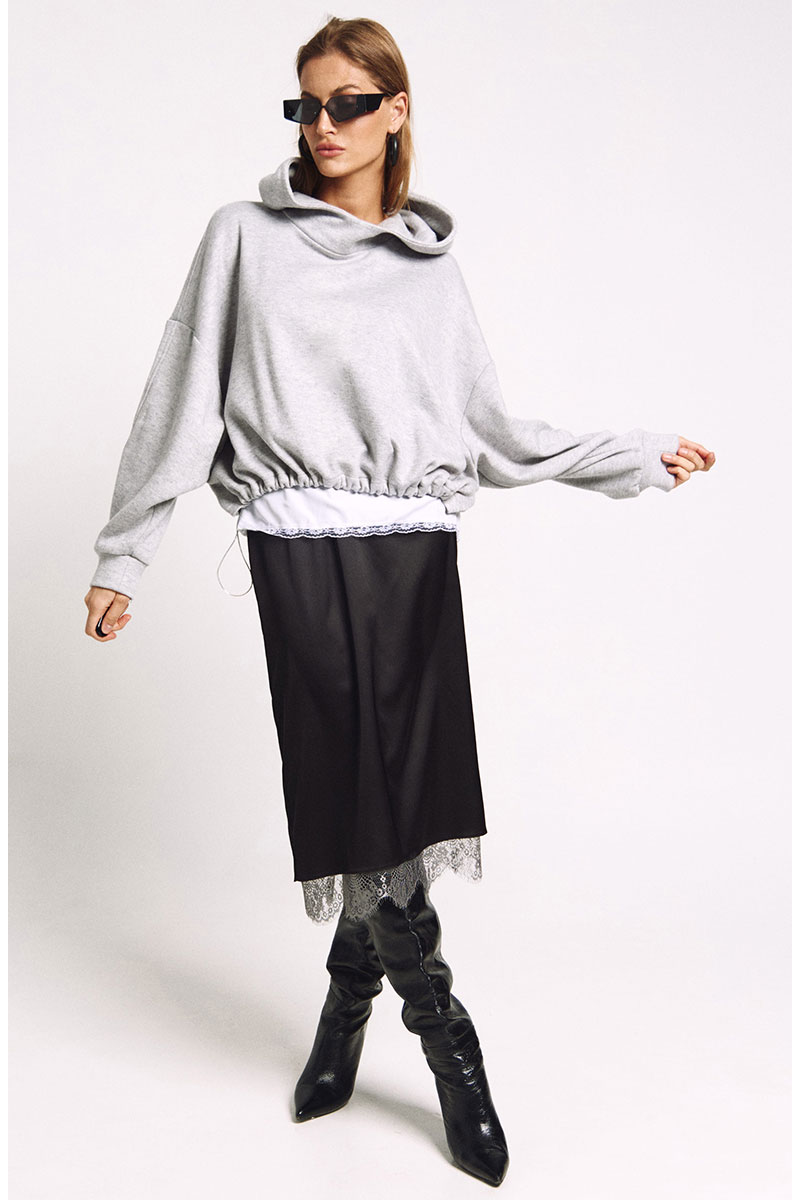 Юбка прямого силуэта на подкладке, к низу подкладки притачано французское кружево в цвете "графит". Сзади юбки - высокий разрез.