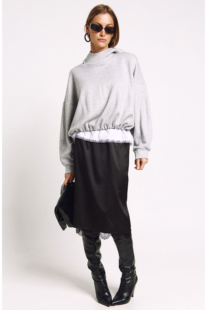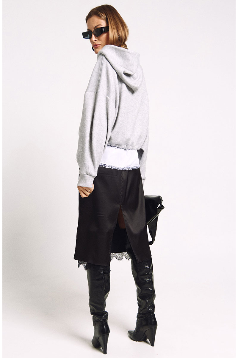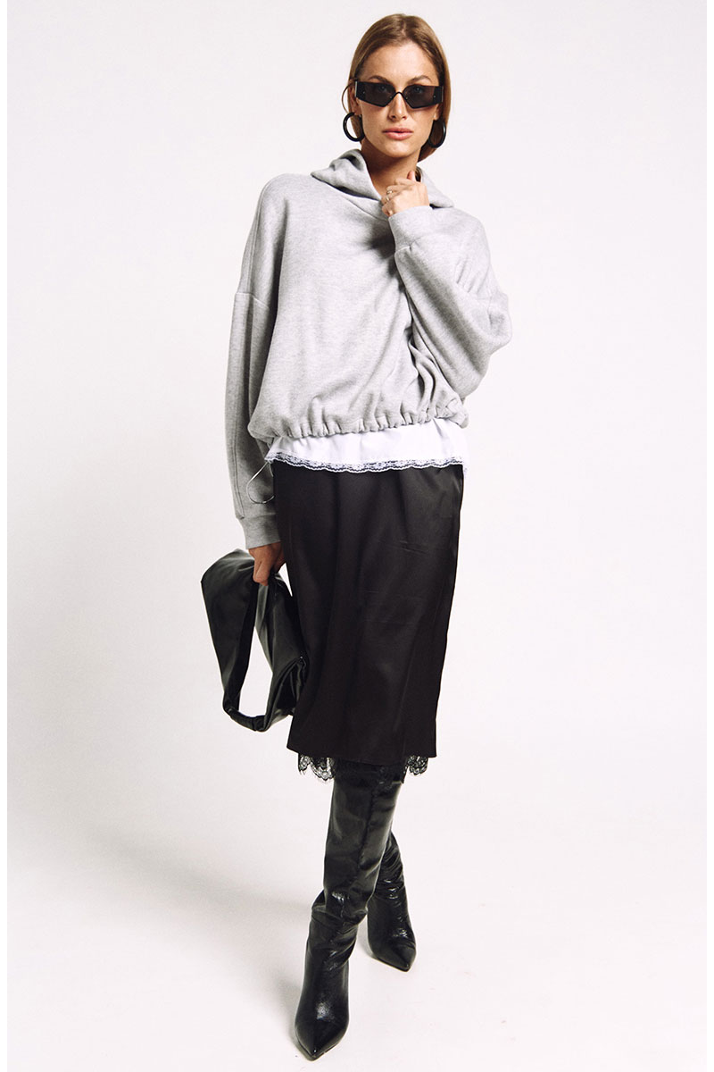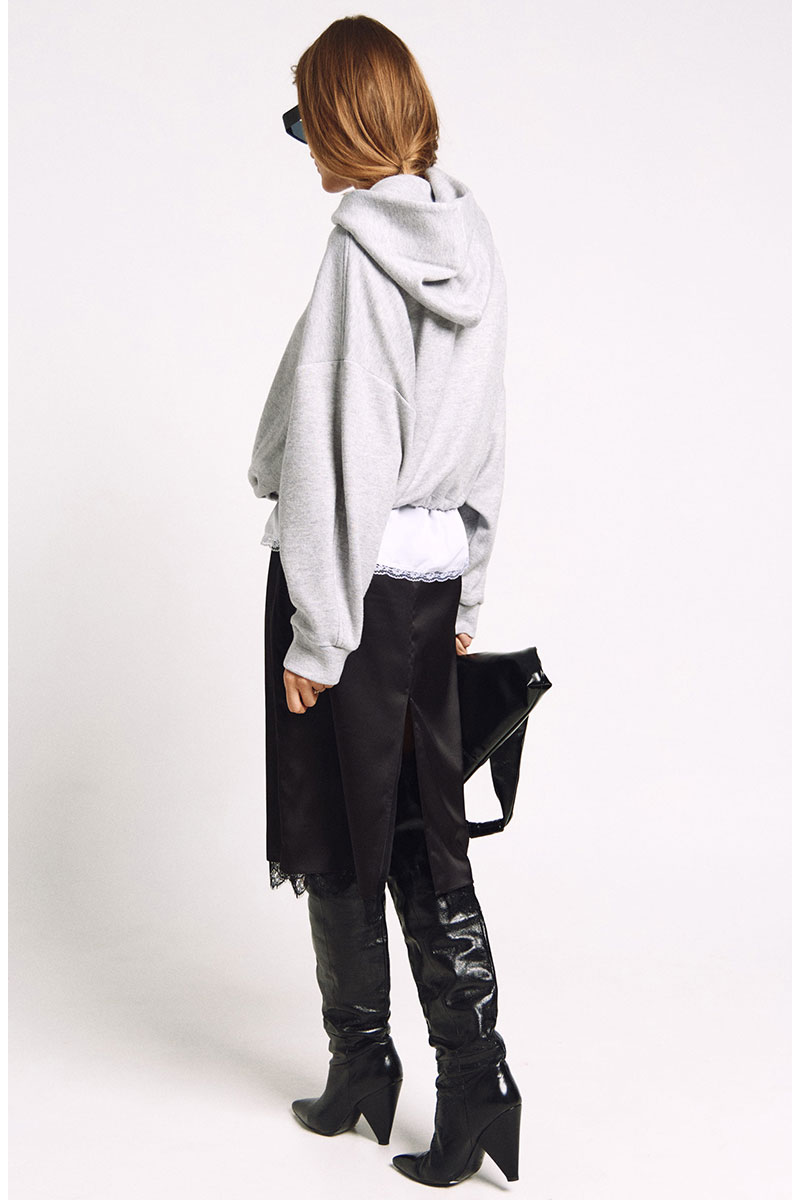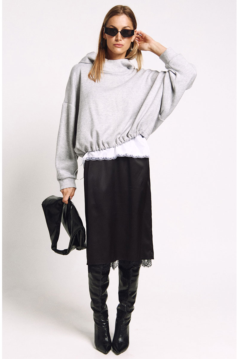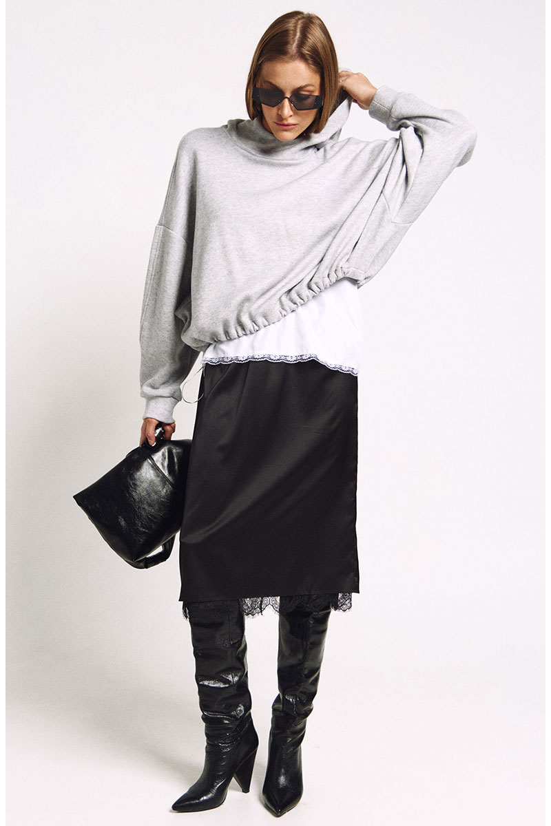 Юбка прямого силуэта на подкладке, к низу подкладки притачано французское кружево черного цвета. Сзади юбки - высокий разрез.