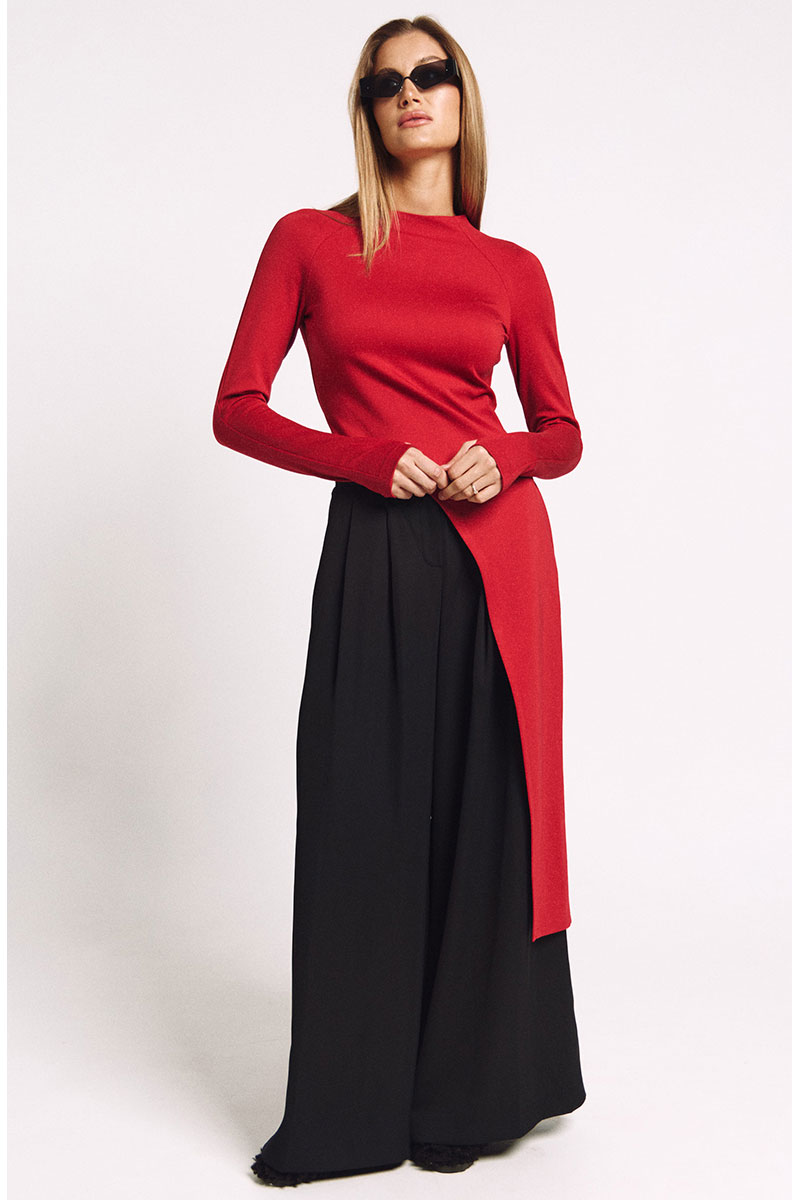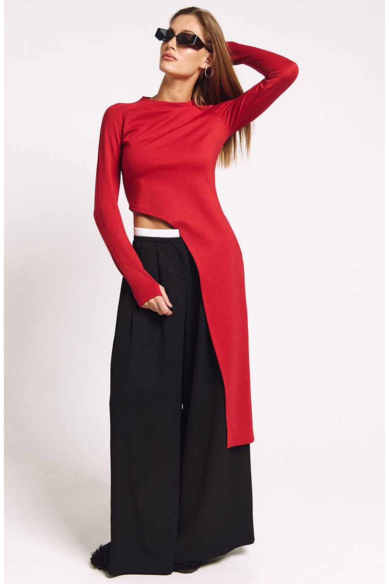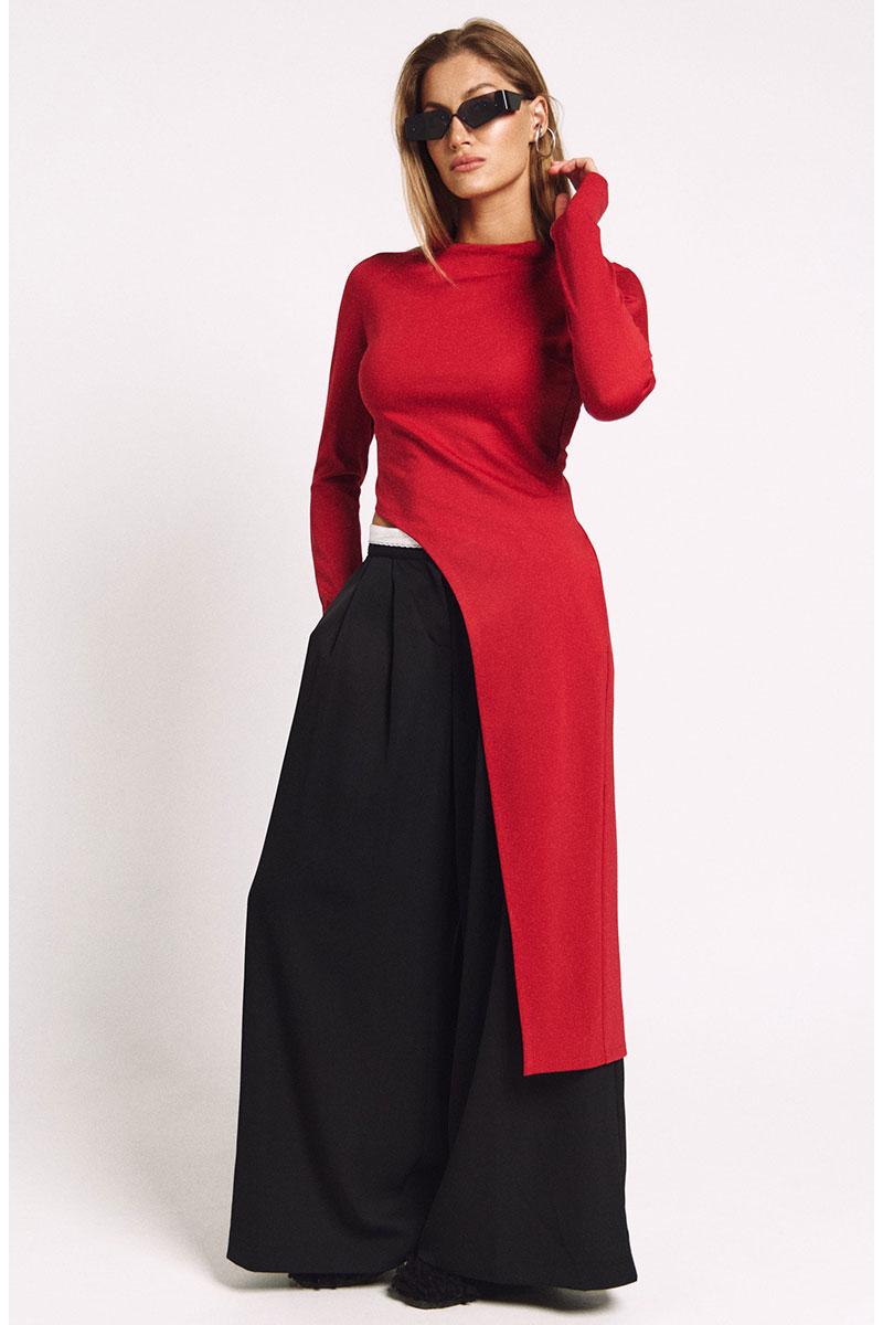 Брюки-палаццо из струящегося черного материала со складками по переду и декоративной лентой-поясом. Посадка средняя. Карманы в боковых швах.