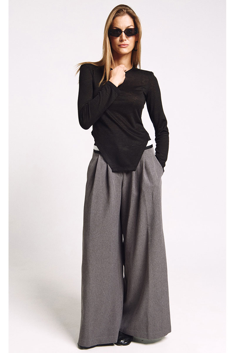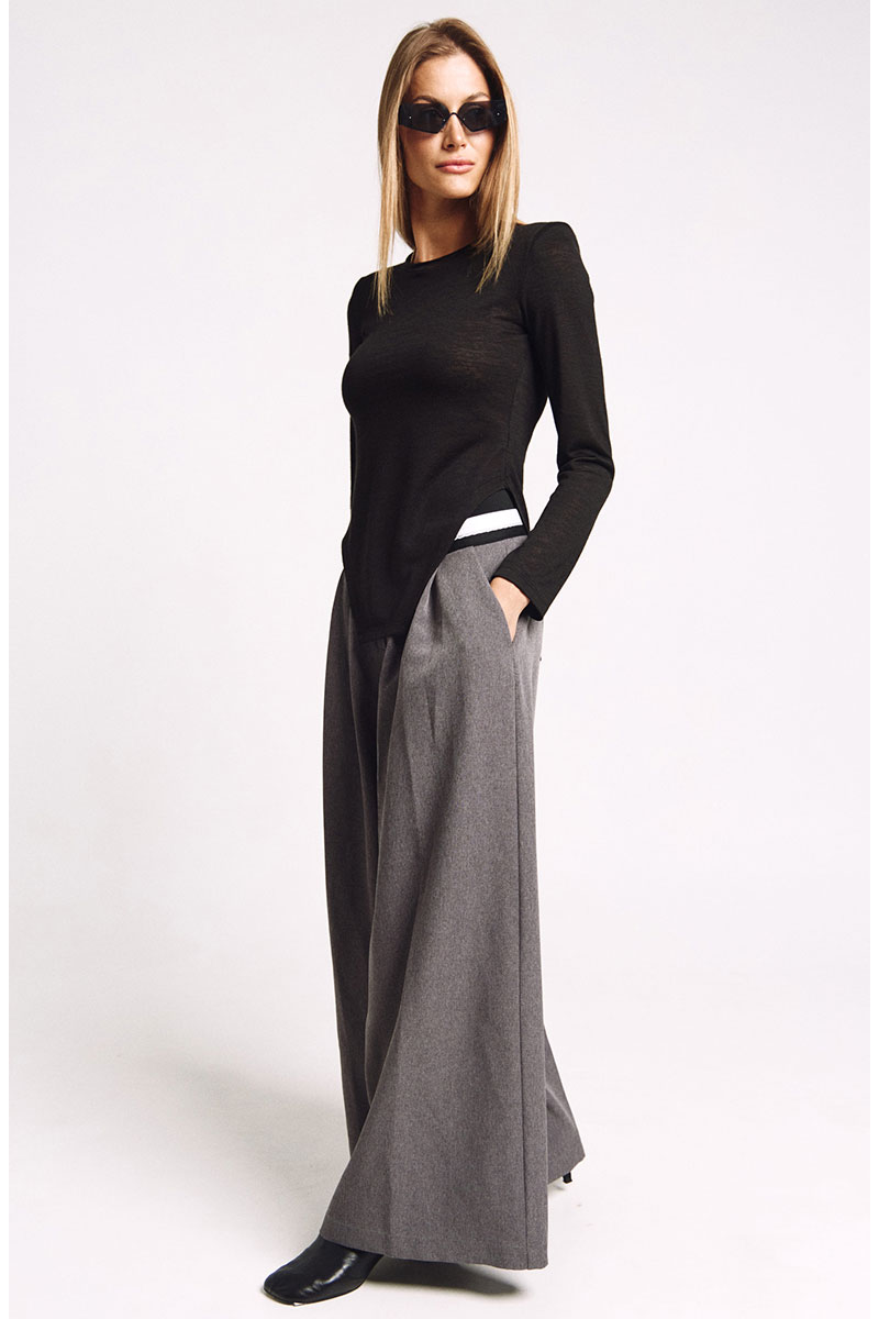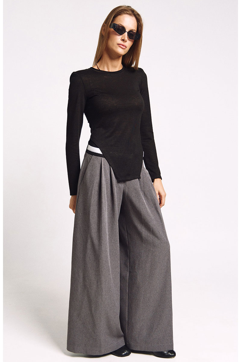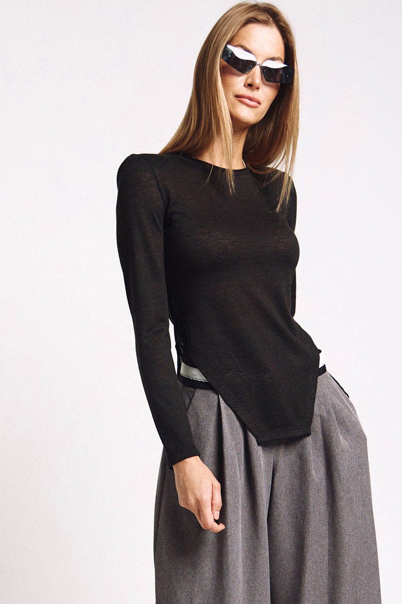 Лонгслив прилегающего силуэта с фигурной линией низа и вставными плечами. Фактурный трикотаж.