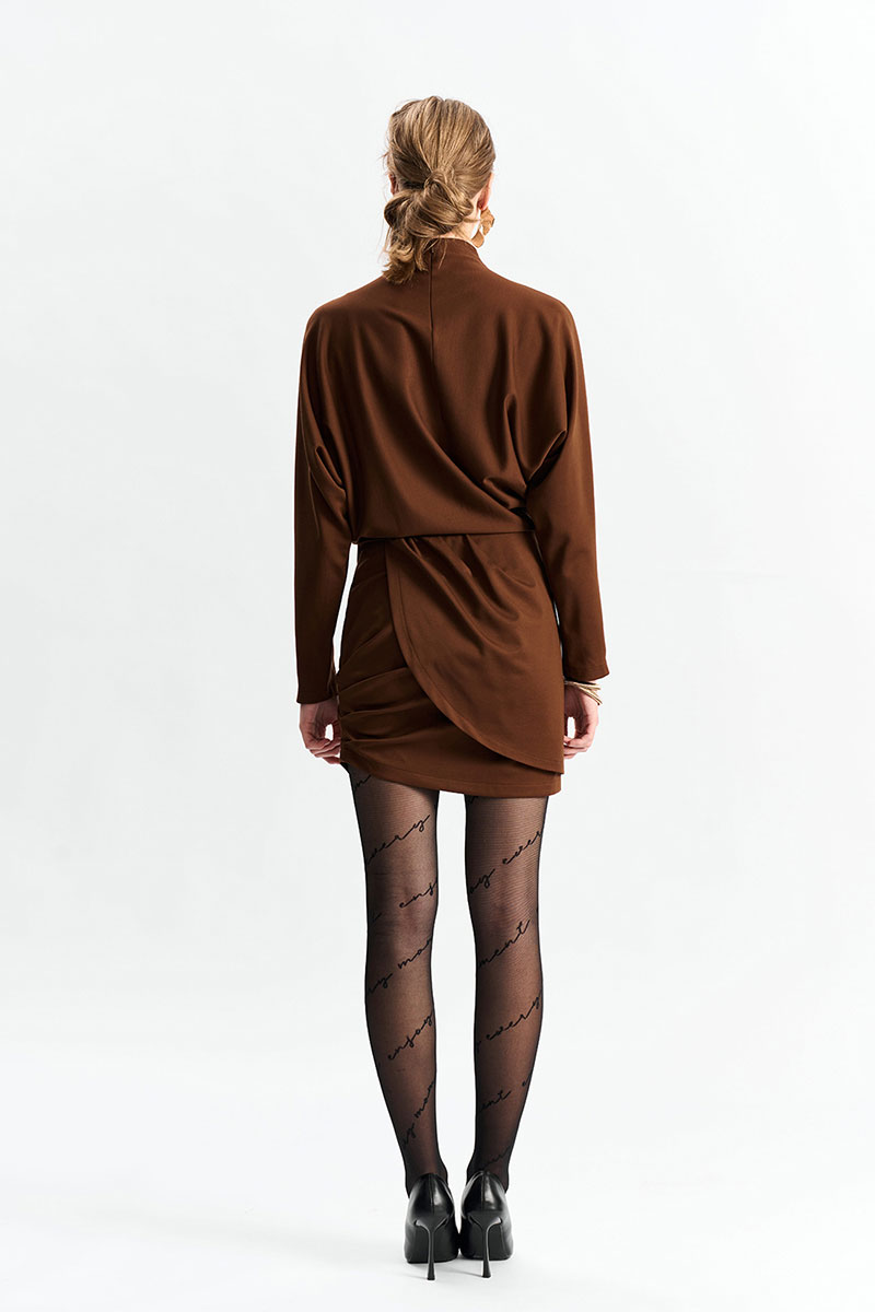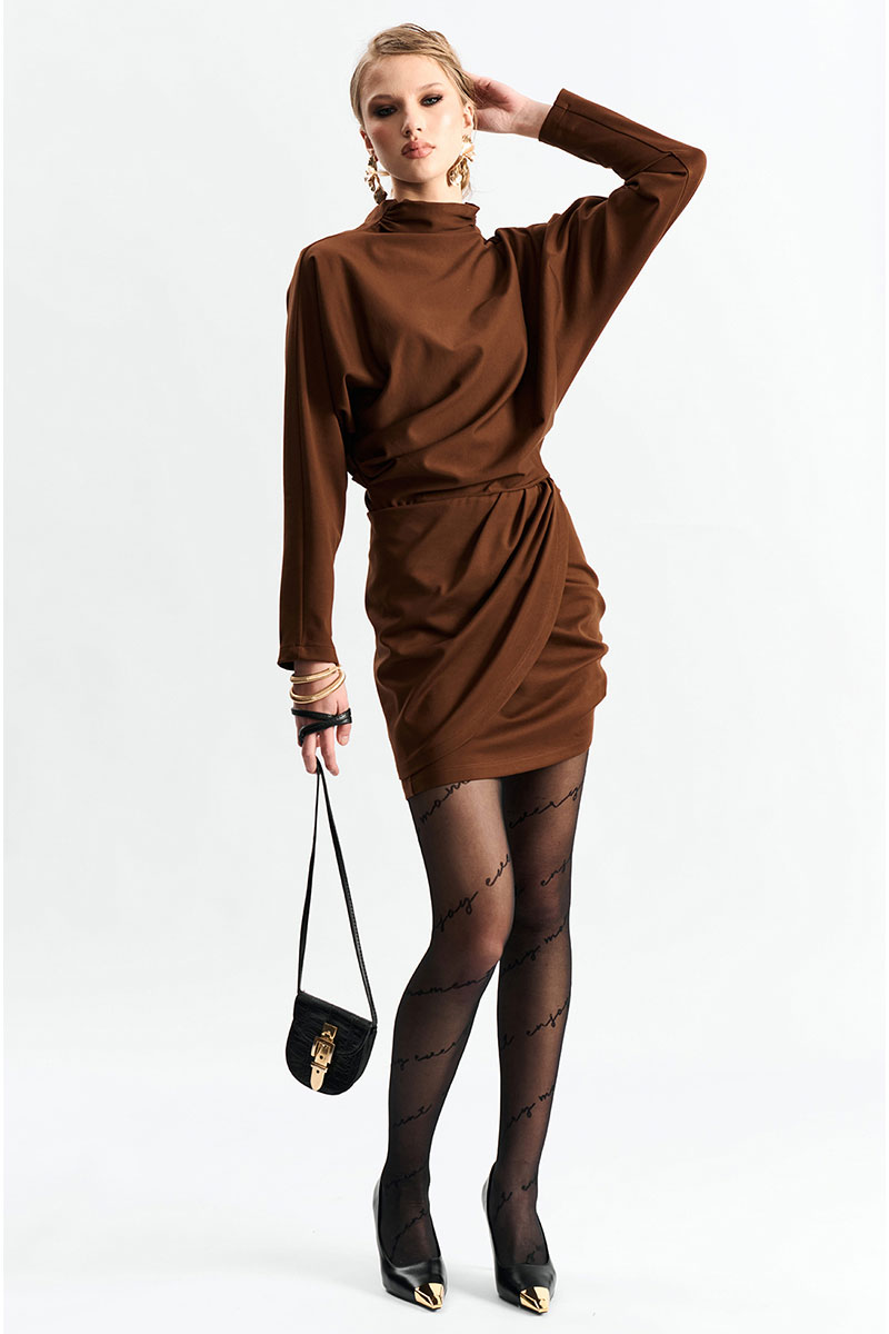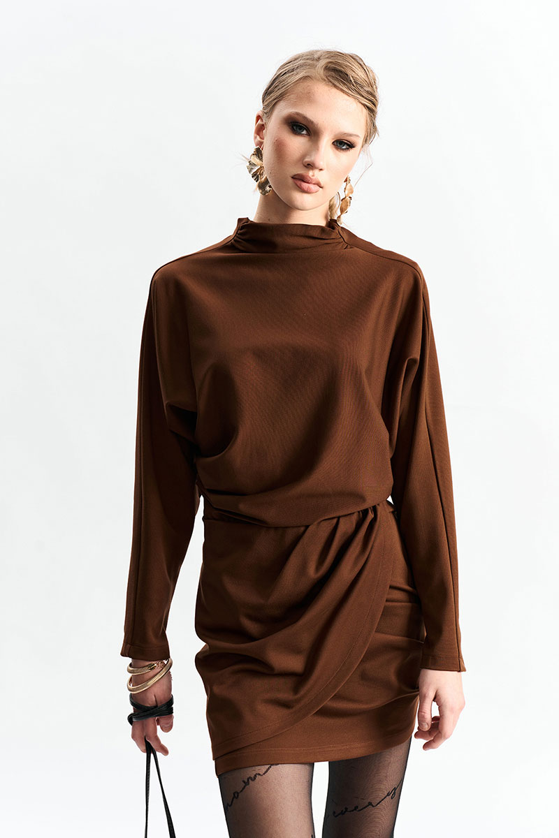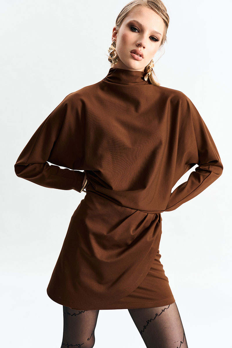 Платье длиной мини, отрезное по линии талии, с цельнокроеным рукавом. Верхняя часть платья объемная, нижняя часть прилегающего силуэта. По линии талии в шов притачивания вставлена эластичная лента. Рукав длинный, зауженный к низу.