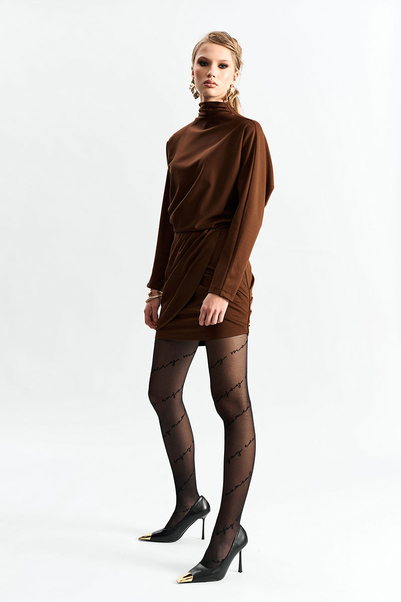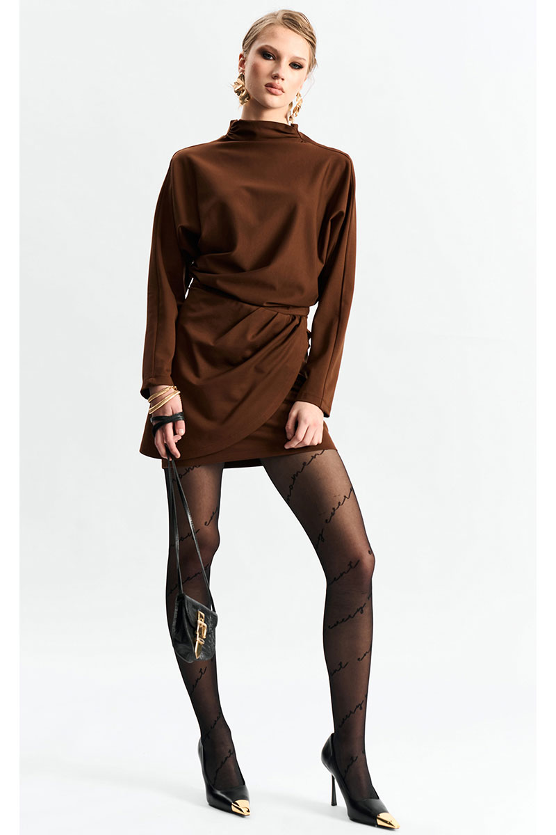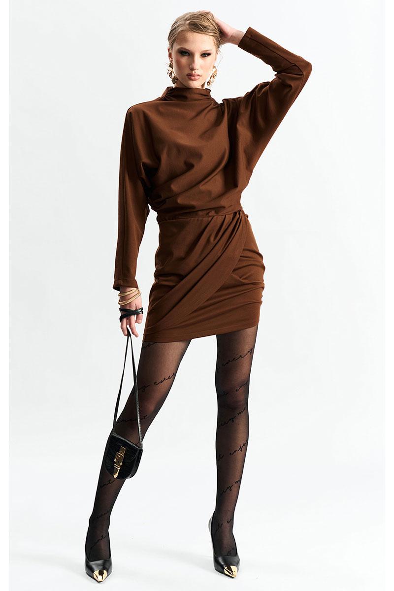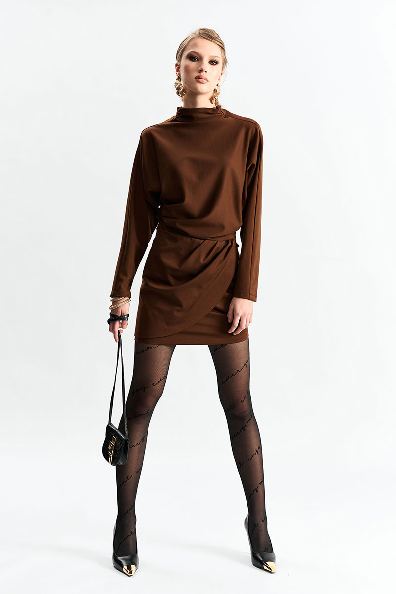Платье длиной мини, отрезное по линии талии, с цельнокроеным рукавом. Верхняя часть платья объемная, нижняя часть прилегающего силуэта. По линии талии в шов притачивания вставлена эластичная лента. Рукав длинный, зауженный к низу.