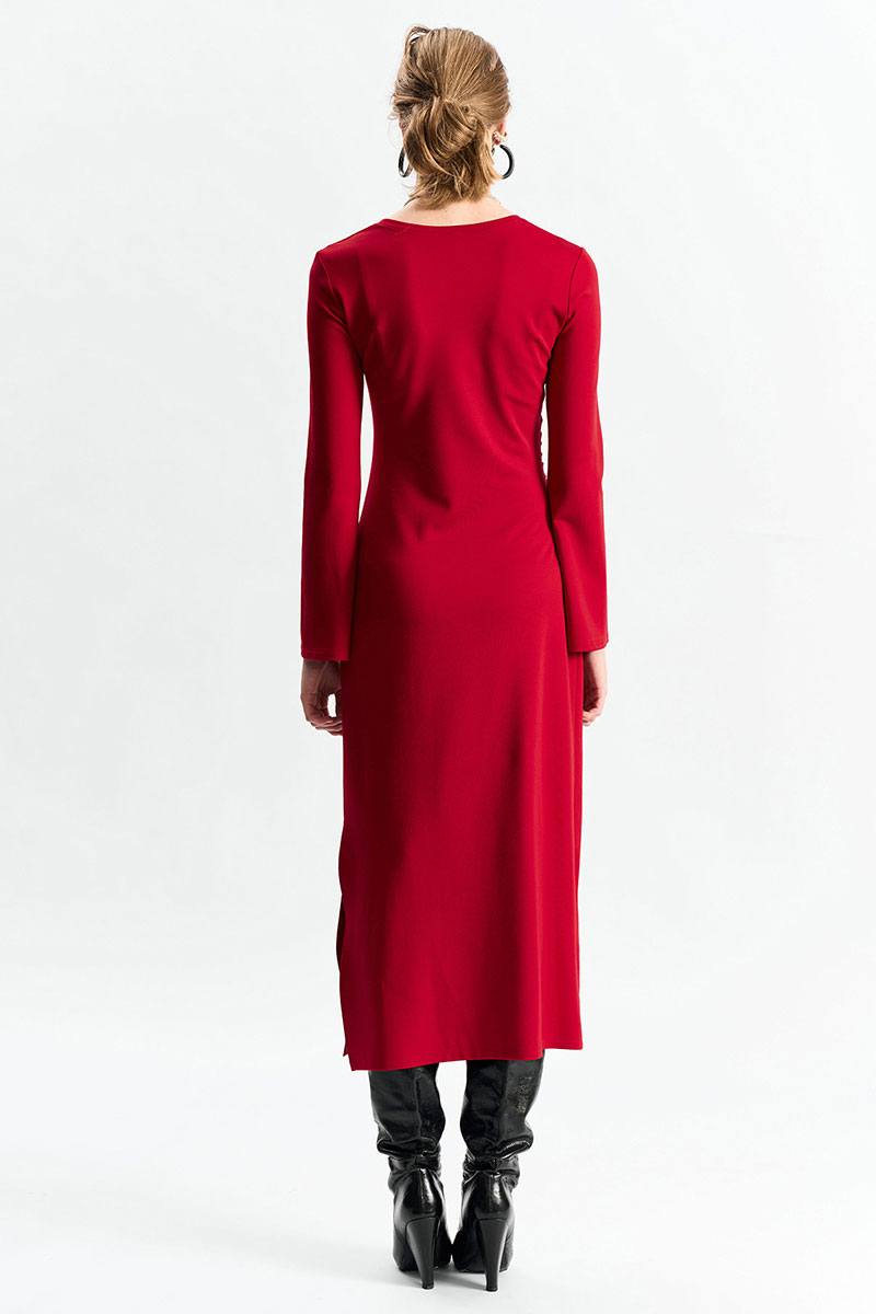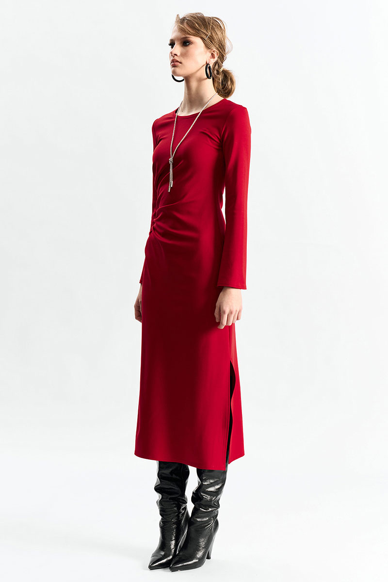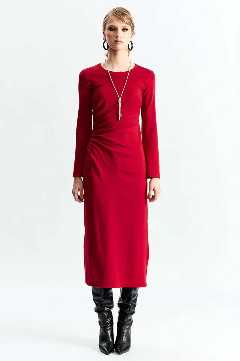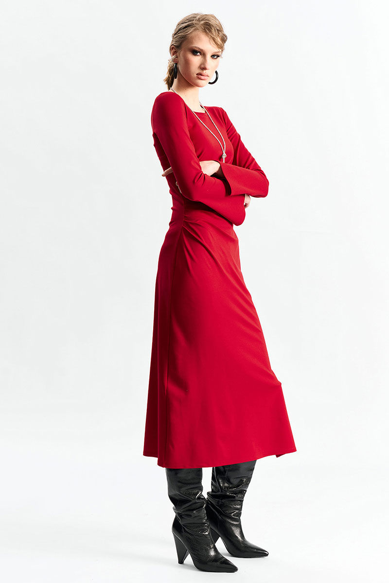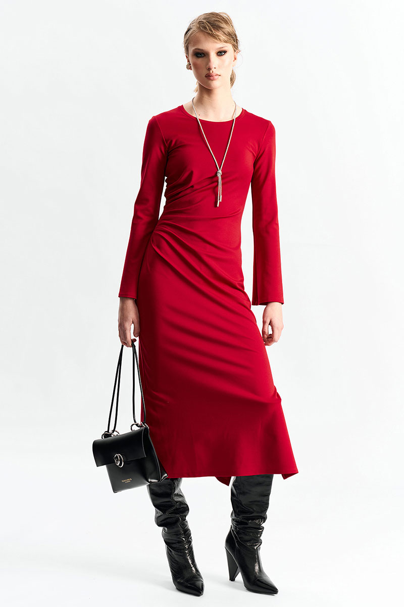 Платье из эластичного материала, прилегающего по талии силуэта, со сборкой в области талии. Юбка А-образного силуэта. Рукав расширяется книзу. Платье без застежки.