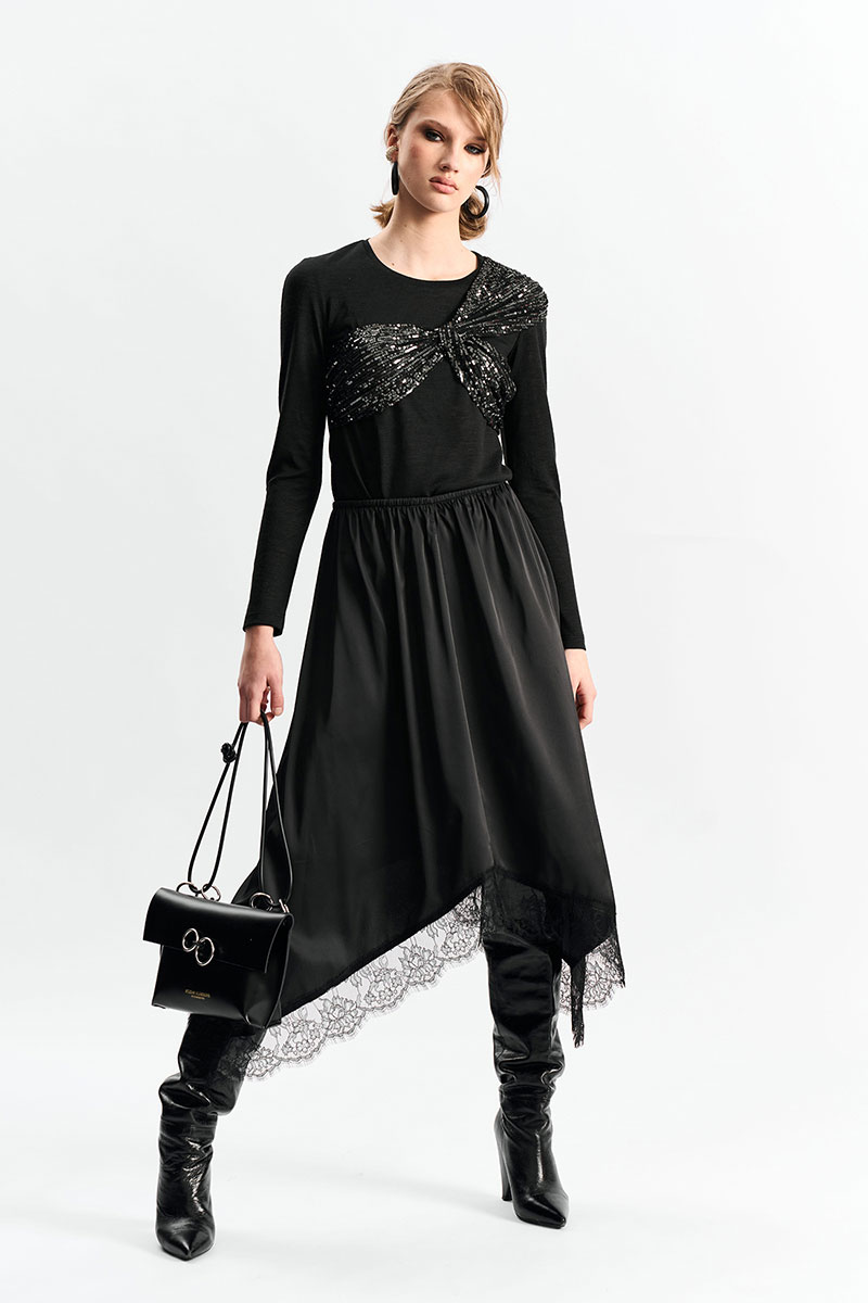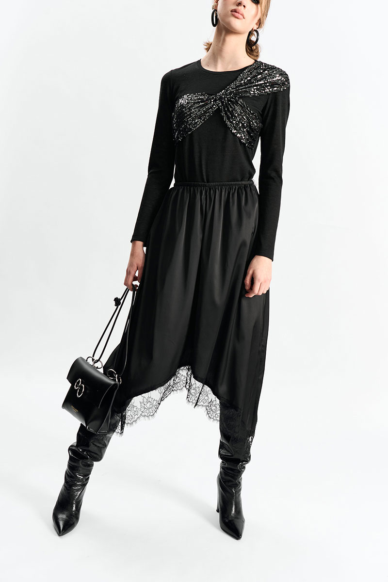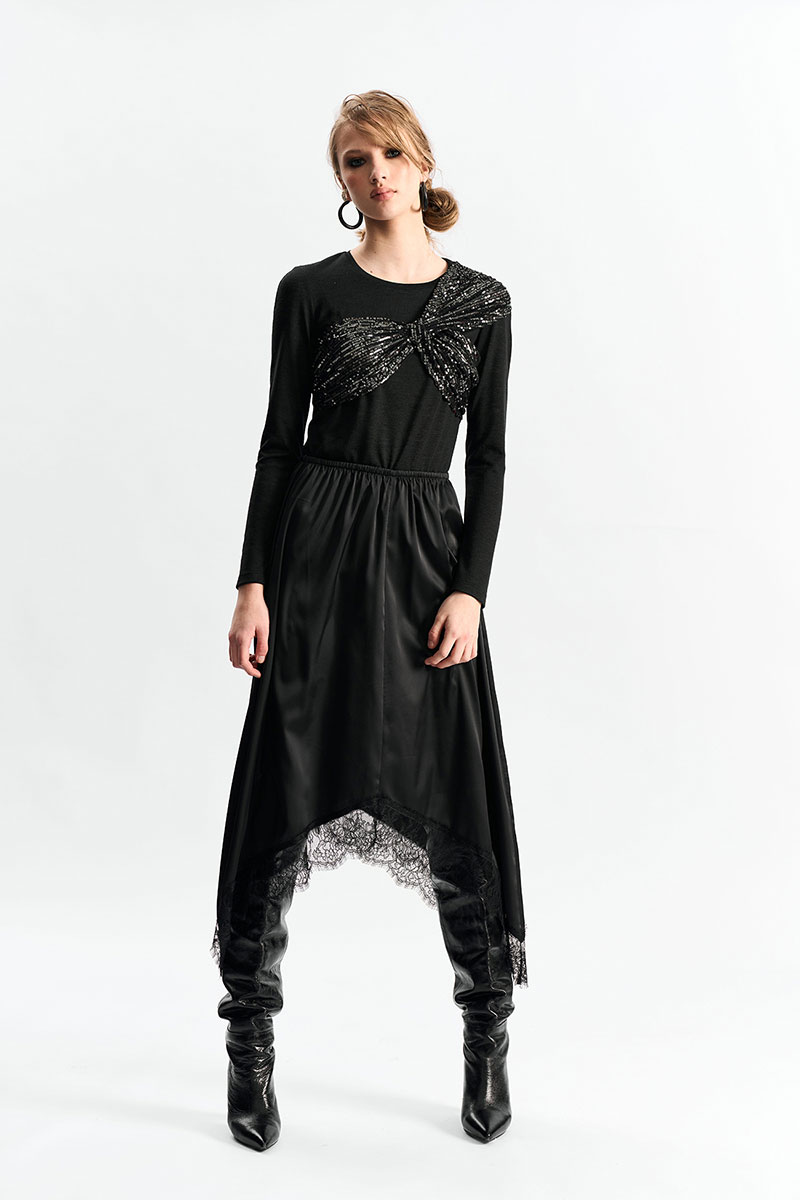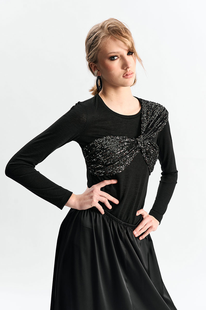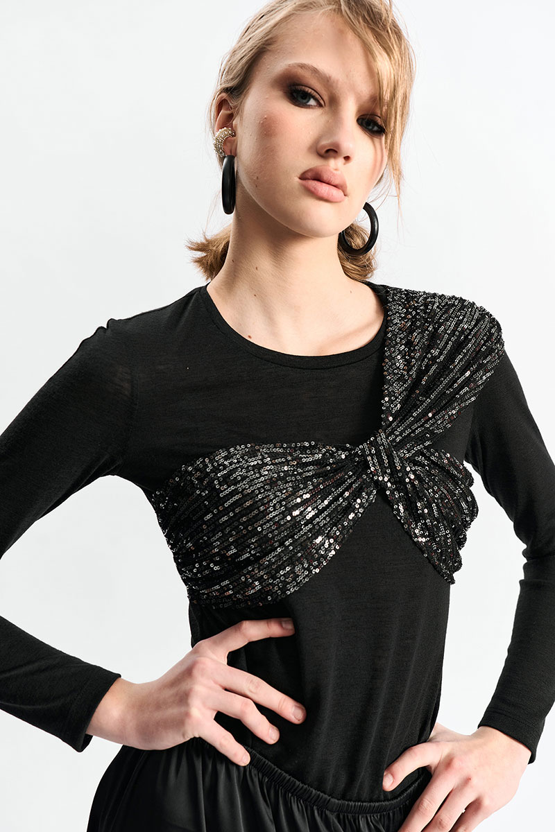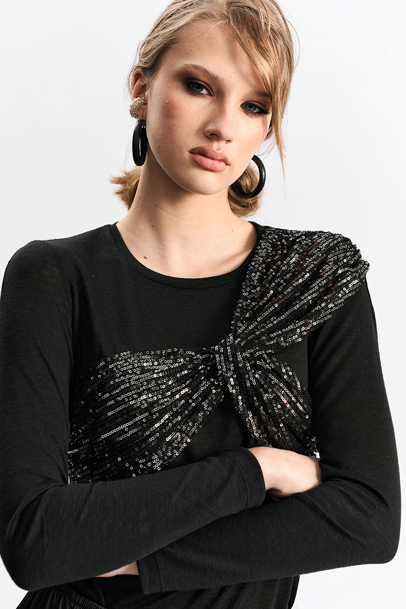 Джемпер прилегающего силуэта из эластичного трикотажа. Декоративный бант-лиф из пайеток, эластичный.