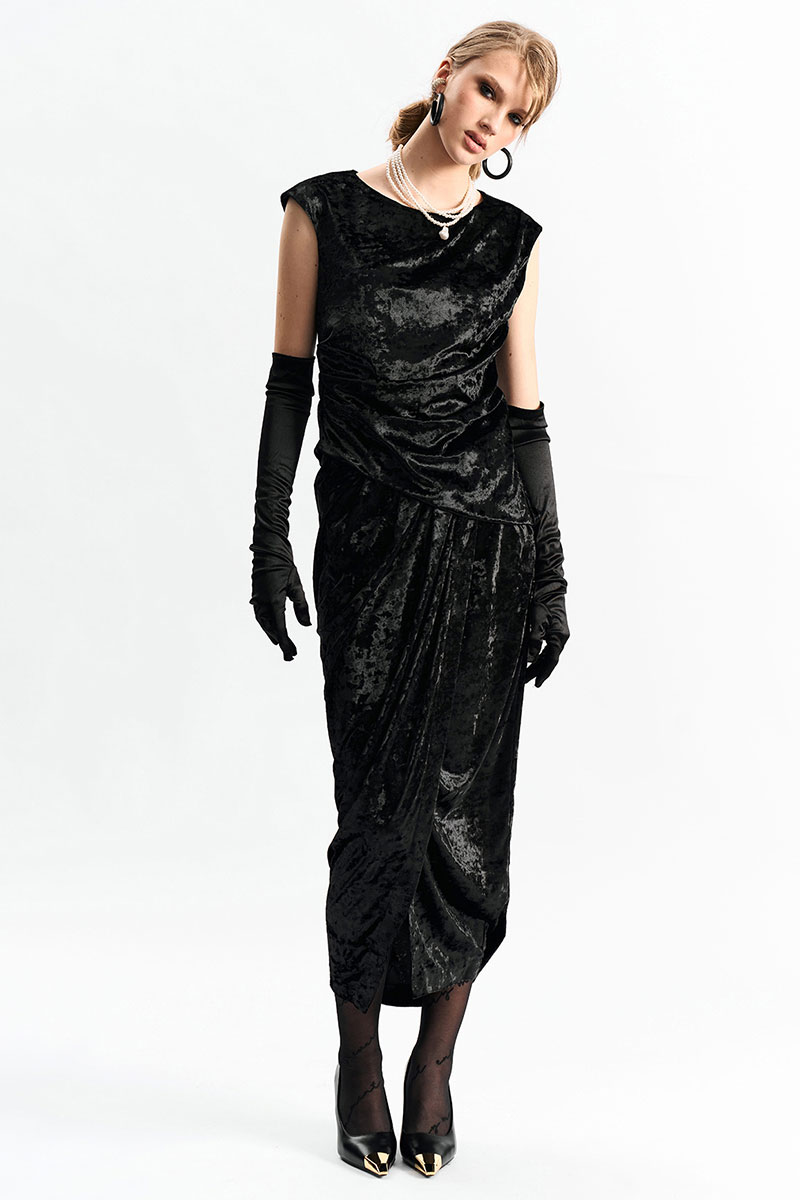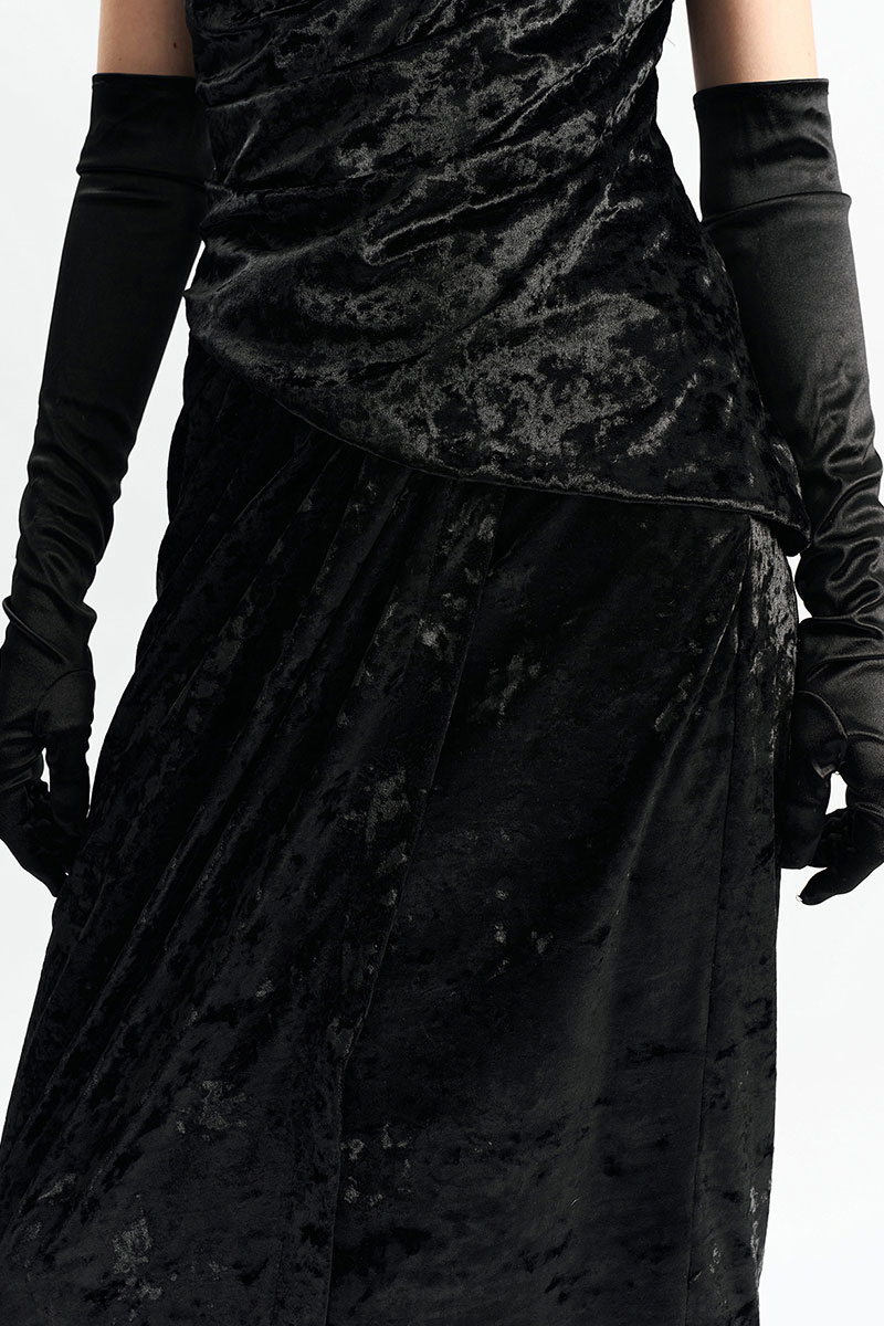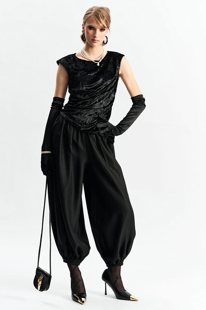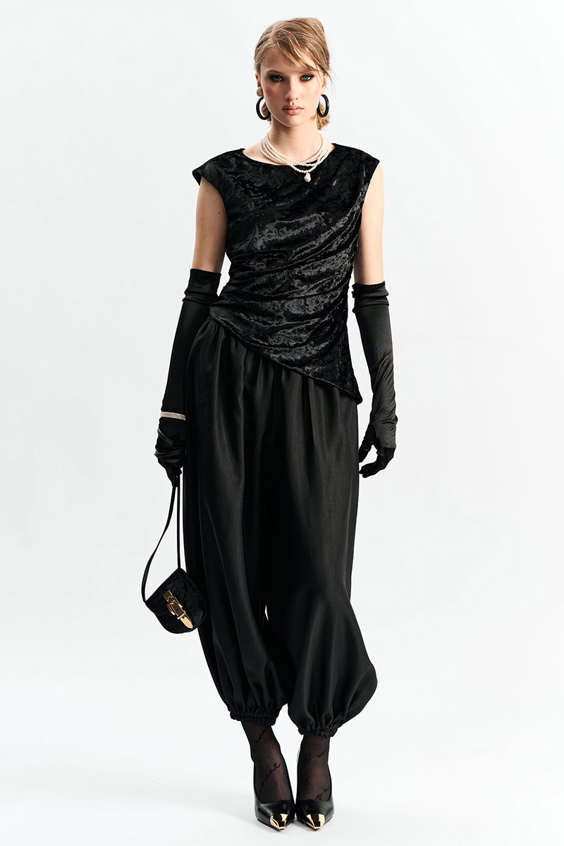 Блуза прилегающего силуэта, из фактурного бархата. Со складками по талии. Застежка-молния в боковом шве. Блуза на подкладке.