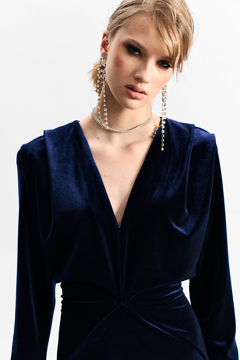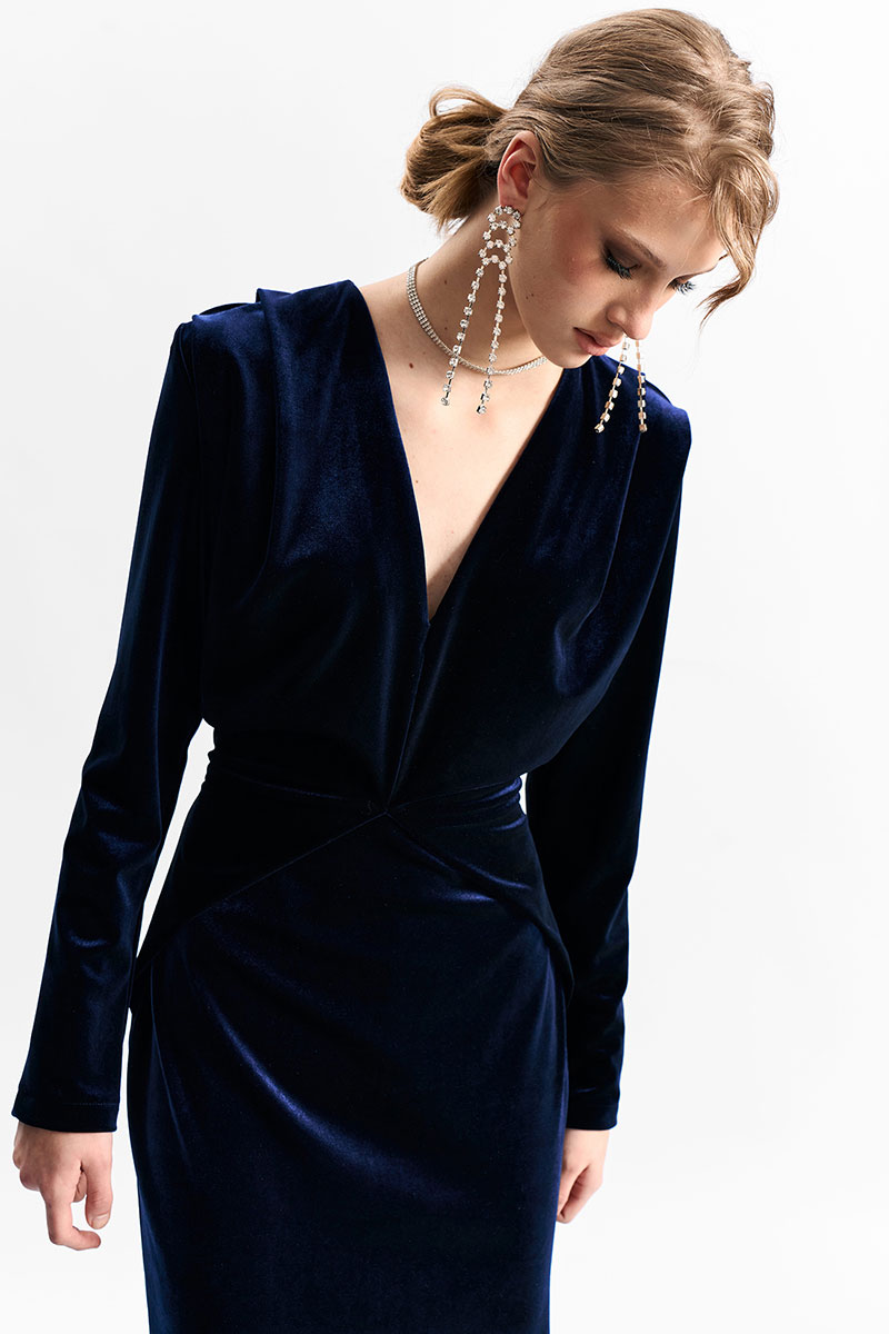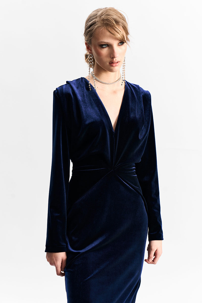 Платье из плотного бархата глубокого темно-синего цвета с акцентными складками на плечах и по талии.