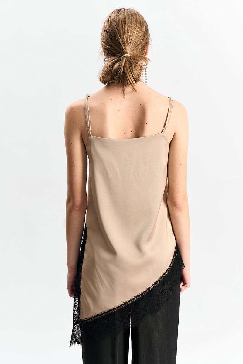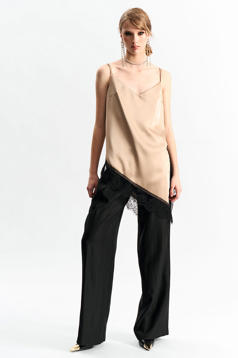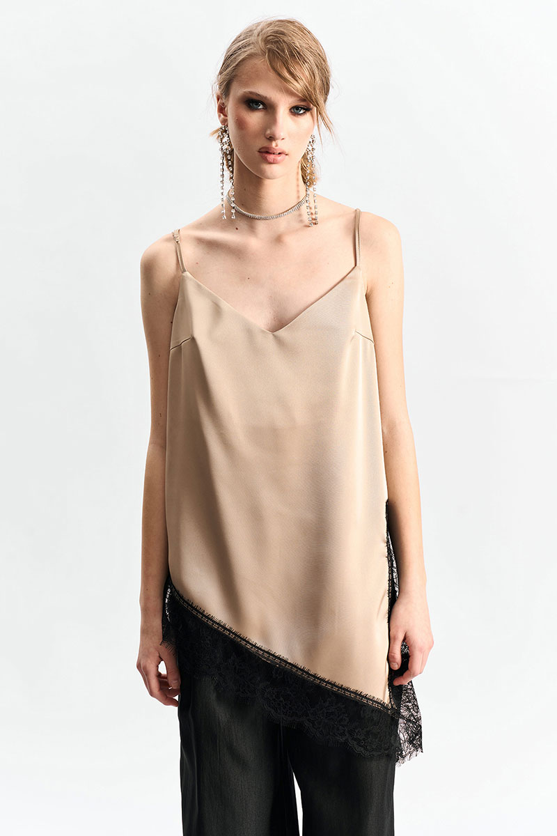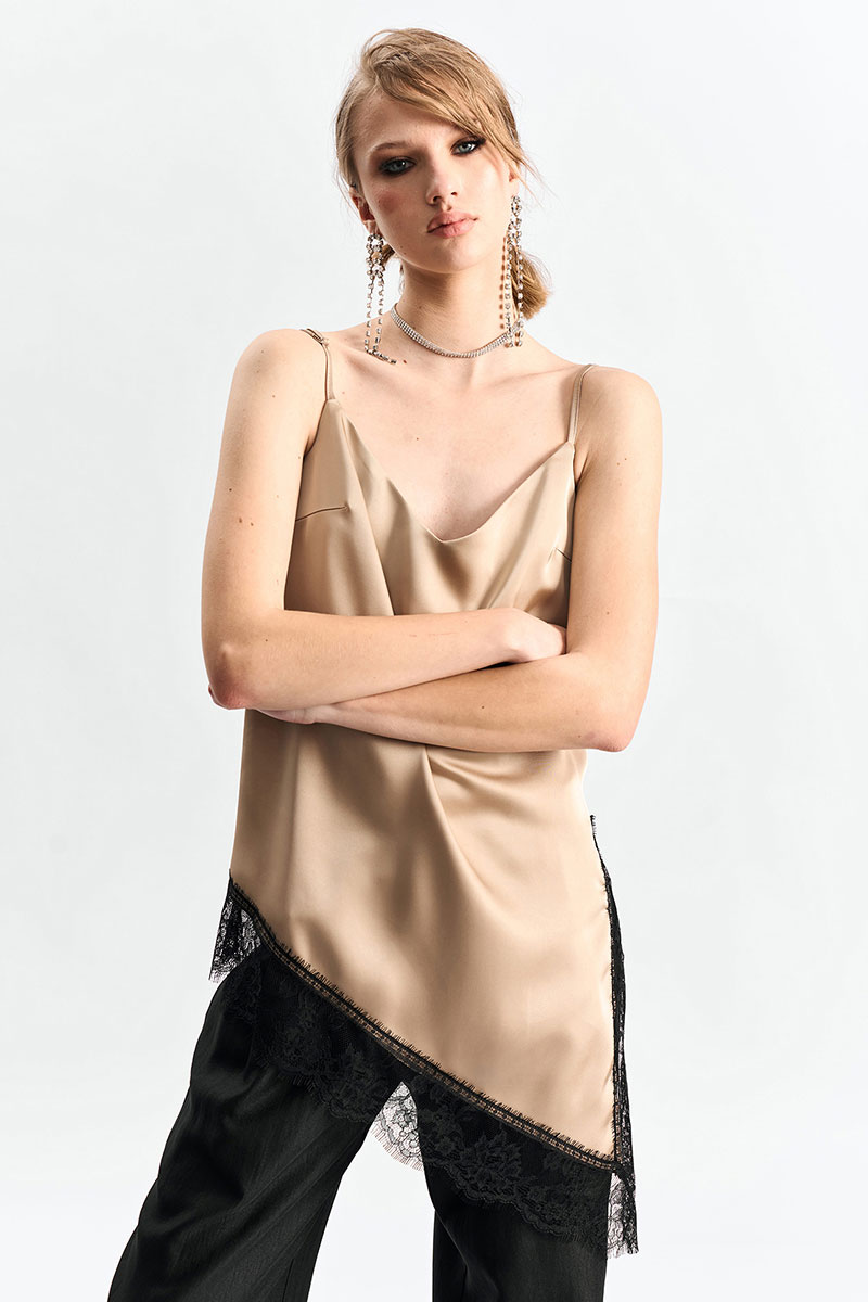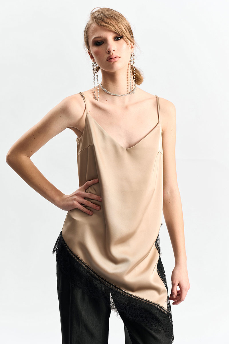 Удлиненная топ-комбинация из плотного двустороннего сатина золотого цвета. Асимметричный низ и разрез по боку. По низу - французское кружево.