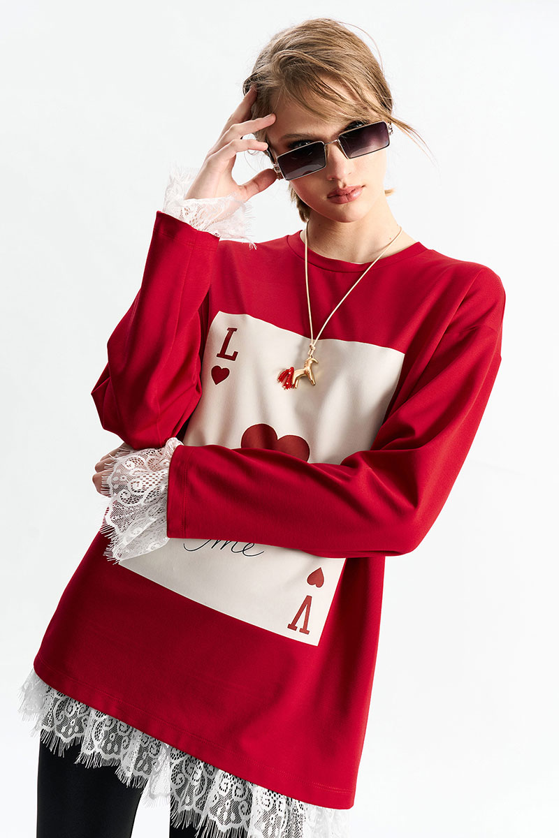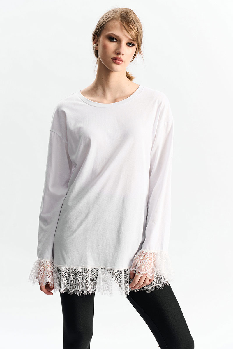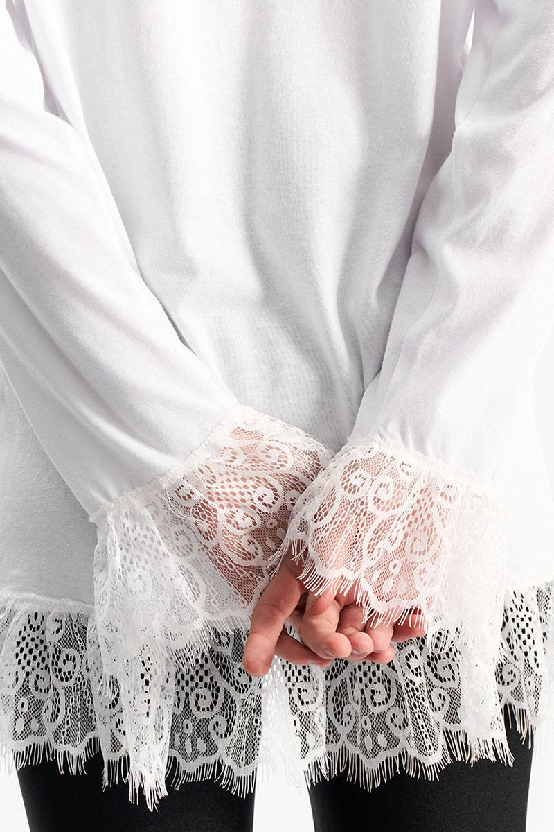 Удлиненный лонгслив из трикотажной вискозы, с французским молочным кружевом на сборке по низу рукава и низу изделия. Красивый нижний слой под лонгсливы, свитера, жакеты.